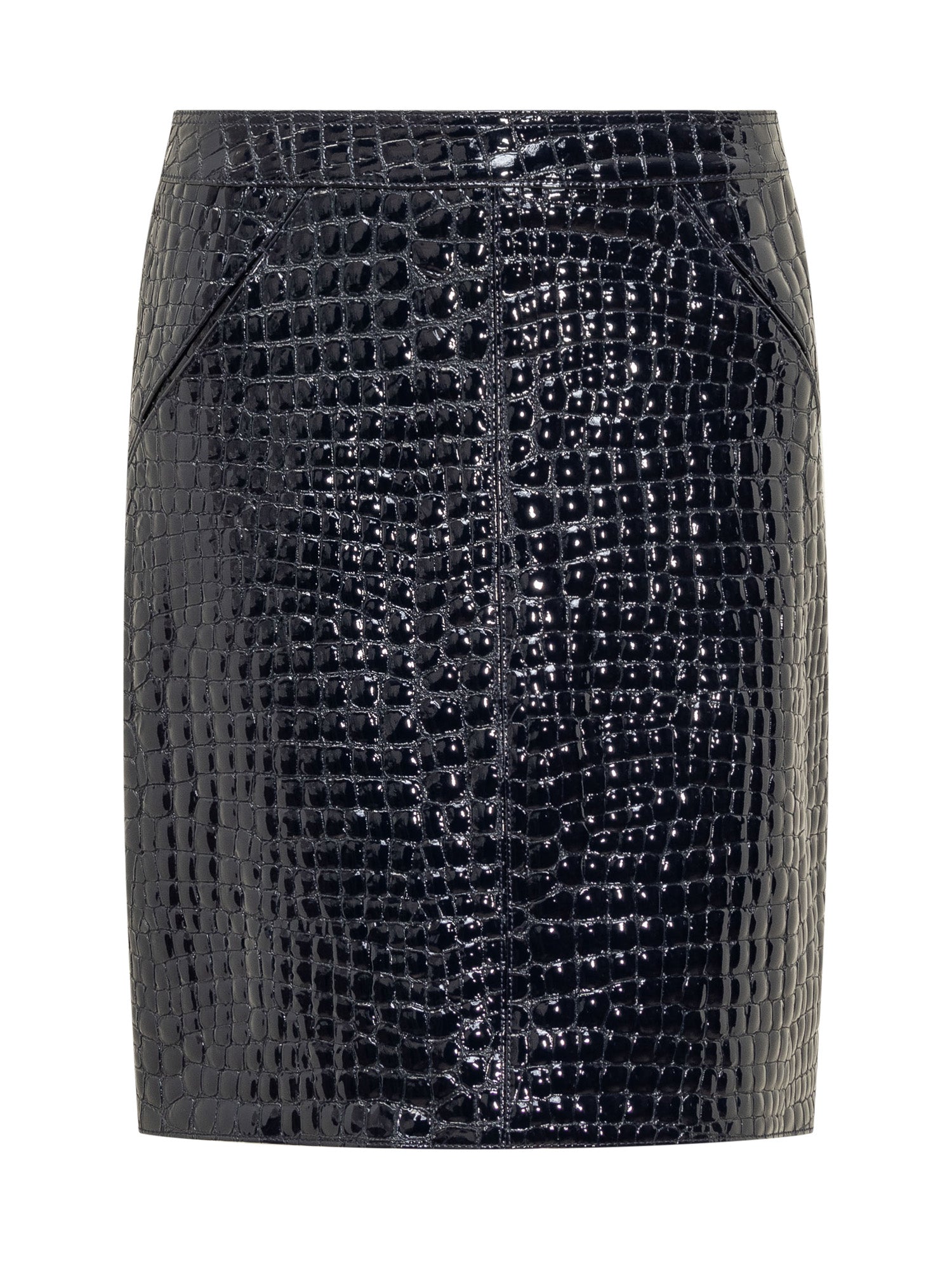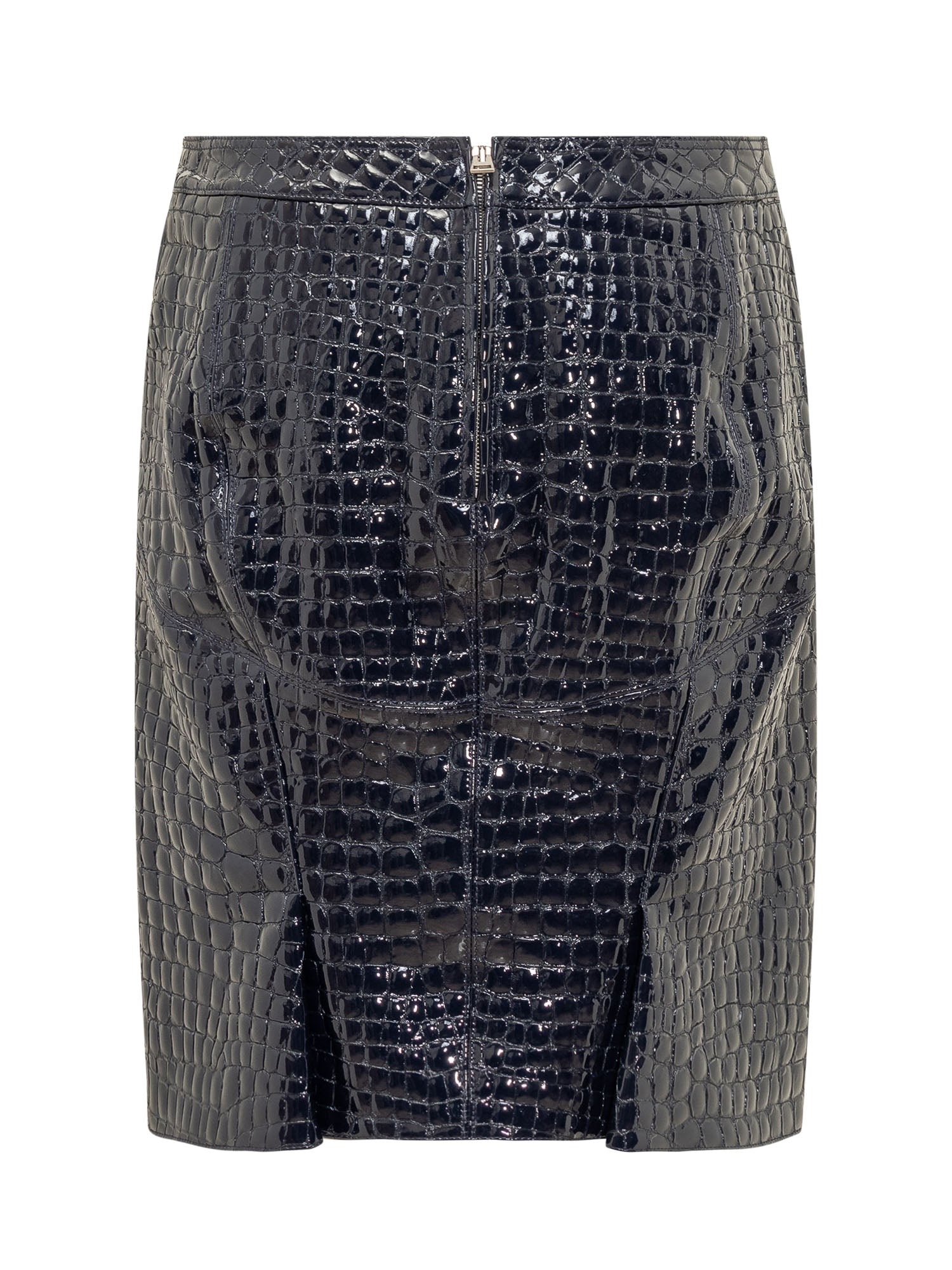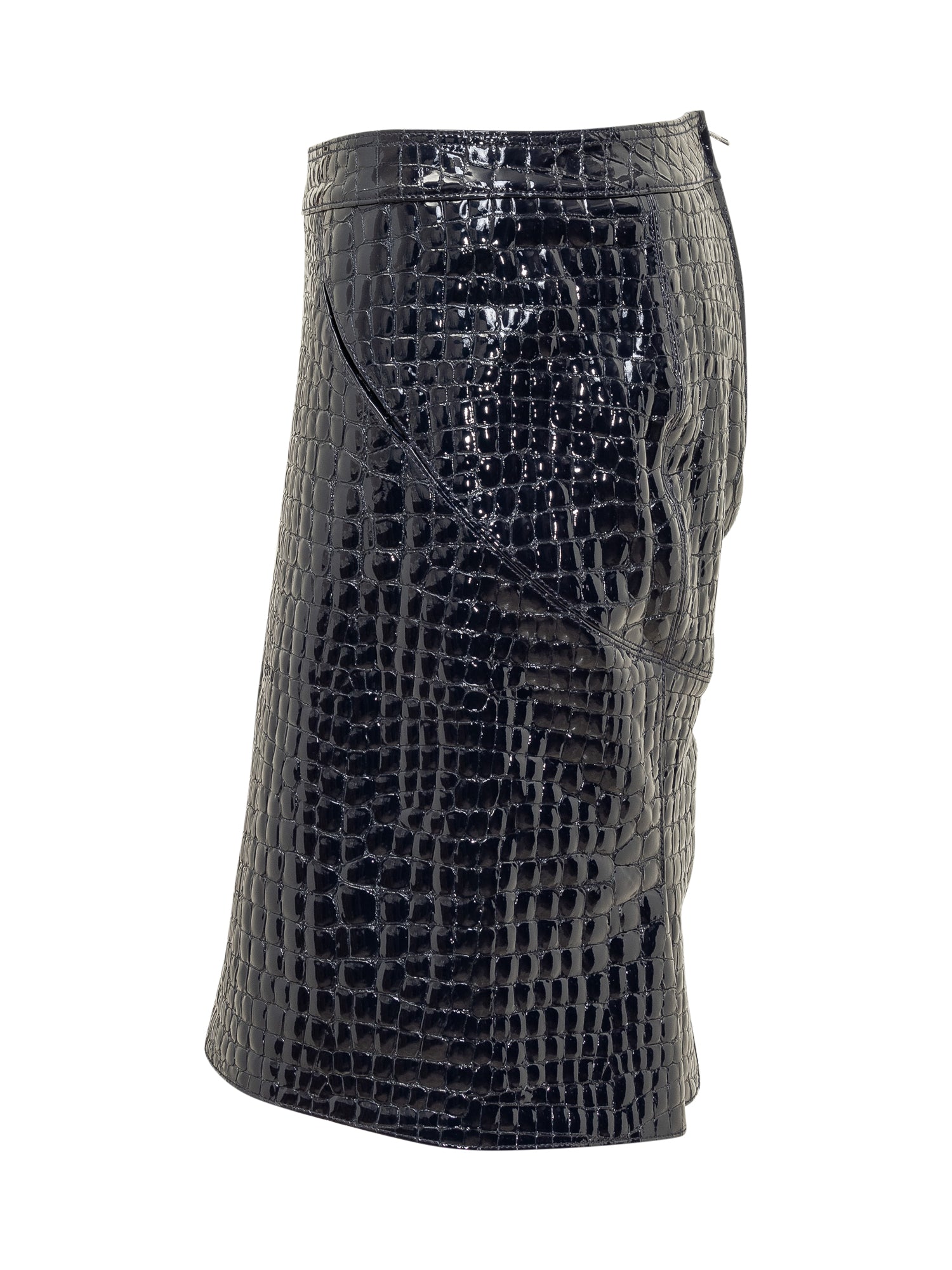 Gonna longuette in pelle di capra. Linea dritta. Chiusura con zip sul retro. Due tasche a filetto davanti. Orlo posteriore plissettato. Realizzata in pelle goffrata a coccodrillo. Foderata.