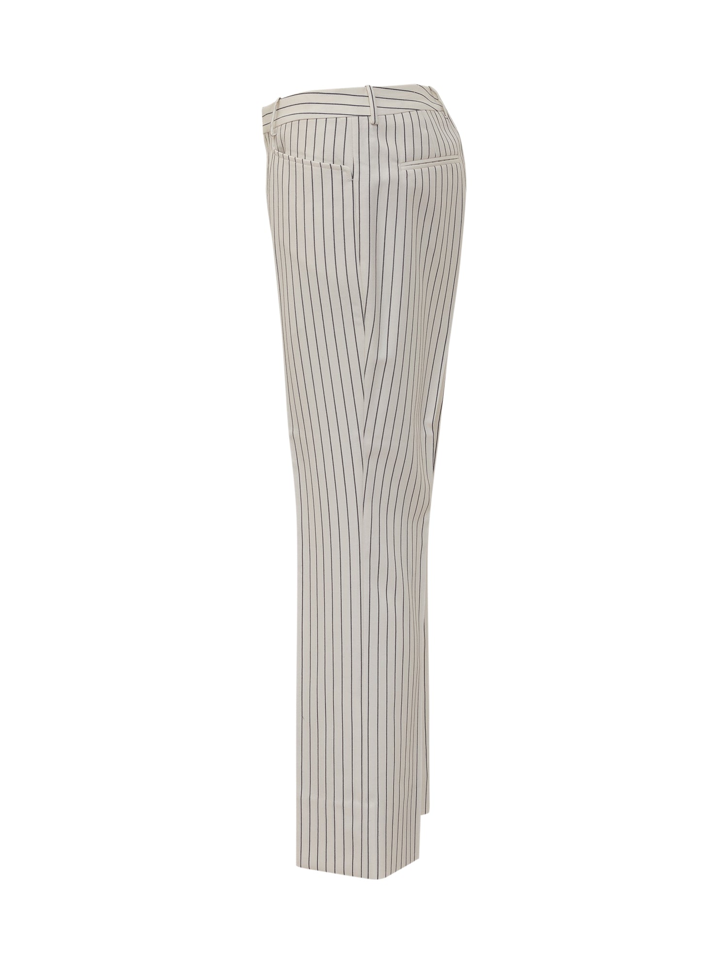 Pantaloni sartoriali. Vita alta. Piega stirata. Passanti per cintura. chiusura con bottone, gancio e zip. Due tasche arrotondate ai lati. Due tasche posteriori a filetto. Gamba dritta e lunghezza alla caviglia.