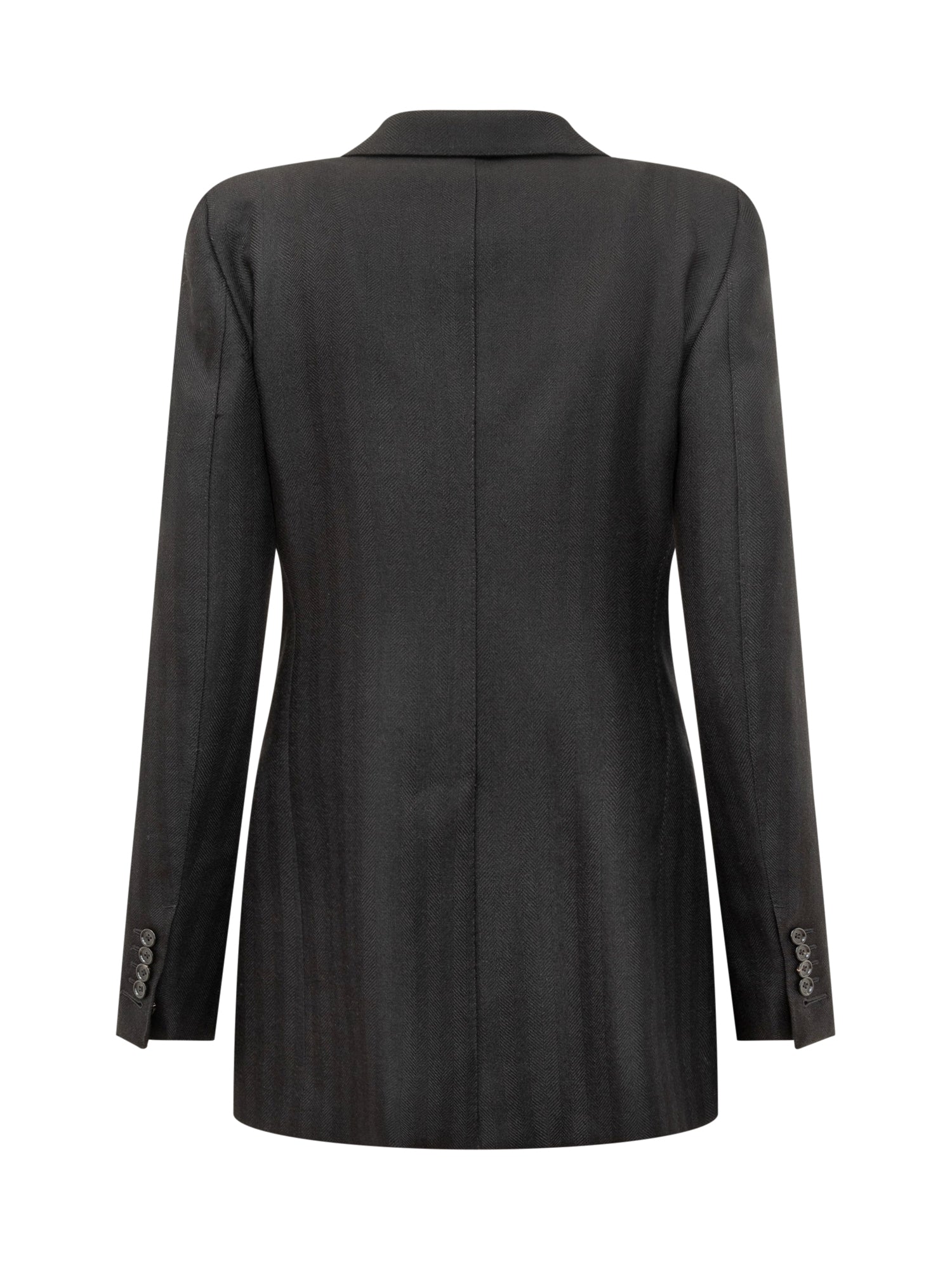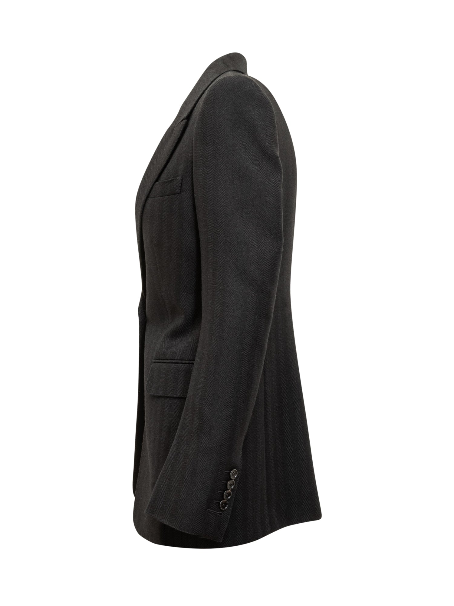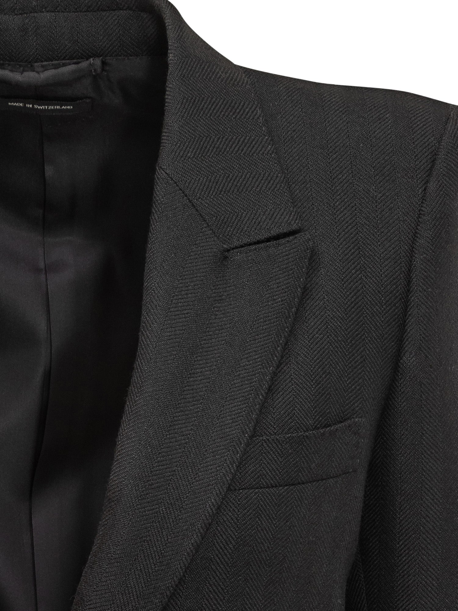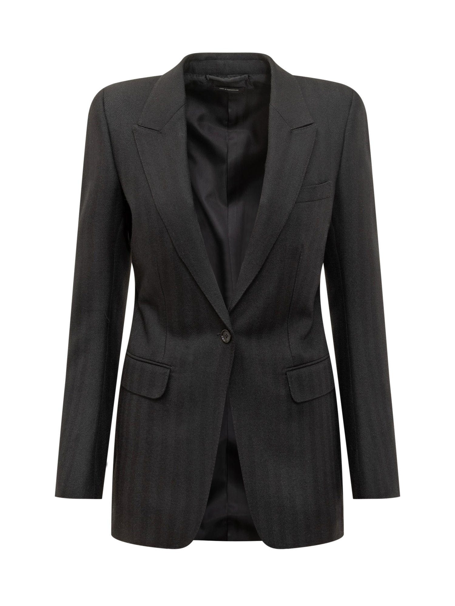 Blazer Tom Ford in lana nera con chiusura a un bottone e taglio sartoriale. Linea aderente e revers classici per un eleganza senza tempo.