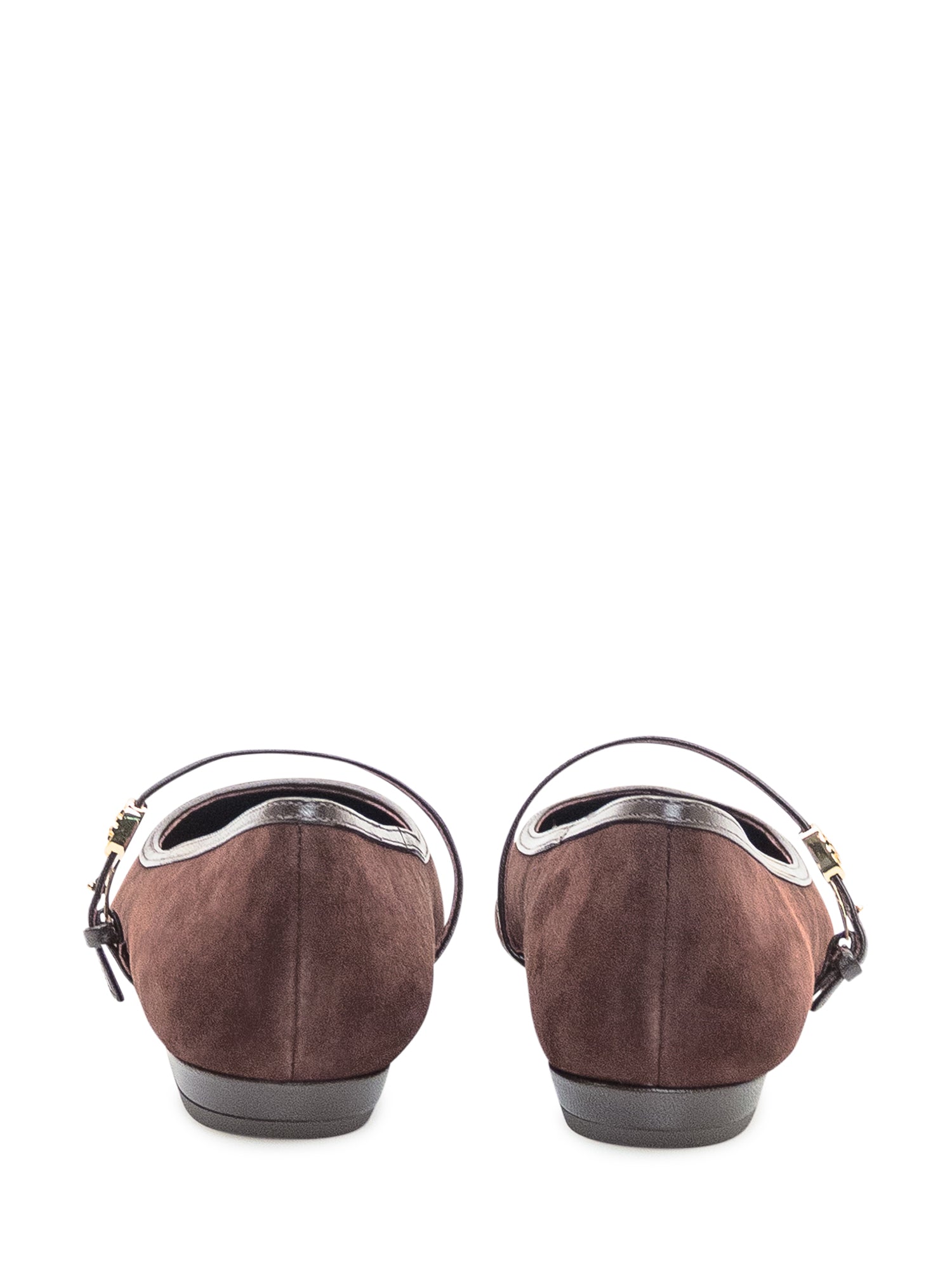 Ballerine Tory Burch in suede marrone con punta affusolata e cinturino regolabile con dettaglio logo.