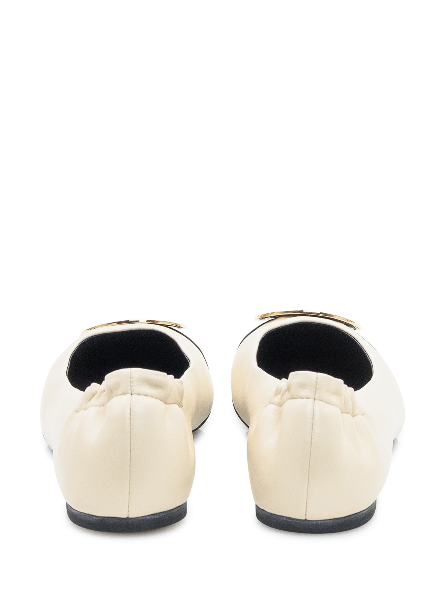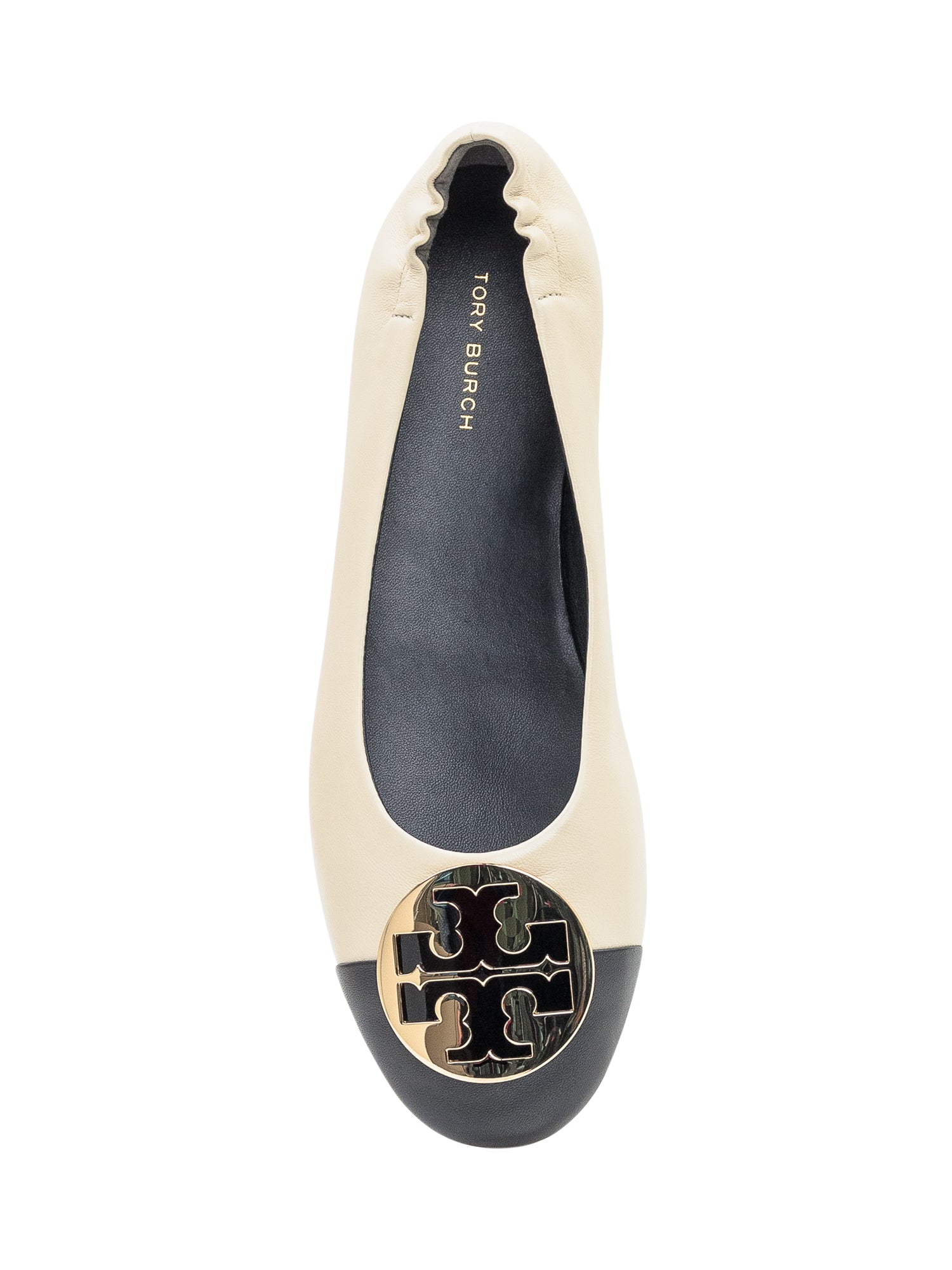 Ballerine Tory Burch in pelle bicolore con punta nera e logo metallico dorato.