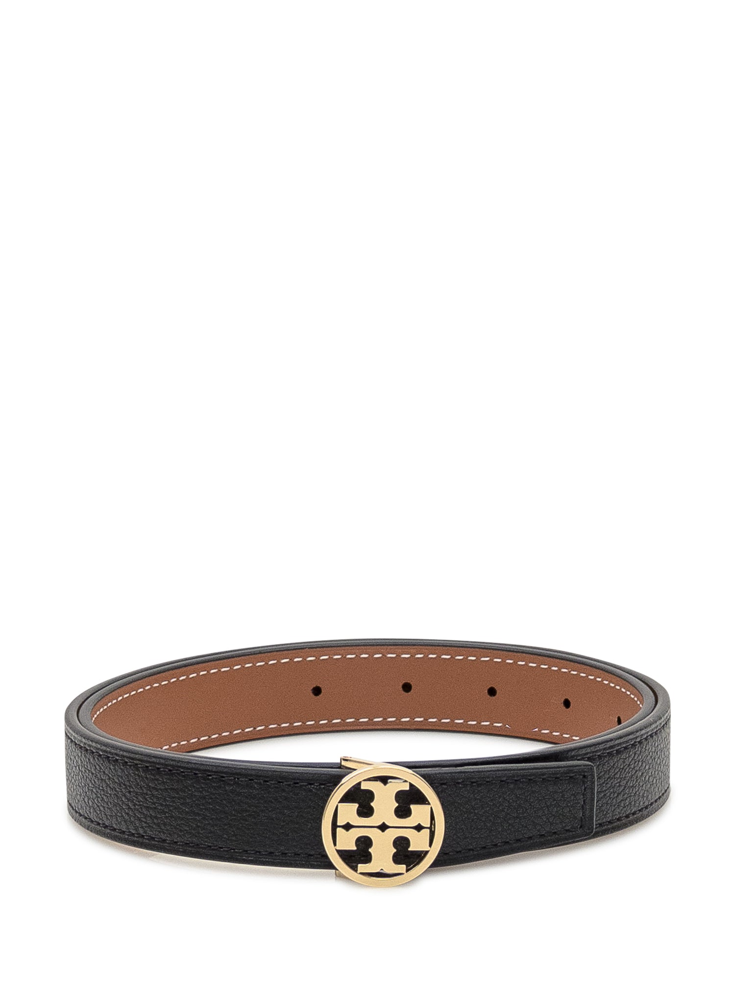 Cintura Miller reversibile in pelle nera firmata Tory Burch. Realizzata in pelle martellata con fibbia rotonda in metallo dorato decorata dall iconico logo. Il lato interno è in color cuoio.