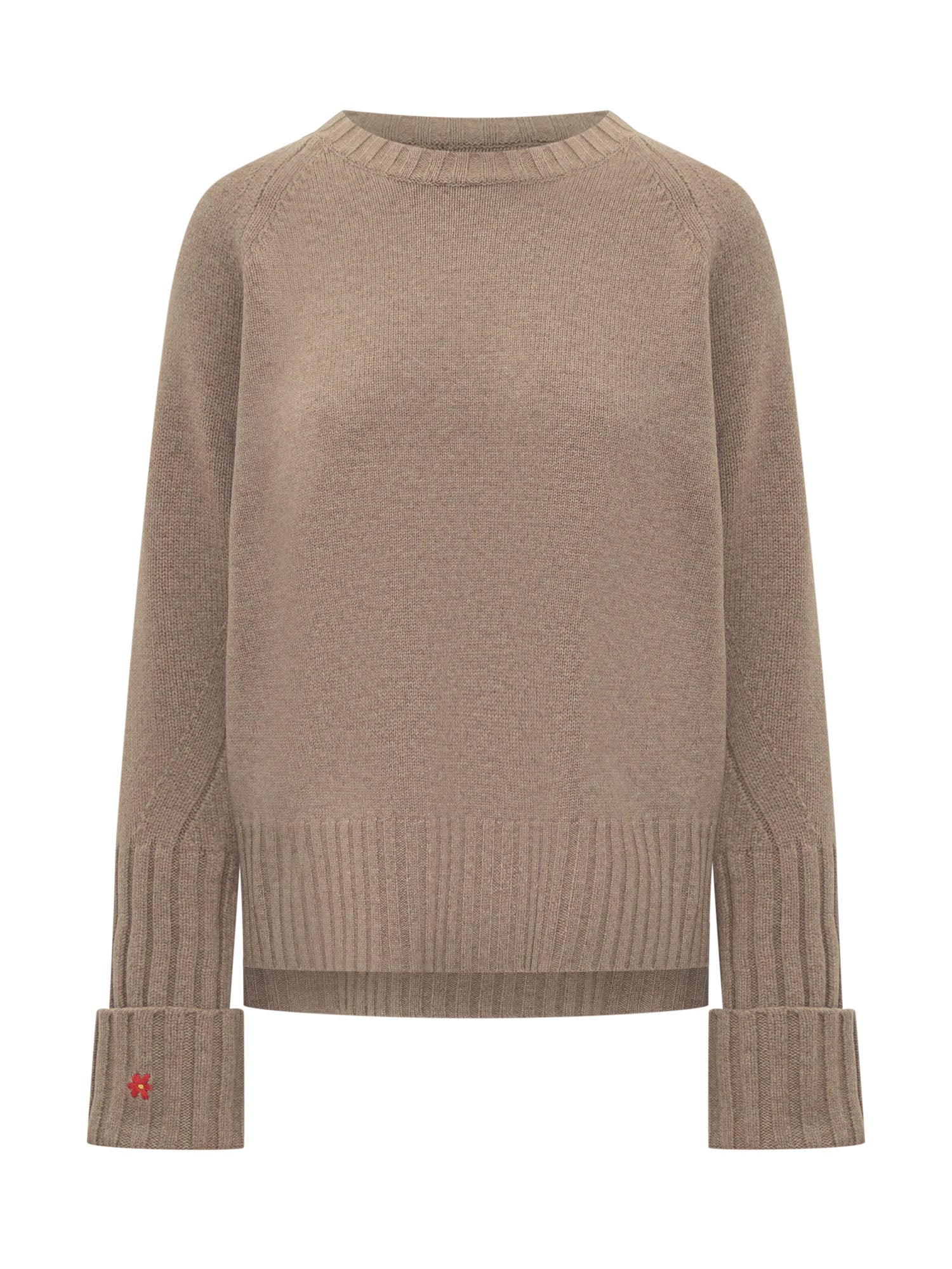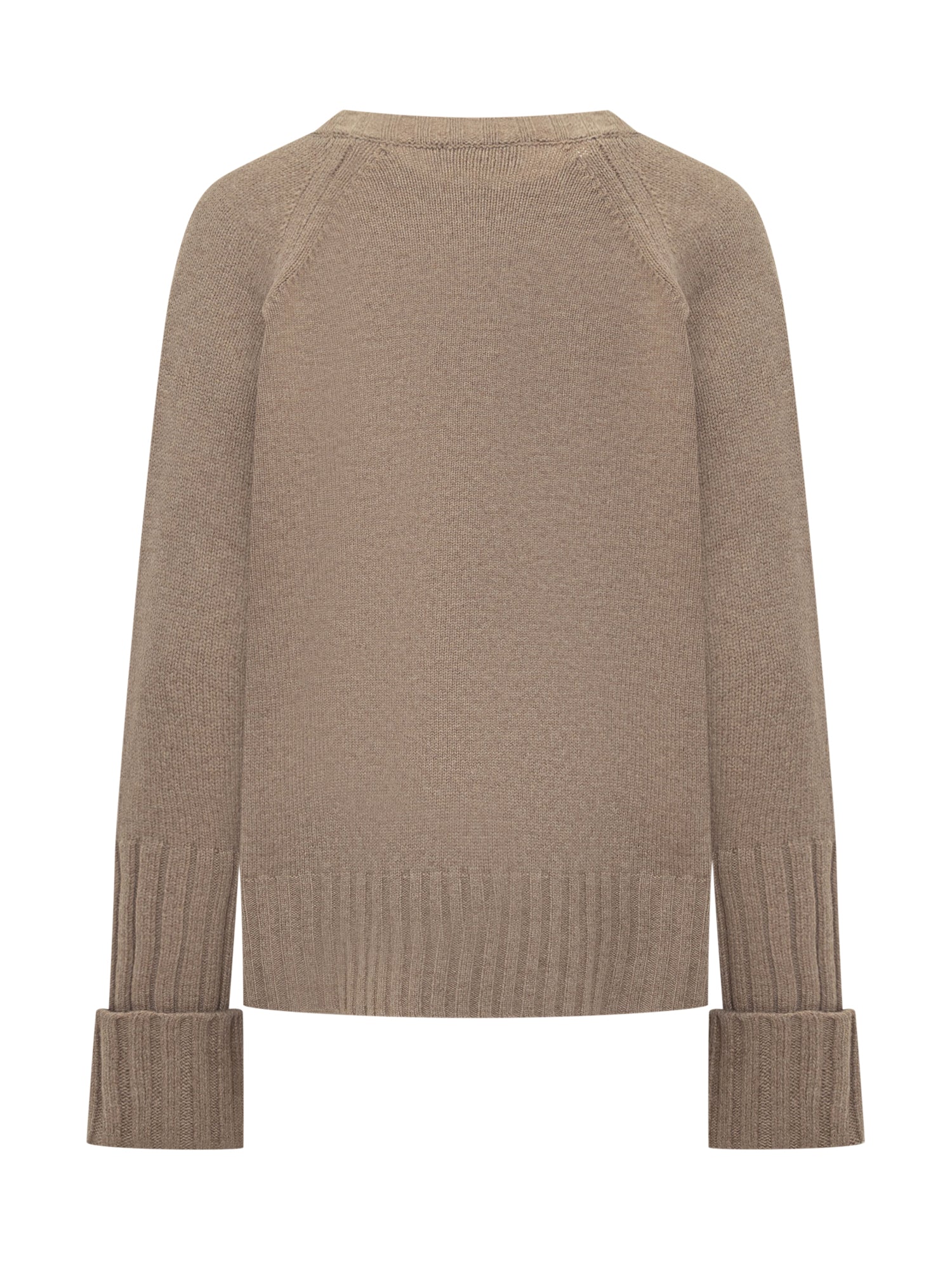 Maglione Tory Burch in lana beige con maniche lunghe e dettagli a coste. Rifinito con piccolo logo ricamato a contrasto sul polsino.