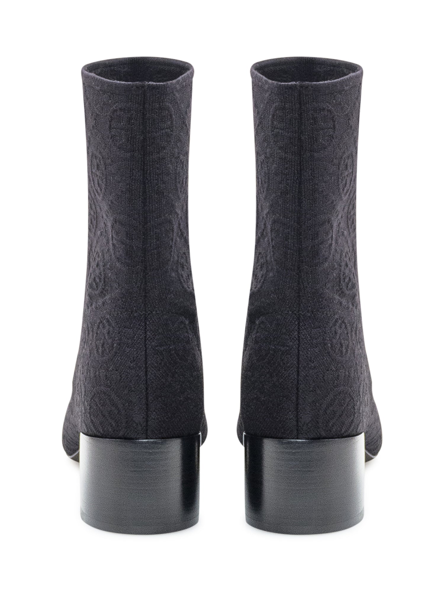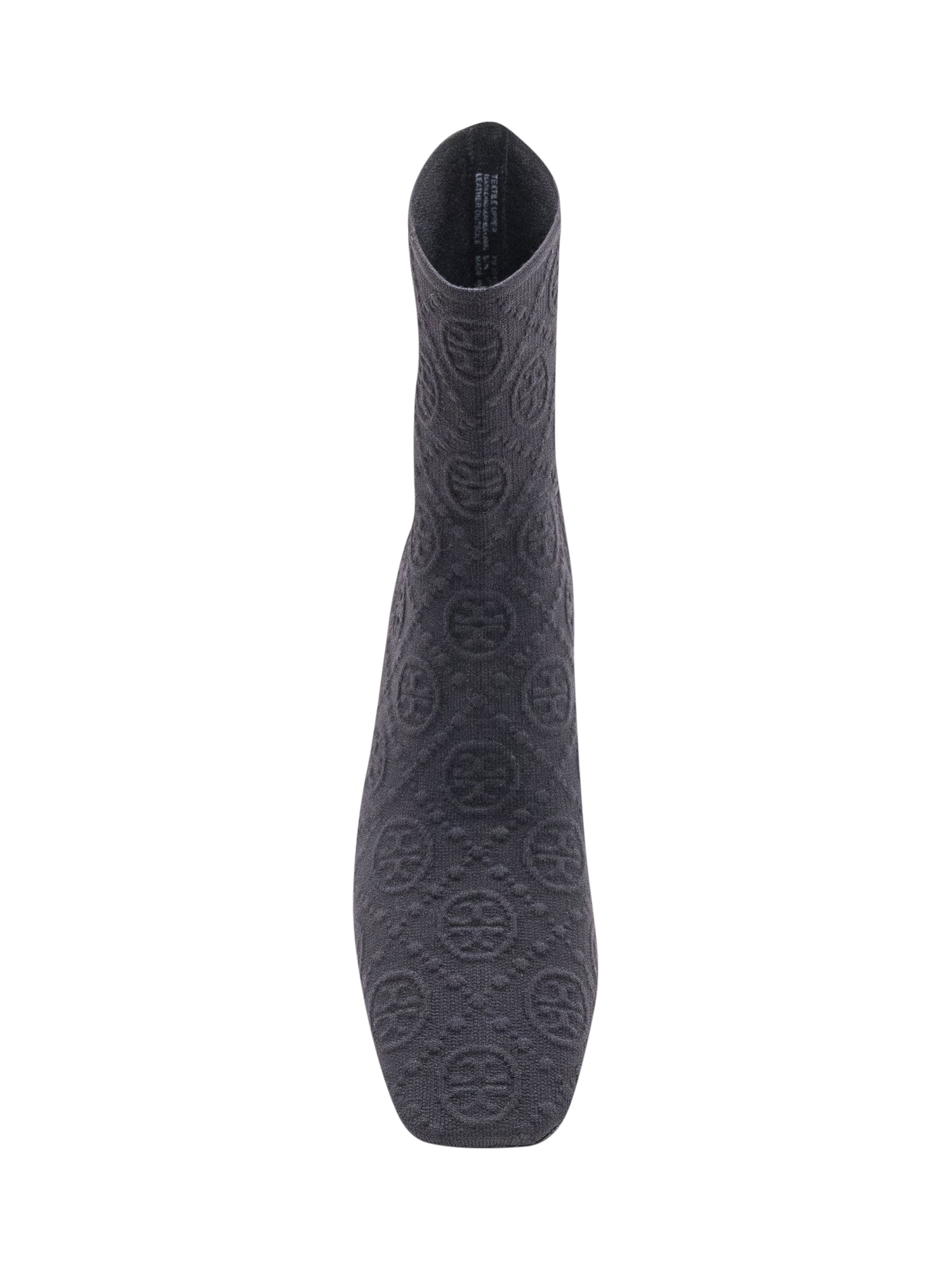 Stivaletti Tory Burch neri in tessuto elasticizzato con motivo logo in rilievo.