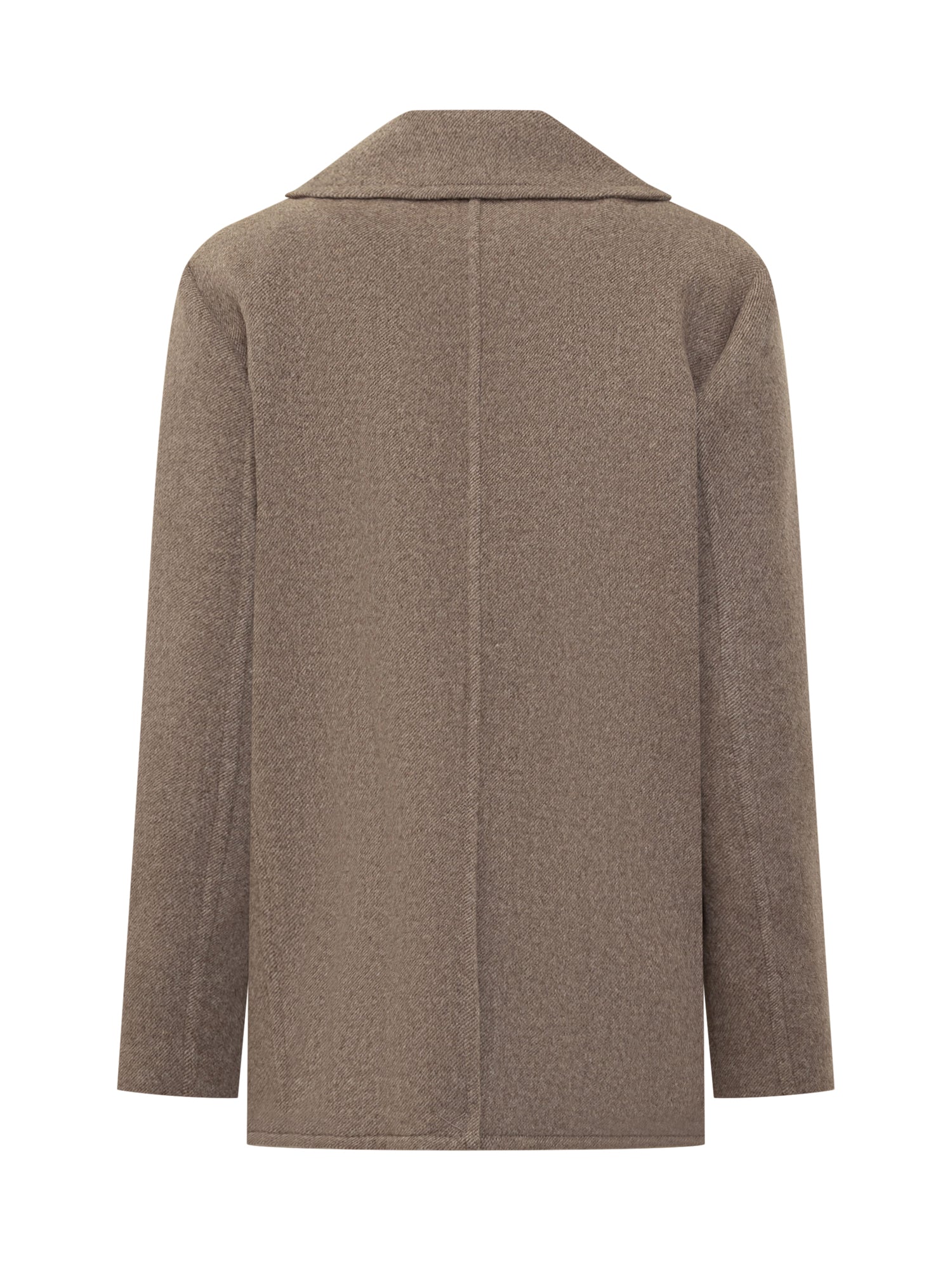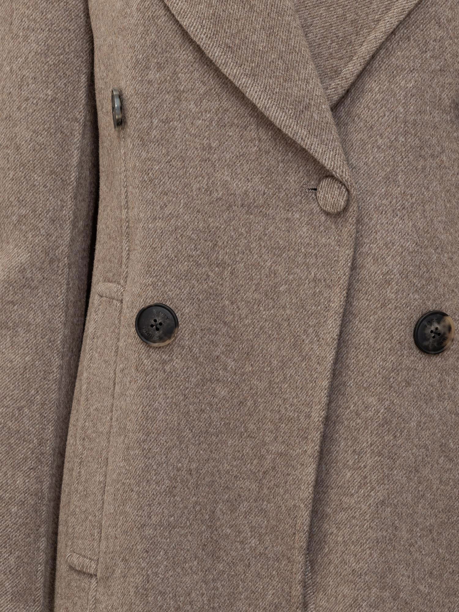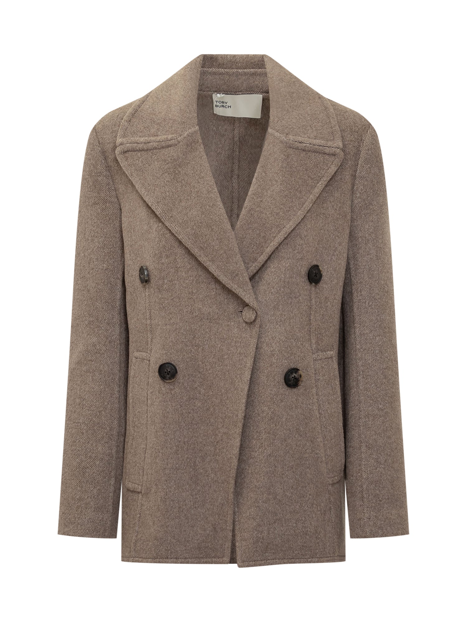 Cappotto doppiopetto Tory Burch in lana beige con revers ampi e bottoni a contrasto.