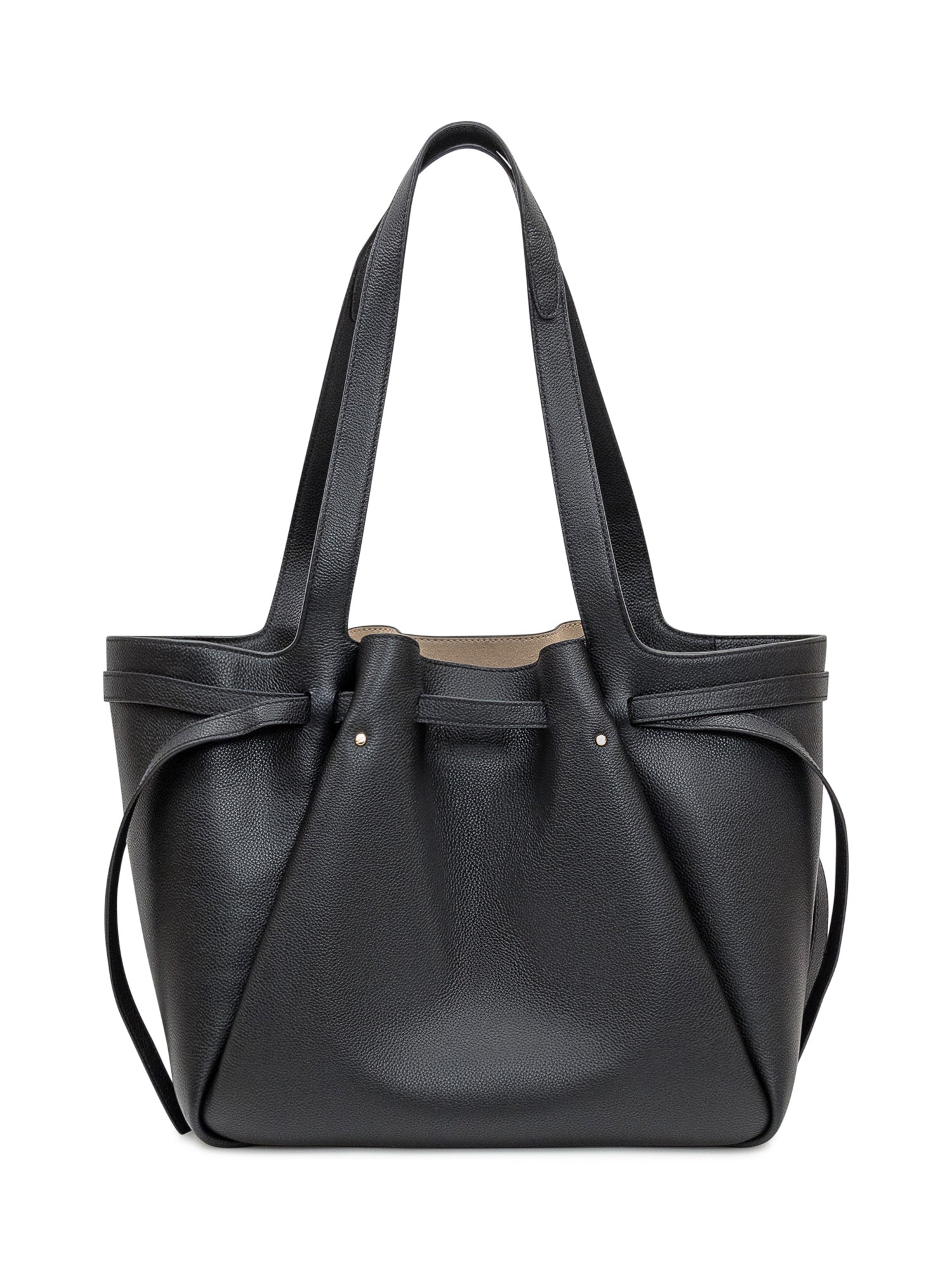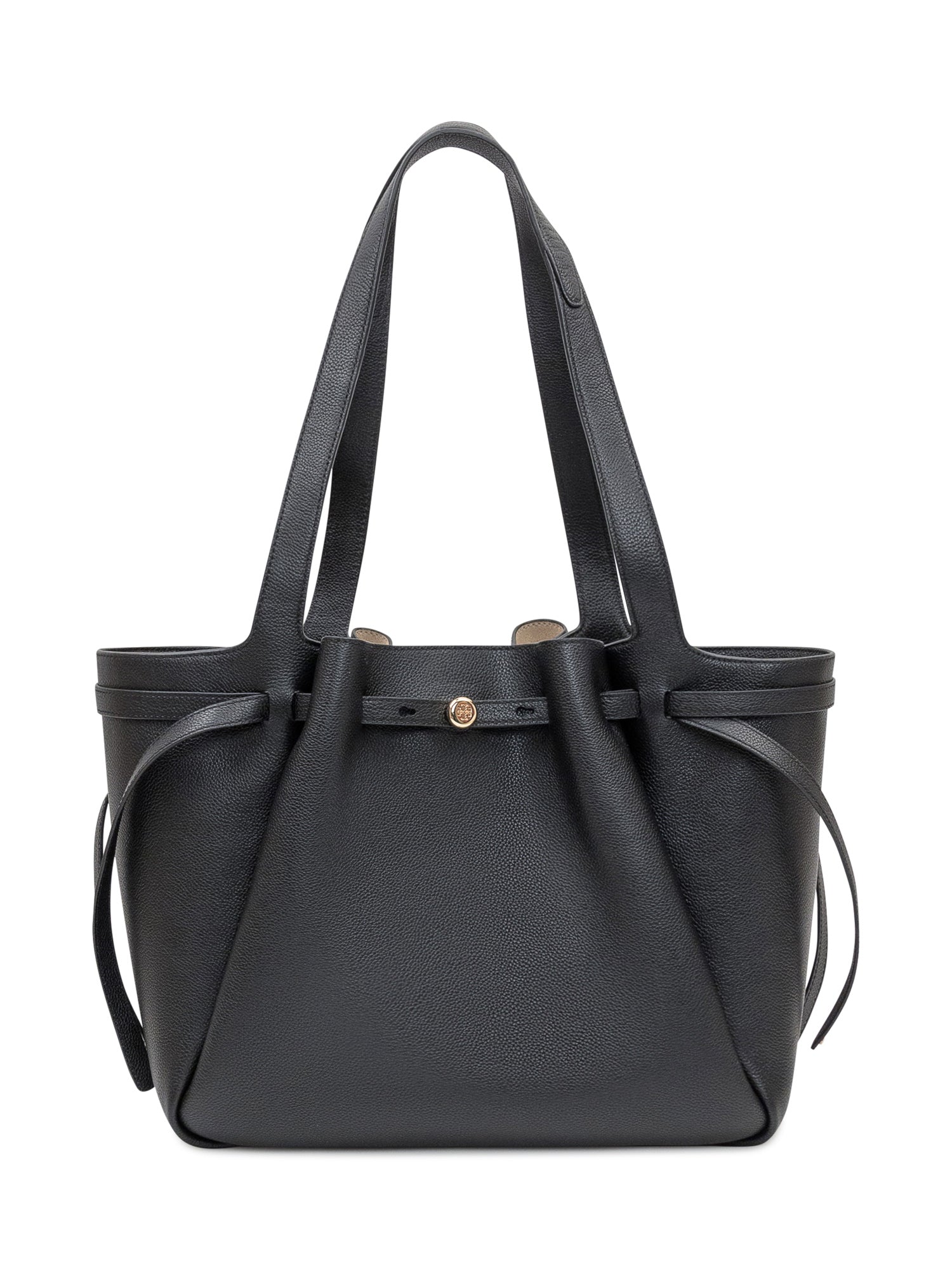Borsa tote nera in pelle martellata di Tory Burch. Design morbido con doppi manici lunghi, tasca interna con zip e chiusura con lacci esterna. Logo inciso su borchia dorata centrale.