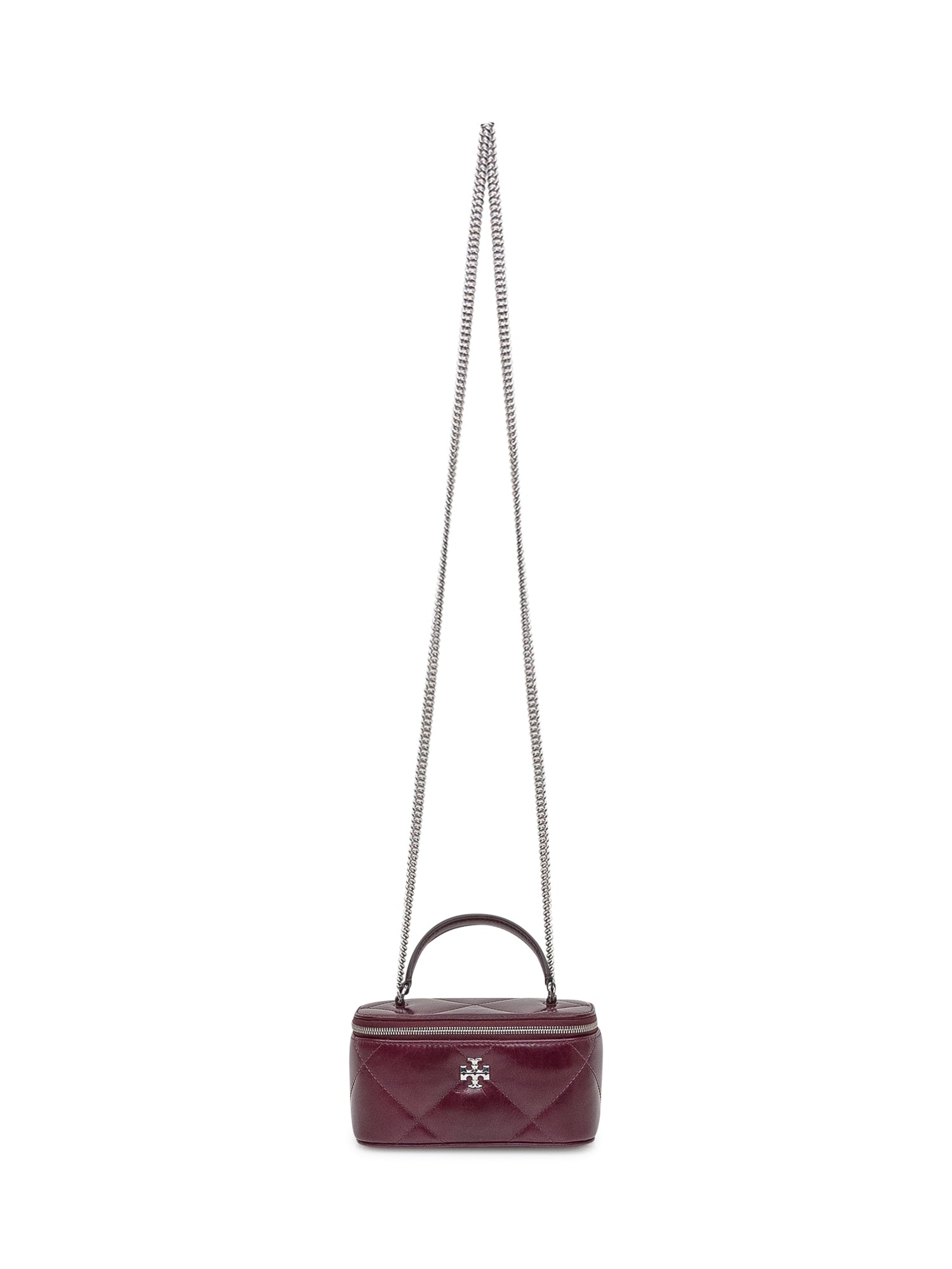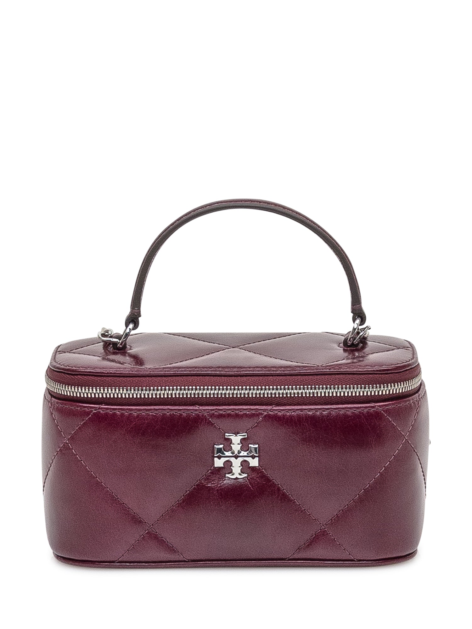 Borsa vanity Tory Burch in pelle bordeaux con lavorazione trapuntata e logo in metallo.