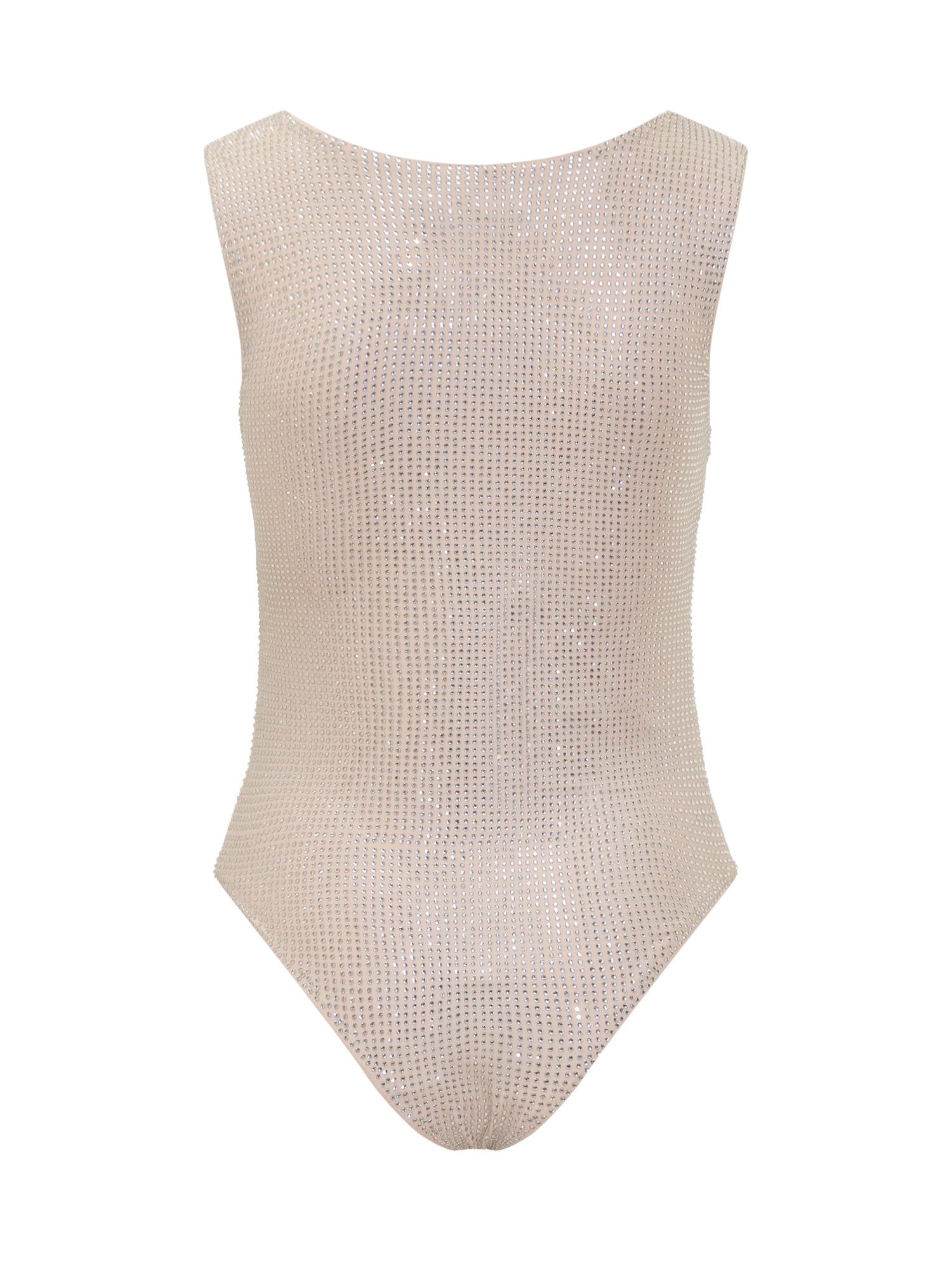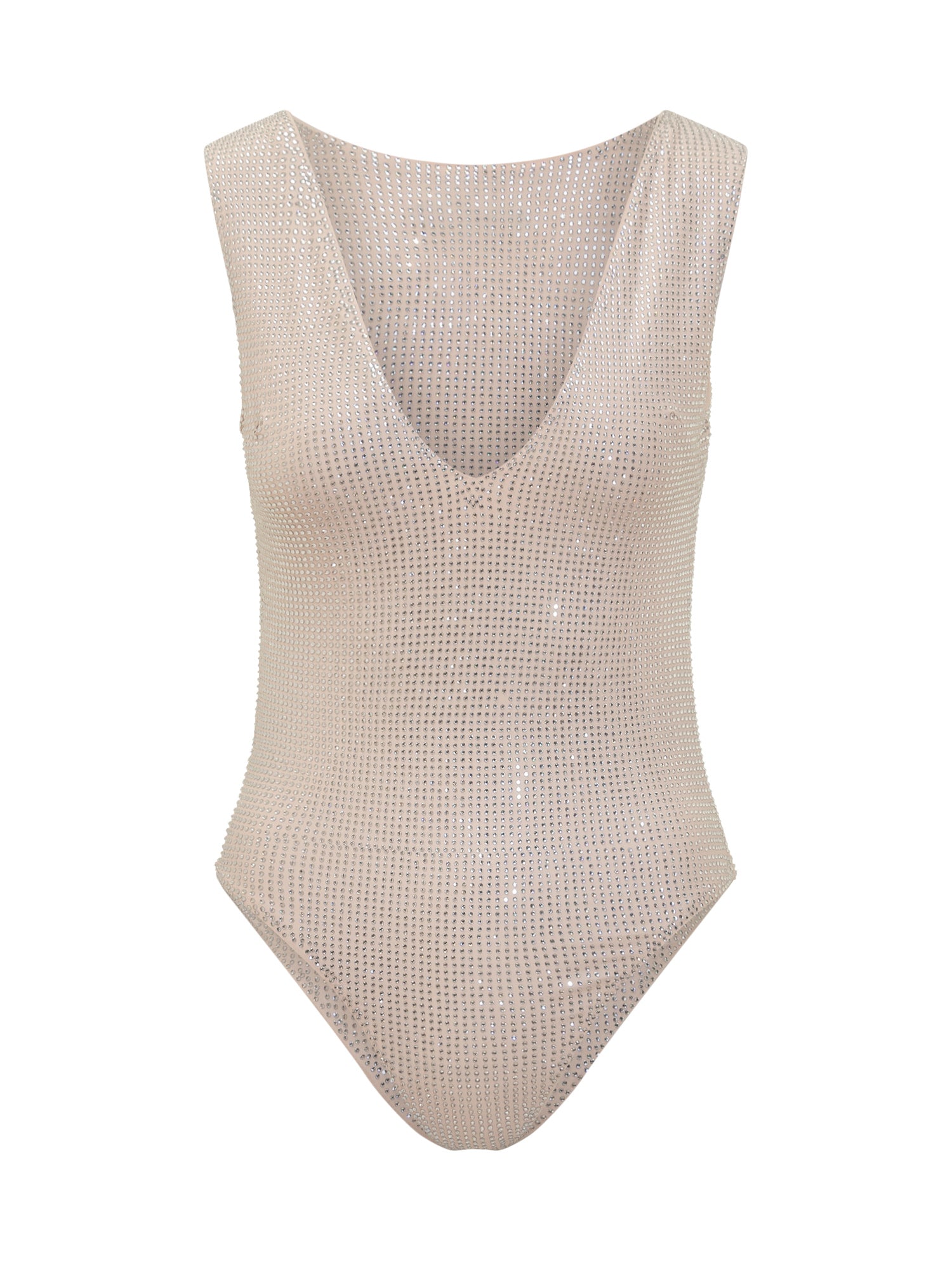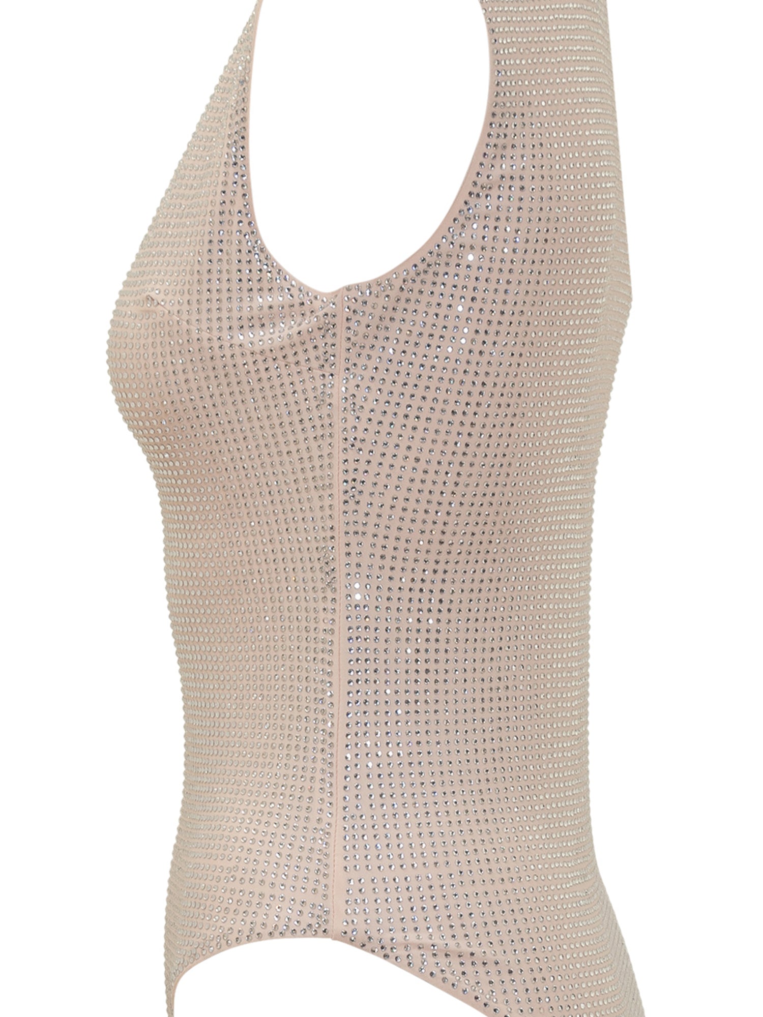 Body nude con scollo a V. Smanicato. Strass aplicati all-over. Chiusura con bottoni sul fondo.