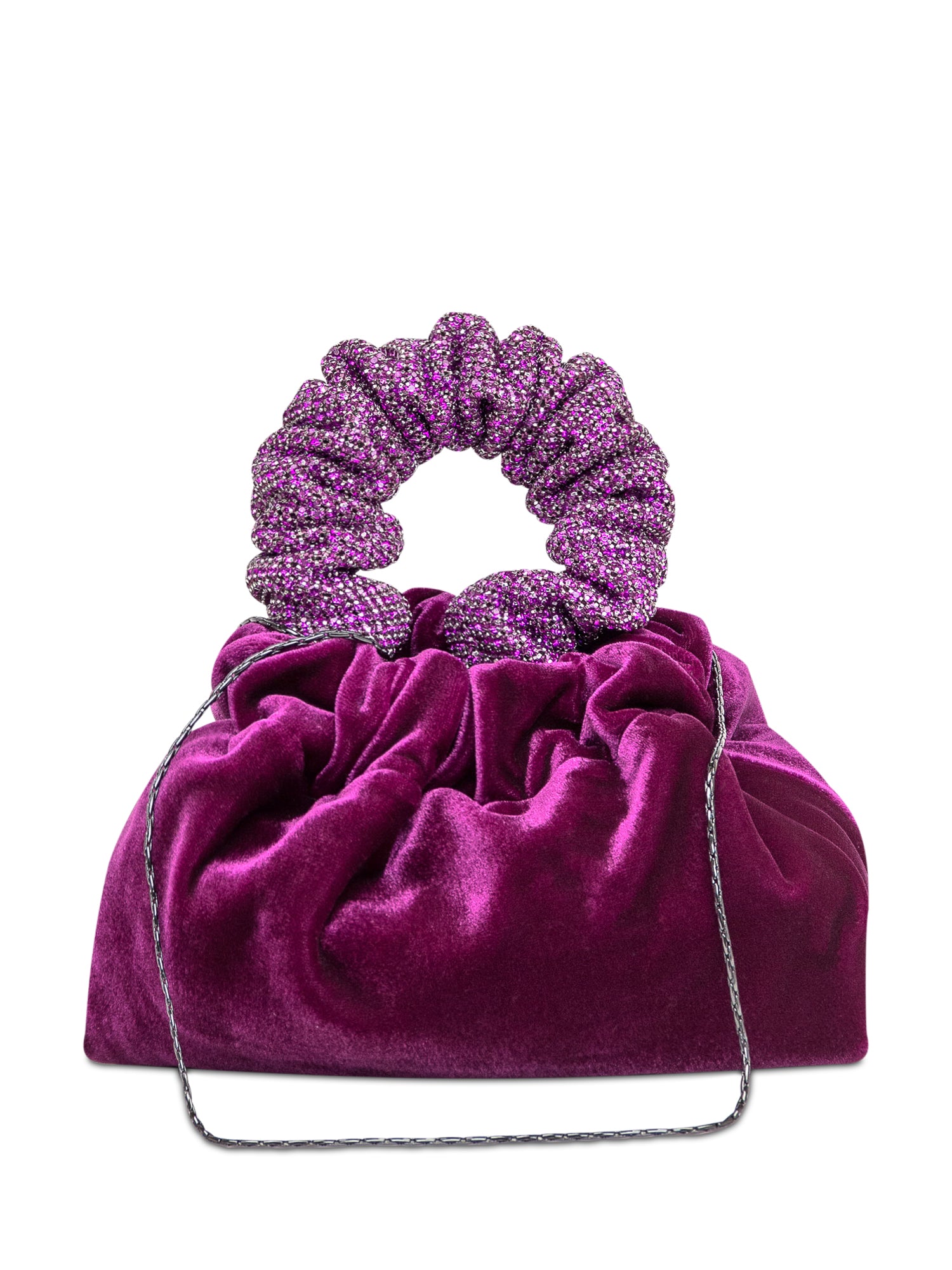 Borsa a mano viola in velluto. Design a sacchetto. Manico scrunchie con cristalli neri. Uno scomparto interno con tasca. Tracolla rimovibile. Chiusura con bottone.