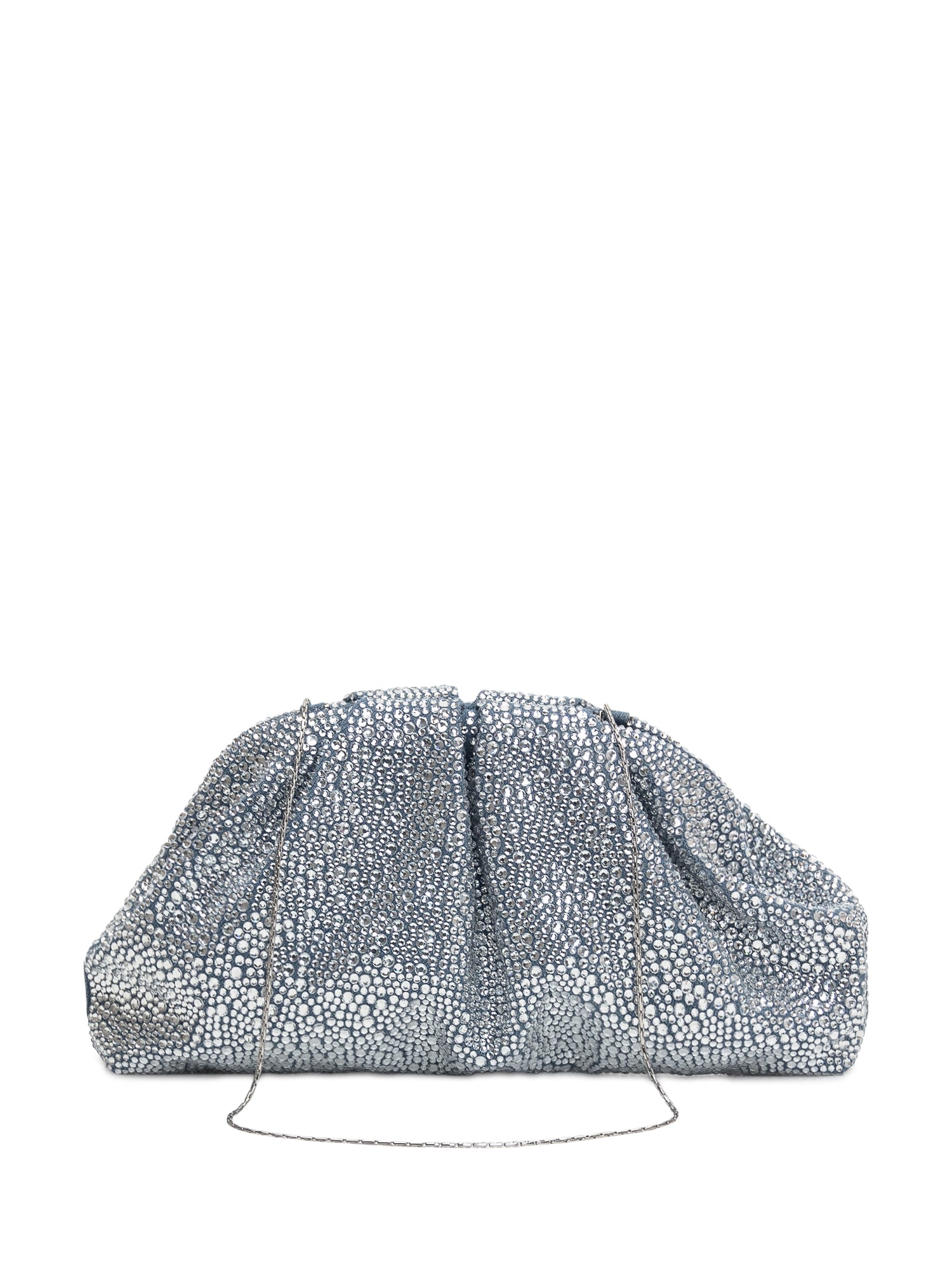 Pochette azzurra in denim, strass all over, tracolla removibile.