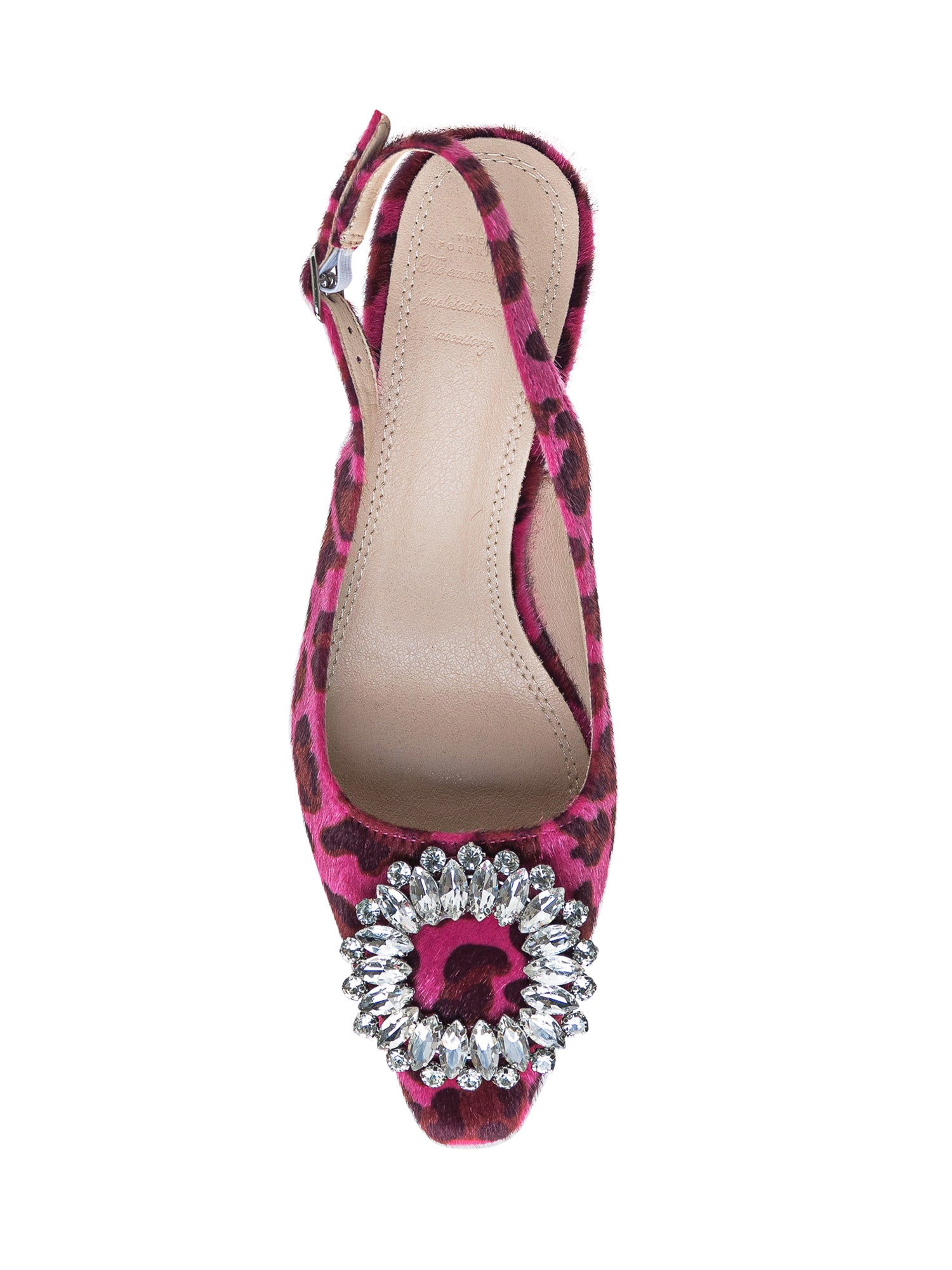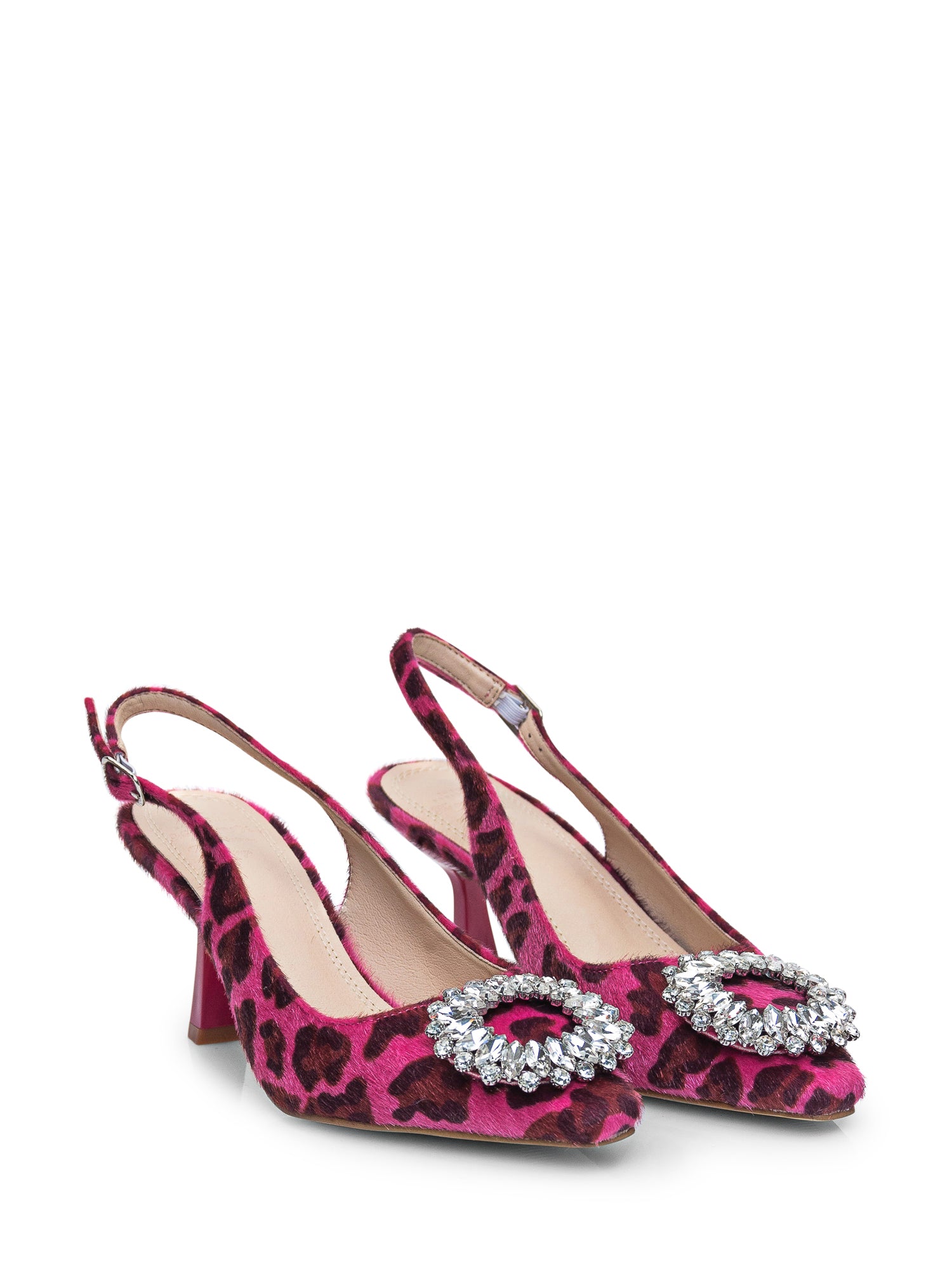 Scarpa con tacco rosa. Cinturino alla caviglia. Motivo maculato. Fibbia gioiello.