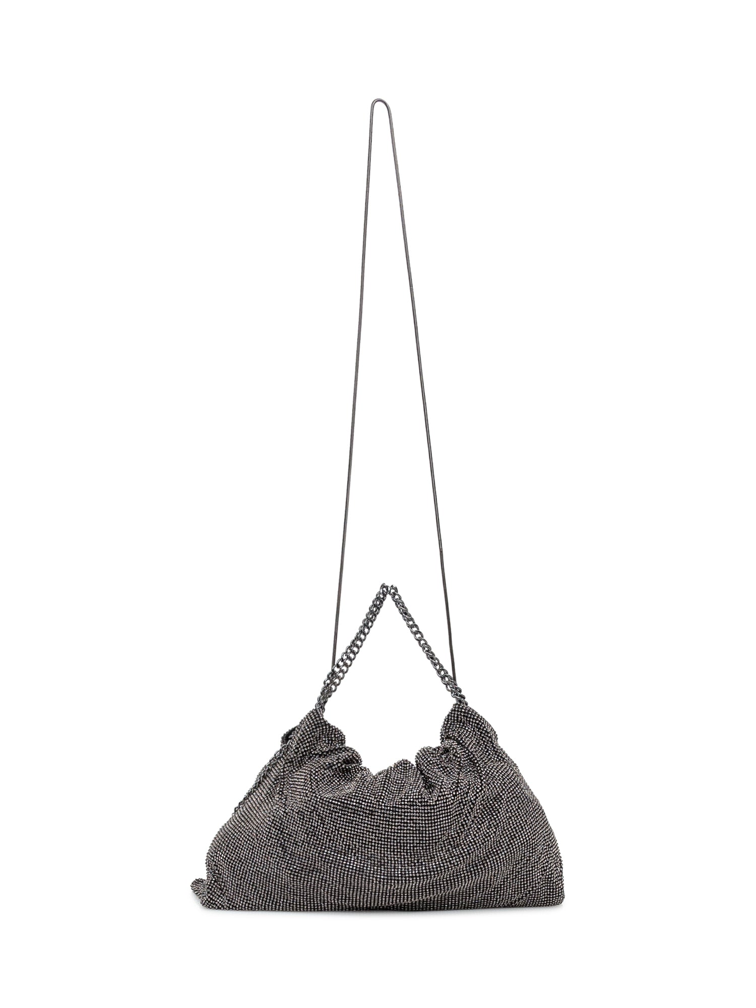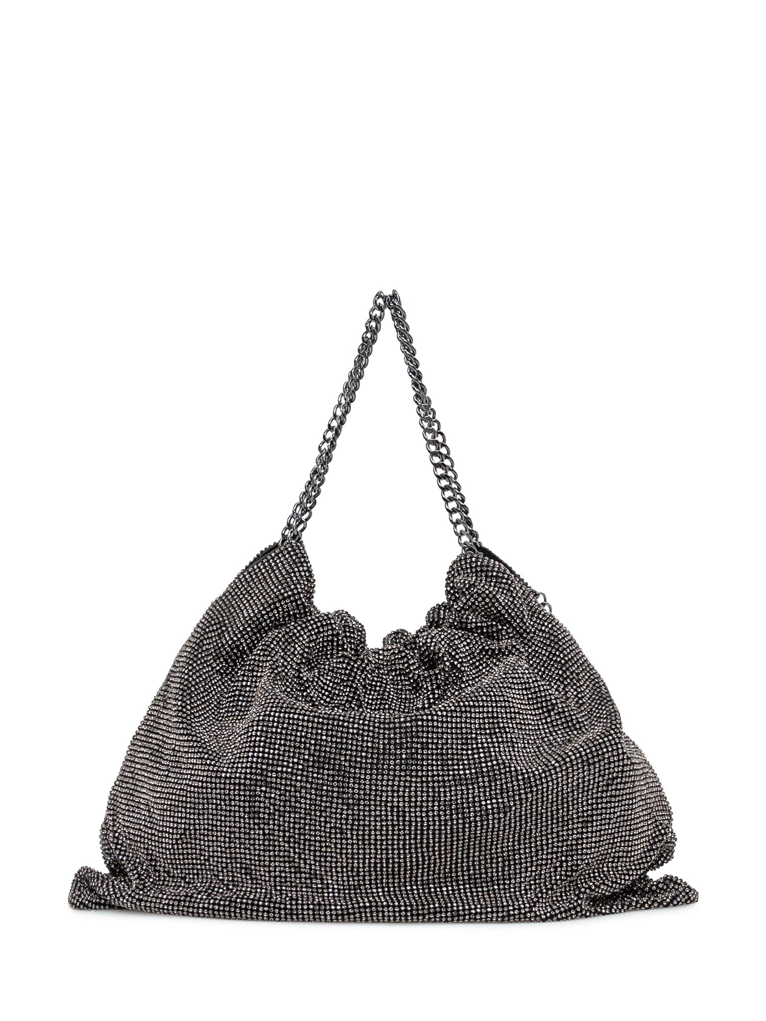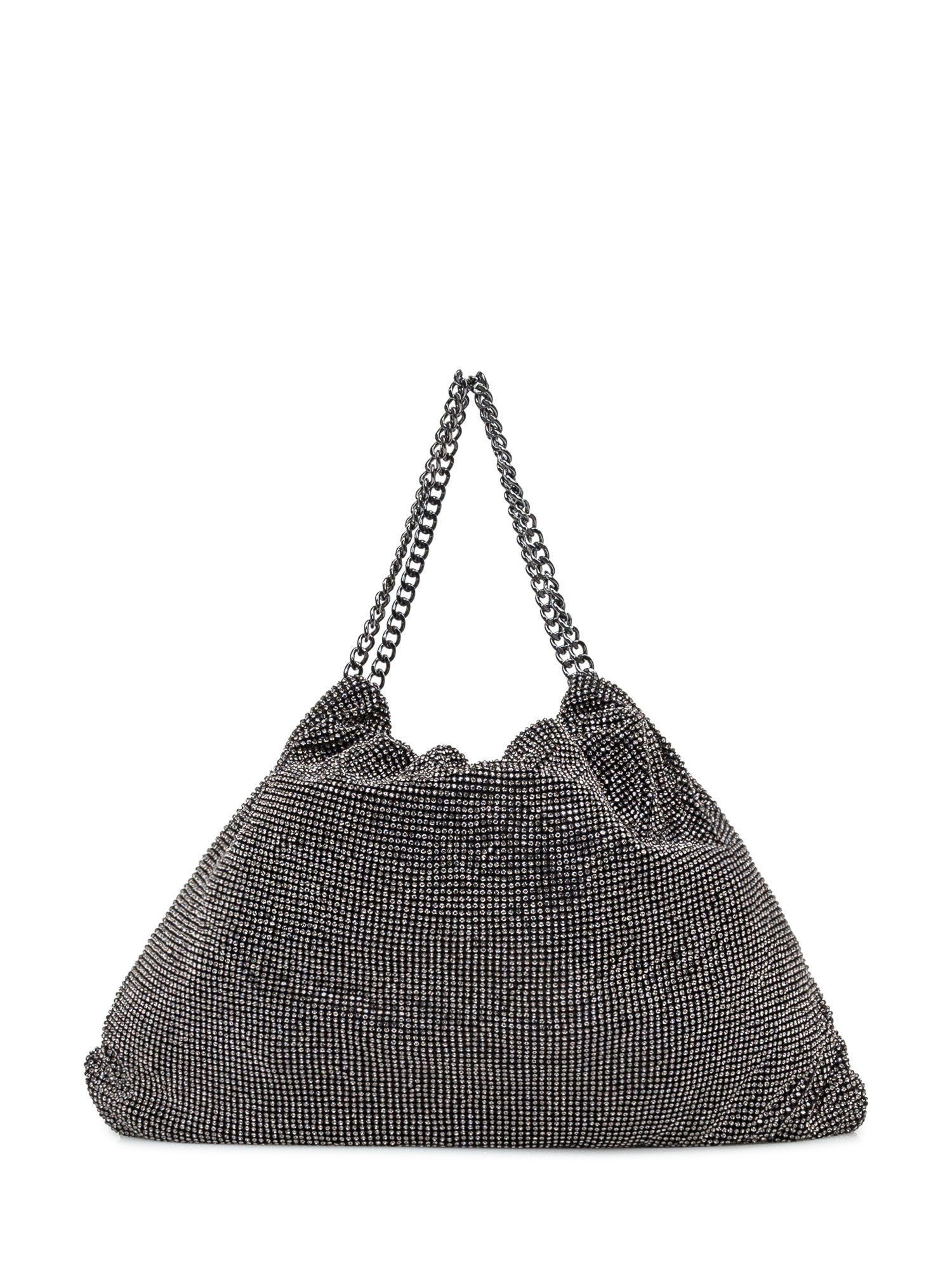 Shopper nera decorata con cristalli luminosi e doppi manici a catena.