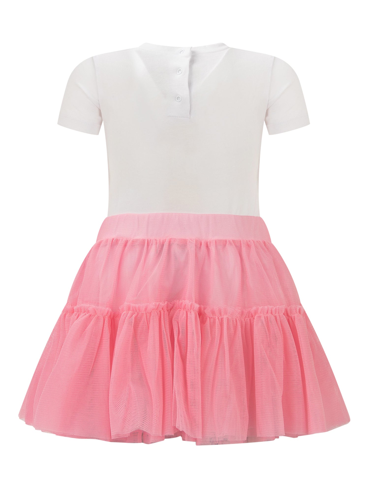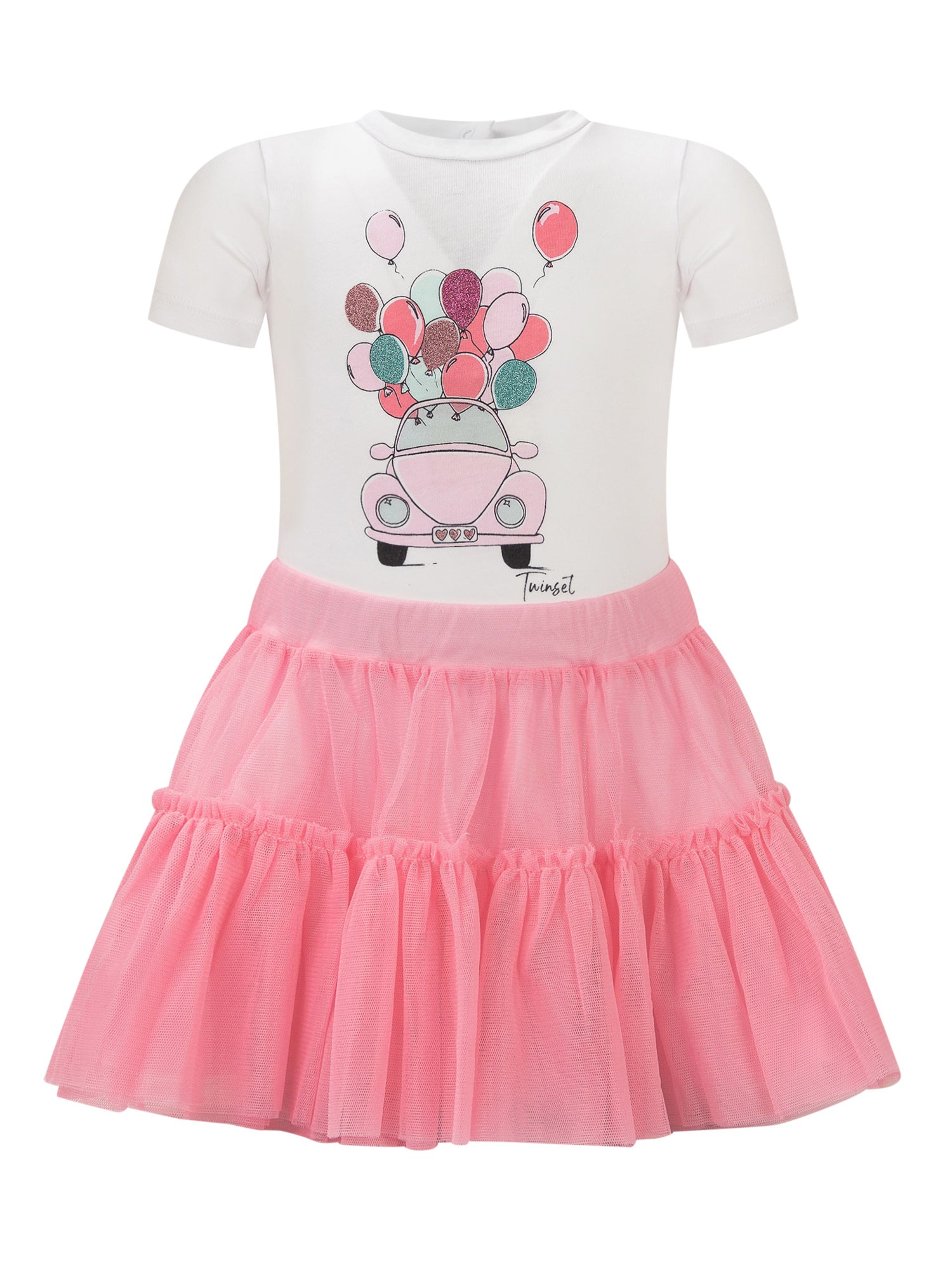T-shirt con maniche corte. Bottoni sul retro. Stampa con glitter sul davanti. Gonna a balze in tulle. Elastico in vita.