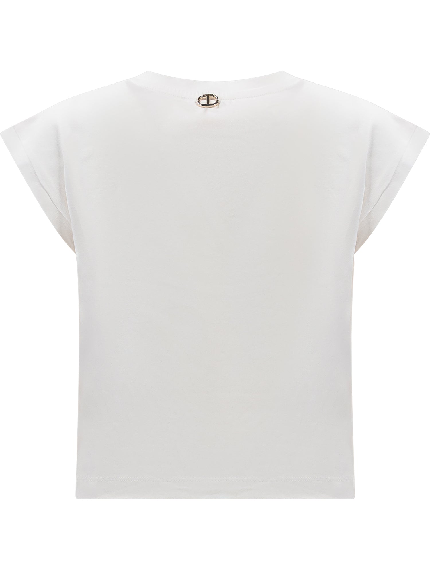 T-Shirt bianca con stampa bocche sul davanti. Maniche corte. Girocollo. Targhetta logo in metallo sul retro.