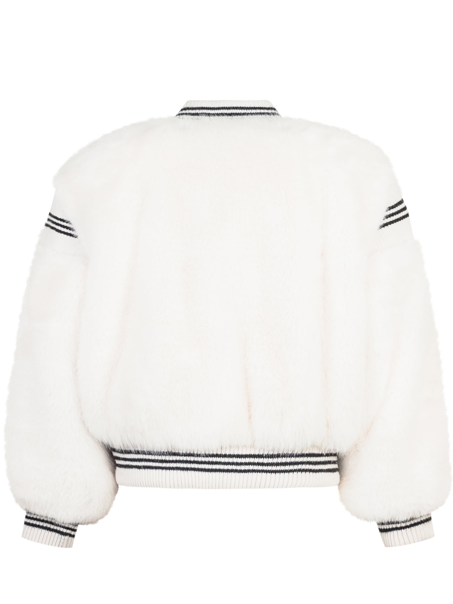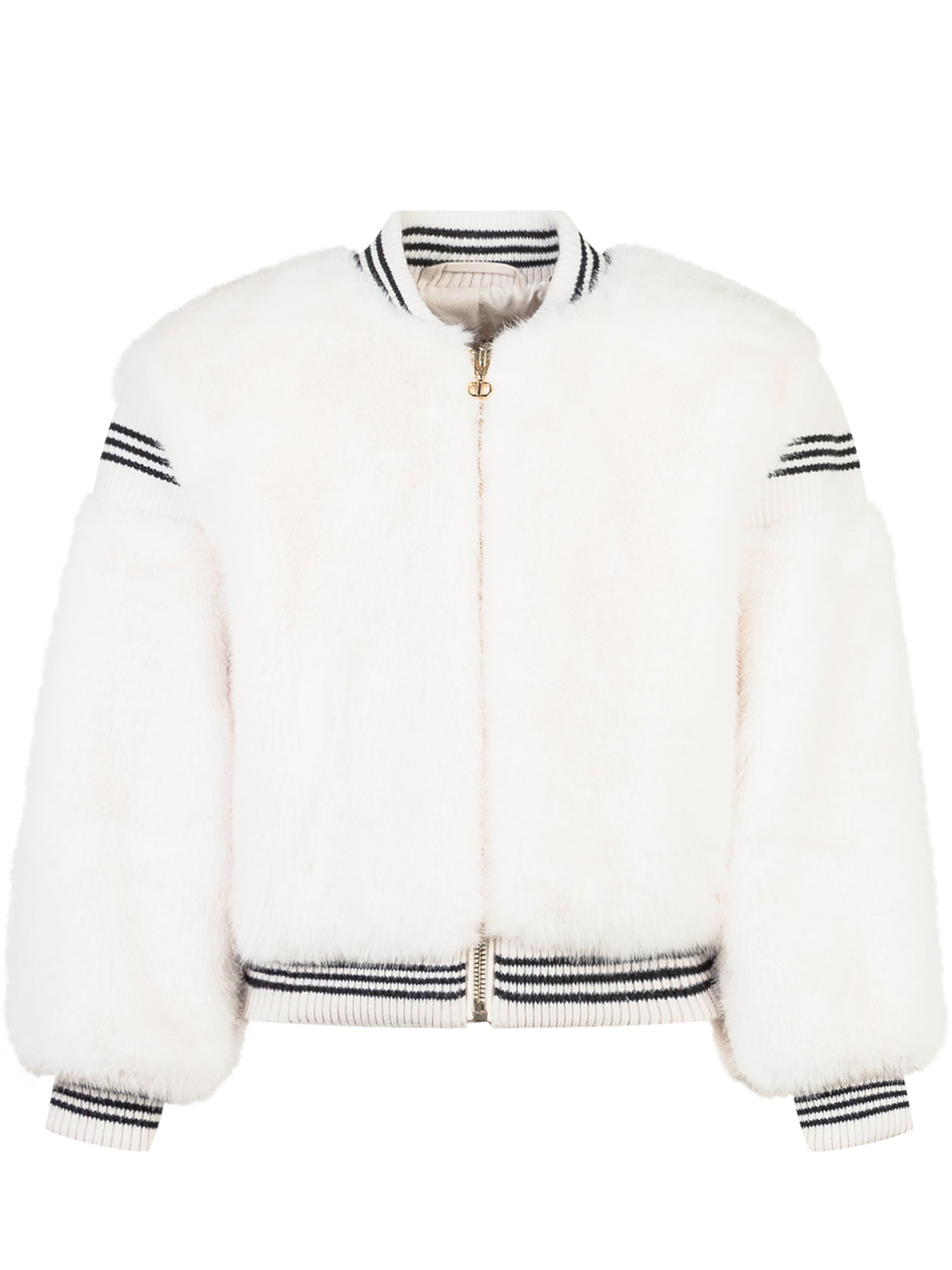 Giacca bomber Twinset da bambina in morbida eco pelliccia bianca con dettagli a righe sul collo, polsi e fondo.
