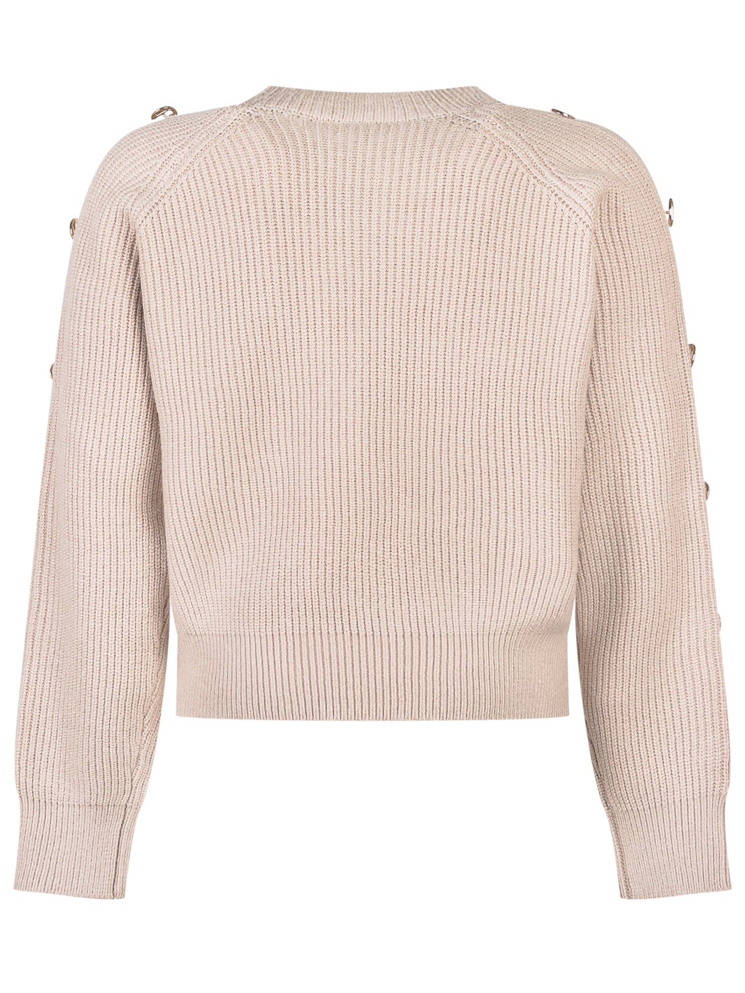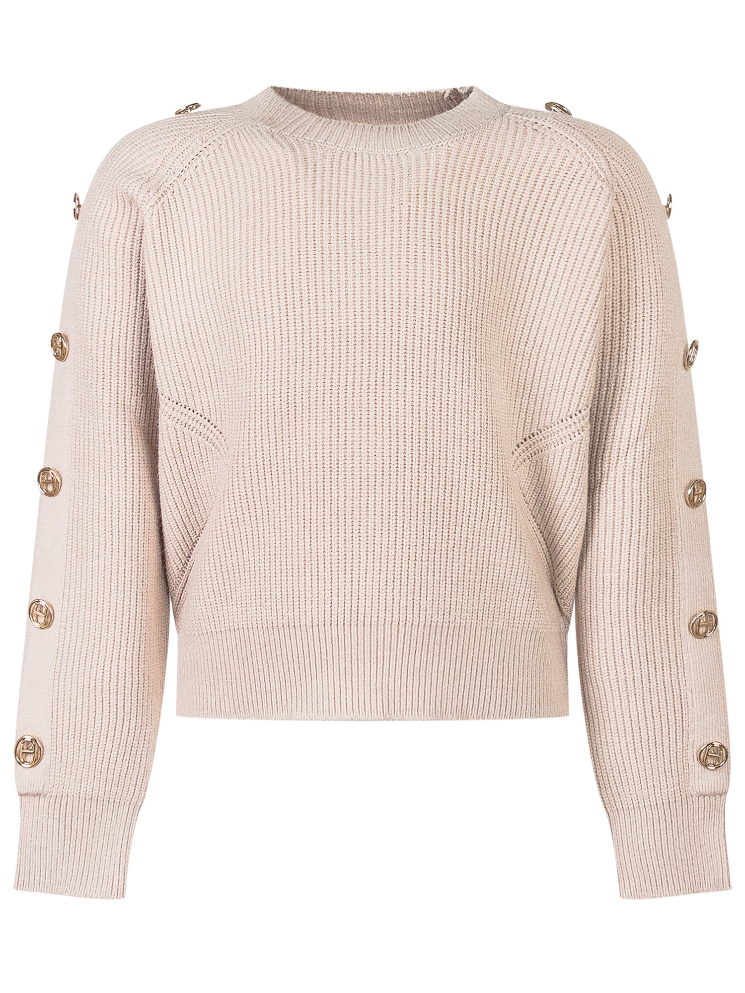 Maglione Twinset Kids in maglia a coste beige con bottoni dorati logati lungo le maniche.