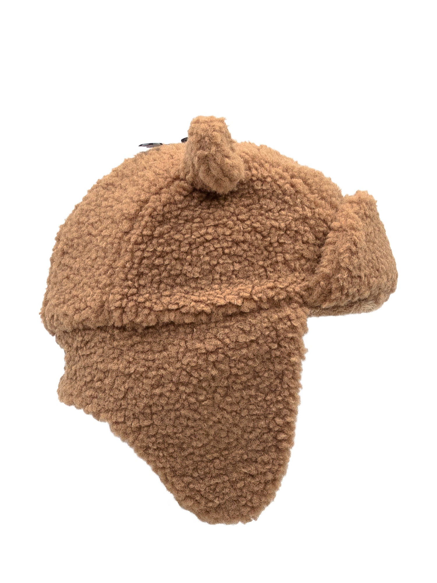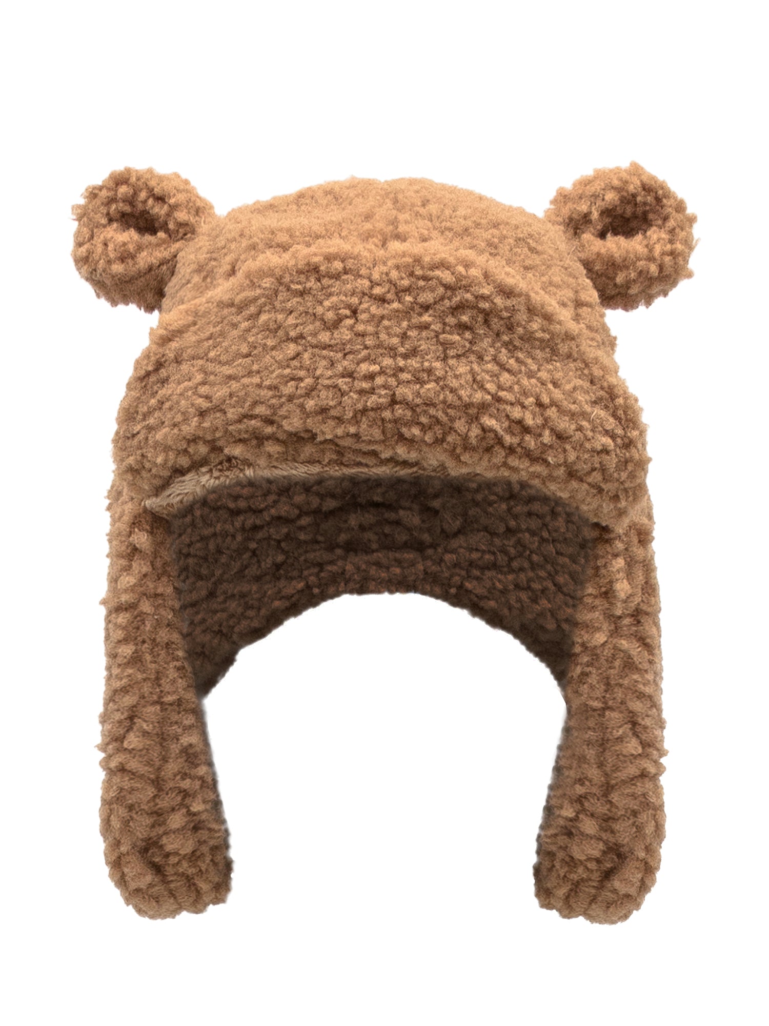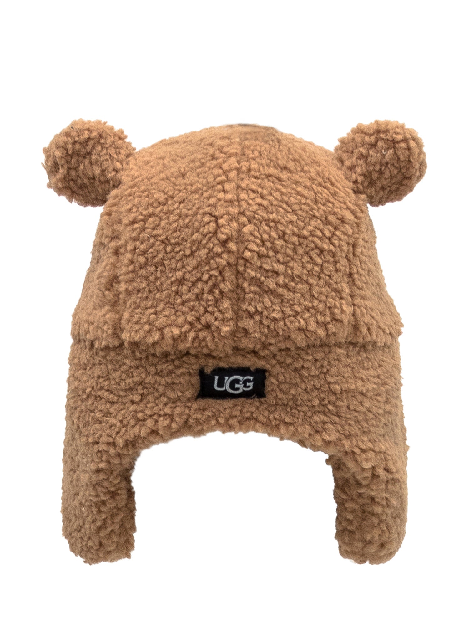 Cappello UGG in shearling sintetico marrone, morbido e avvolgente, con simpatiche orecchie teddy e paraorecchie per il massimo comfort.