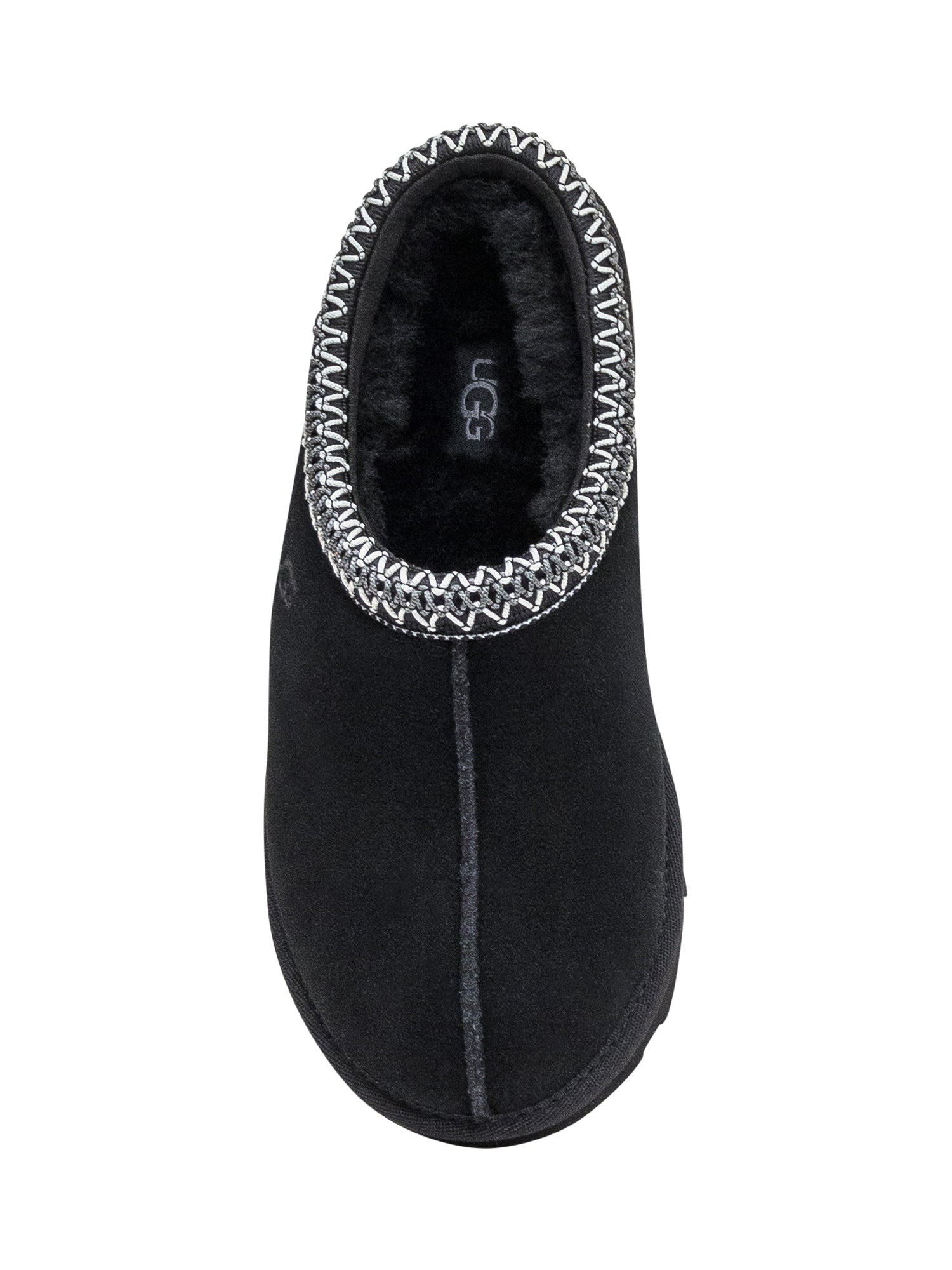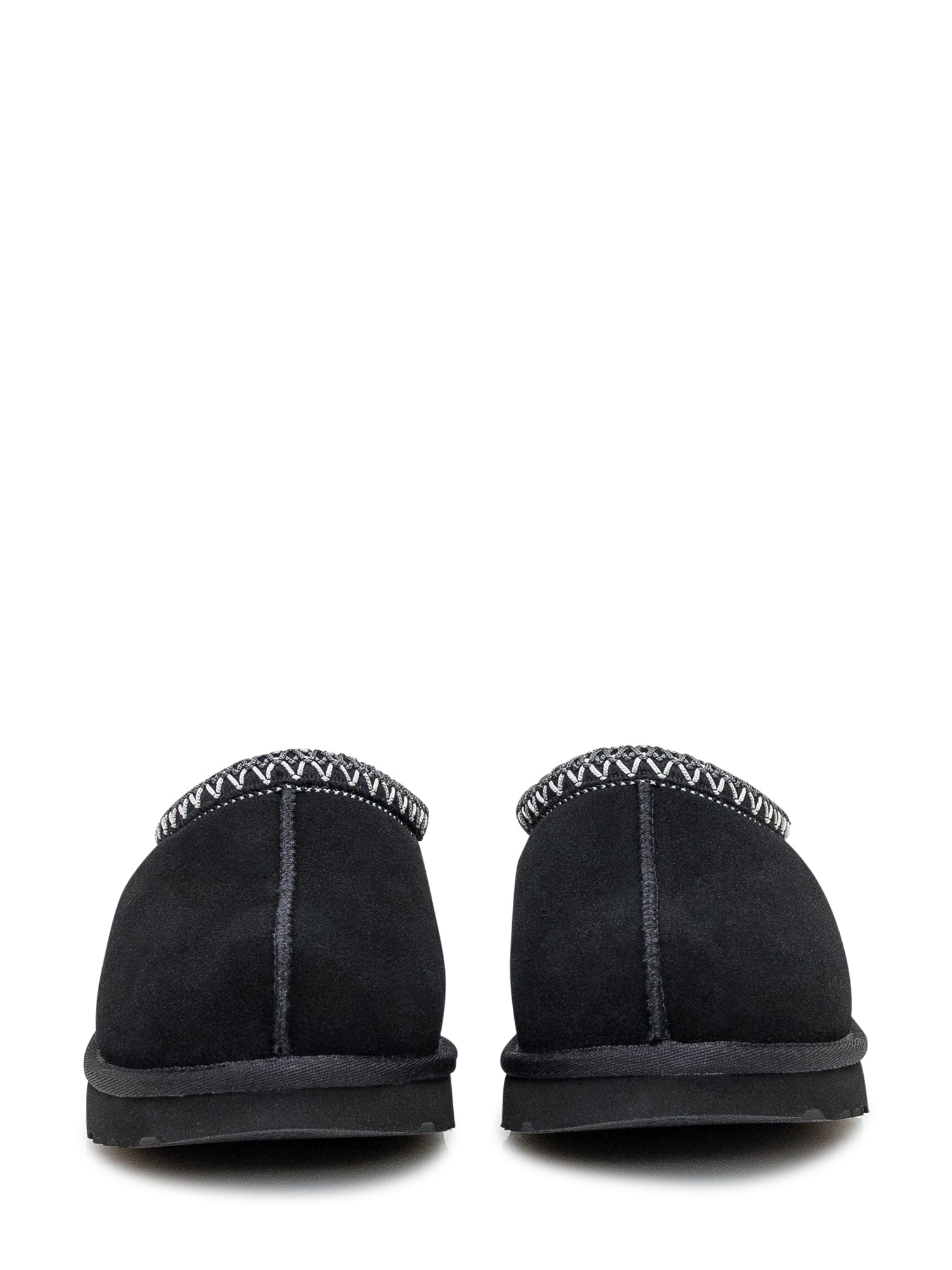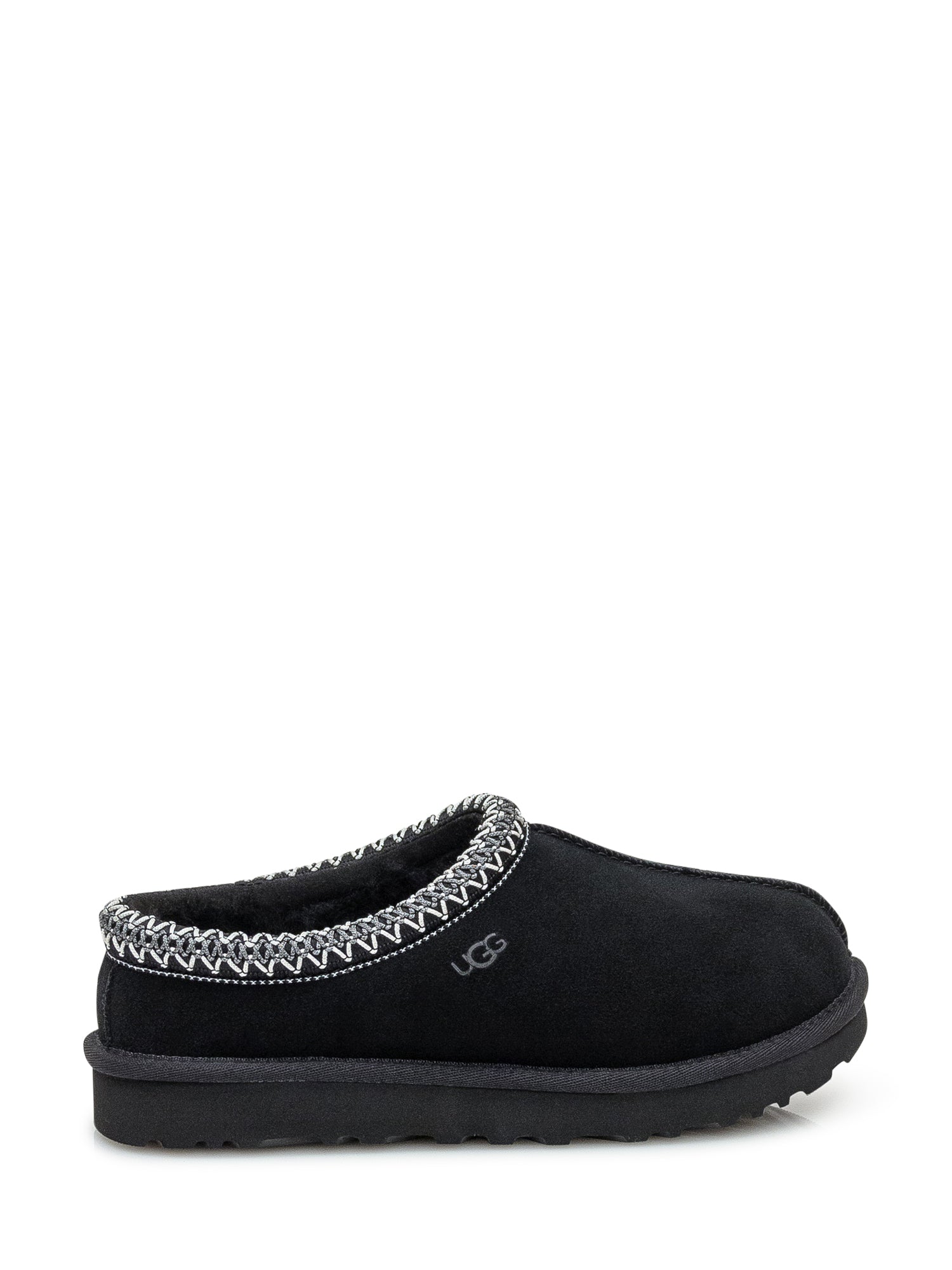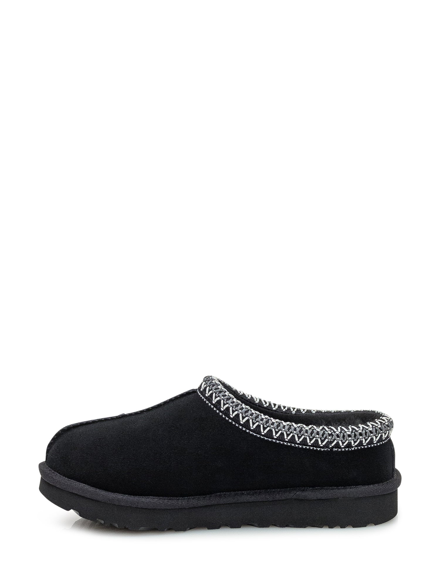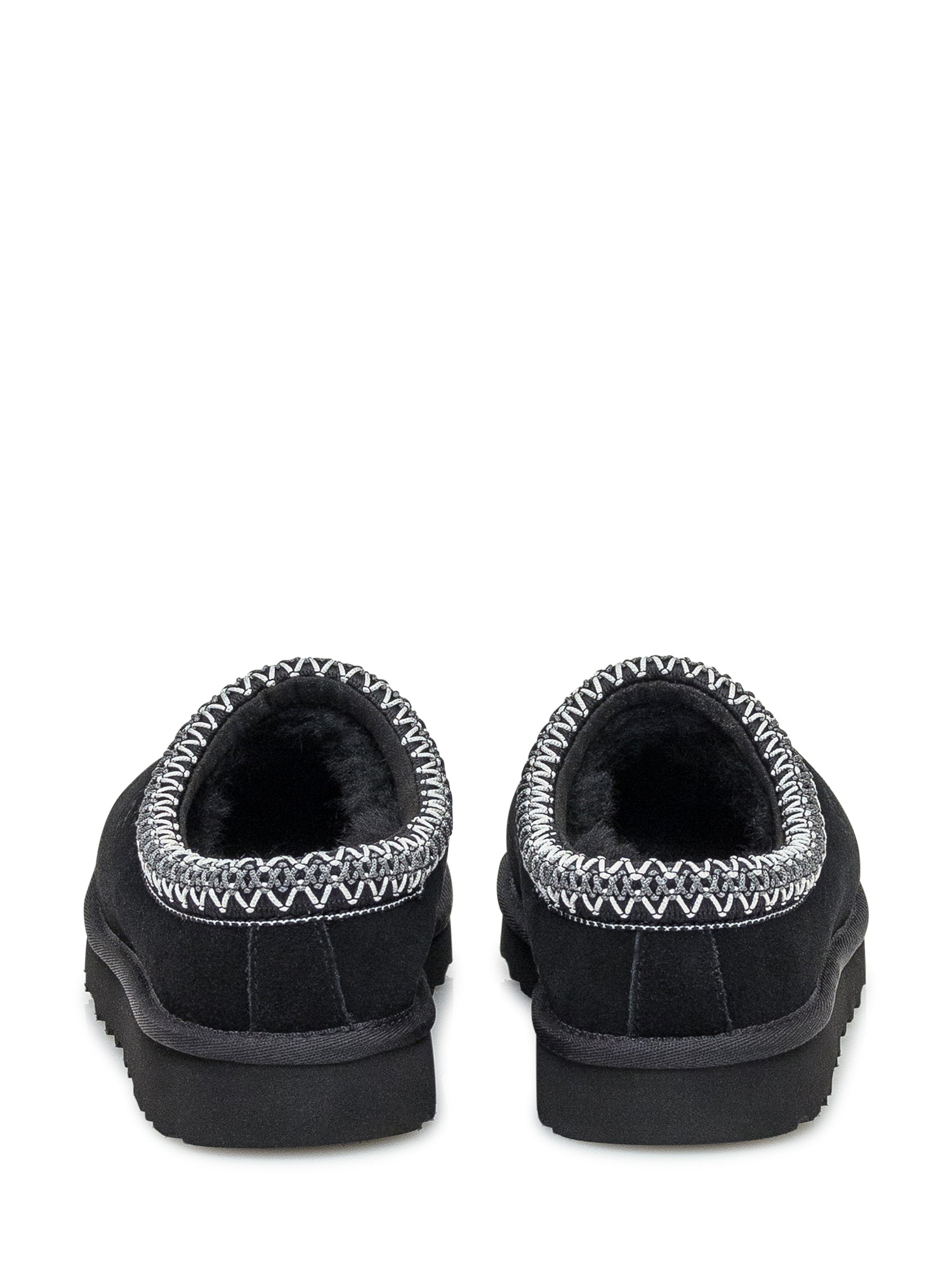 Sabot UGG Tasman in suede nero con bordo ricamato a contrasto e interno in shearling caldo.