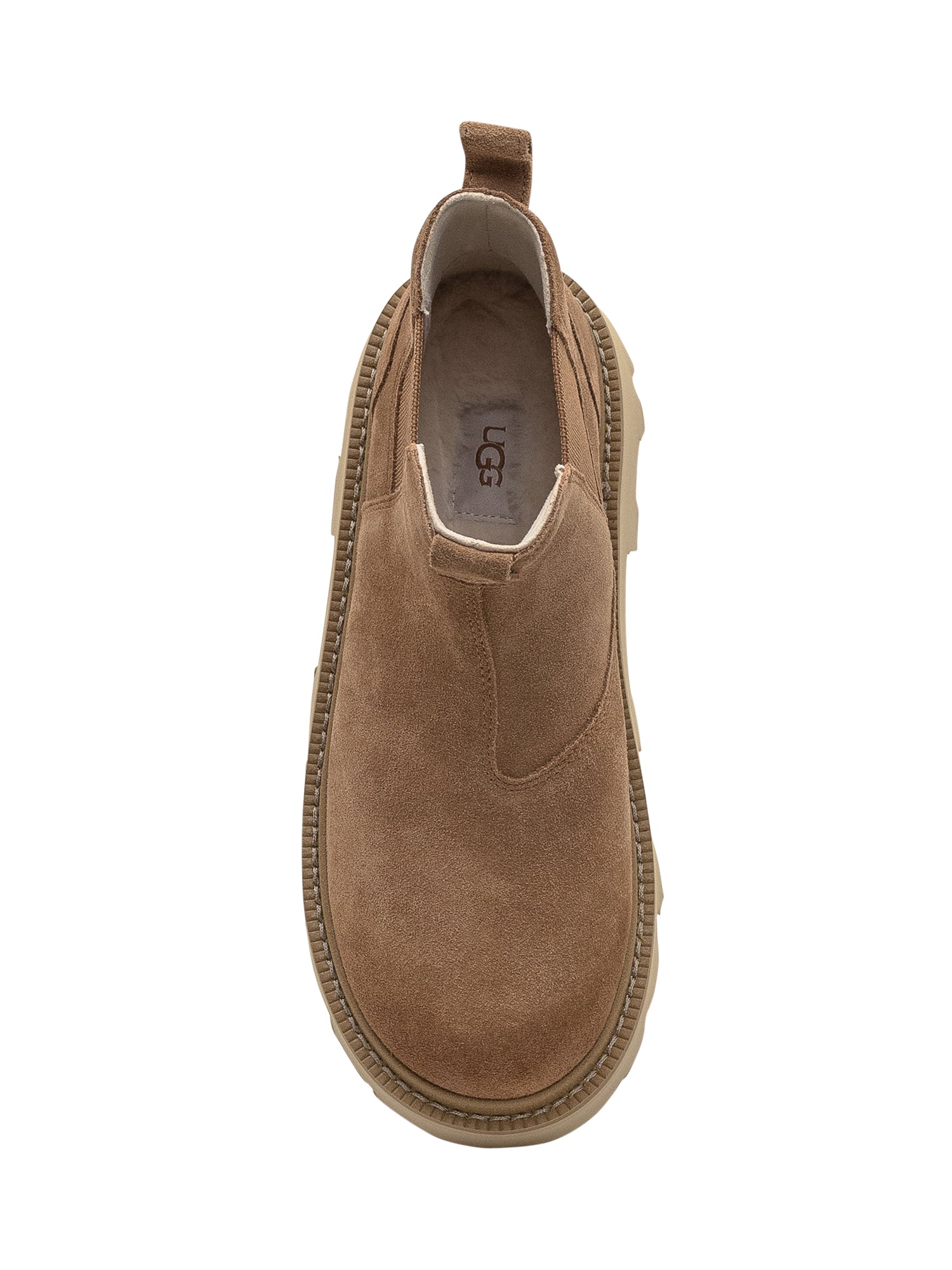 Stivaletti Chelsea UGG in pelle scamosciata marrone con inserti elastici laterali e suola chunky dentellata.