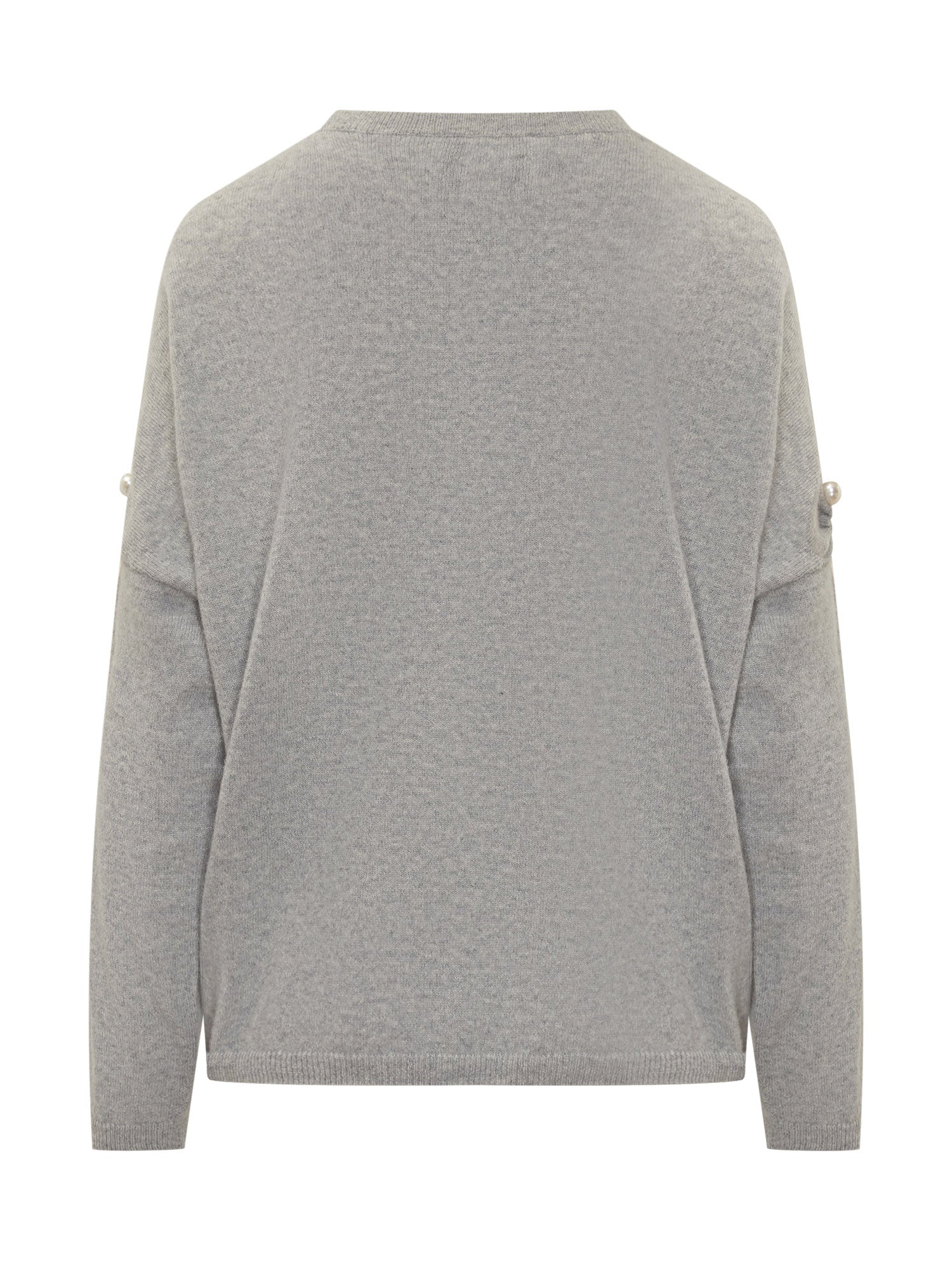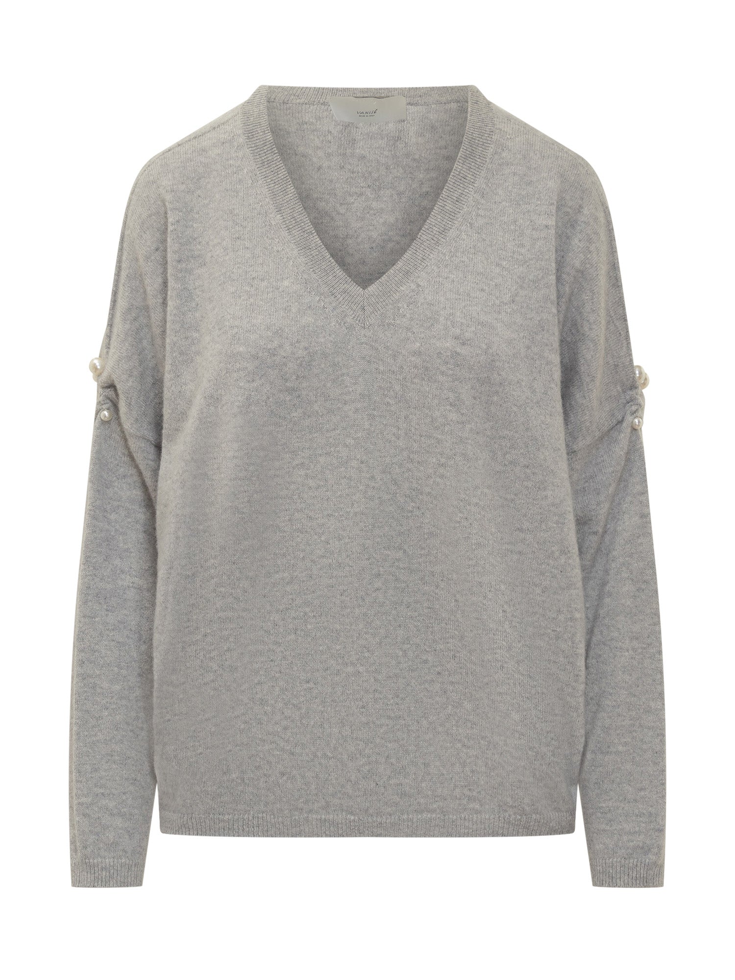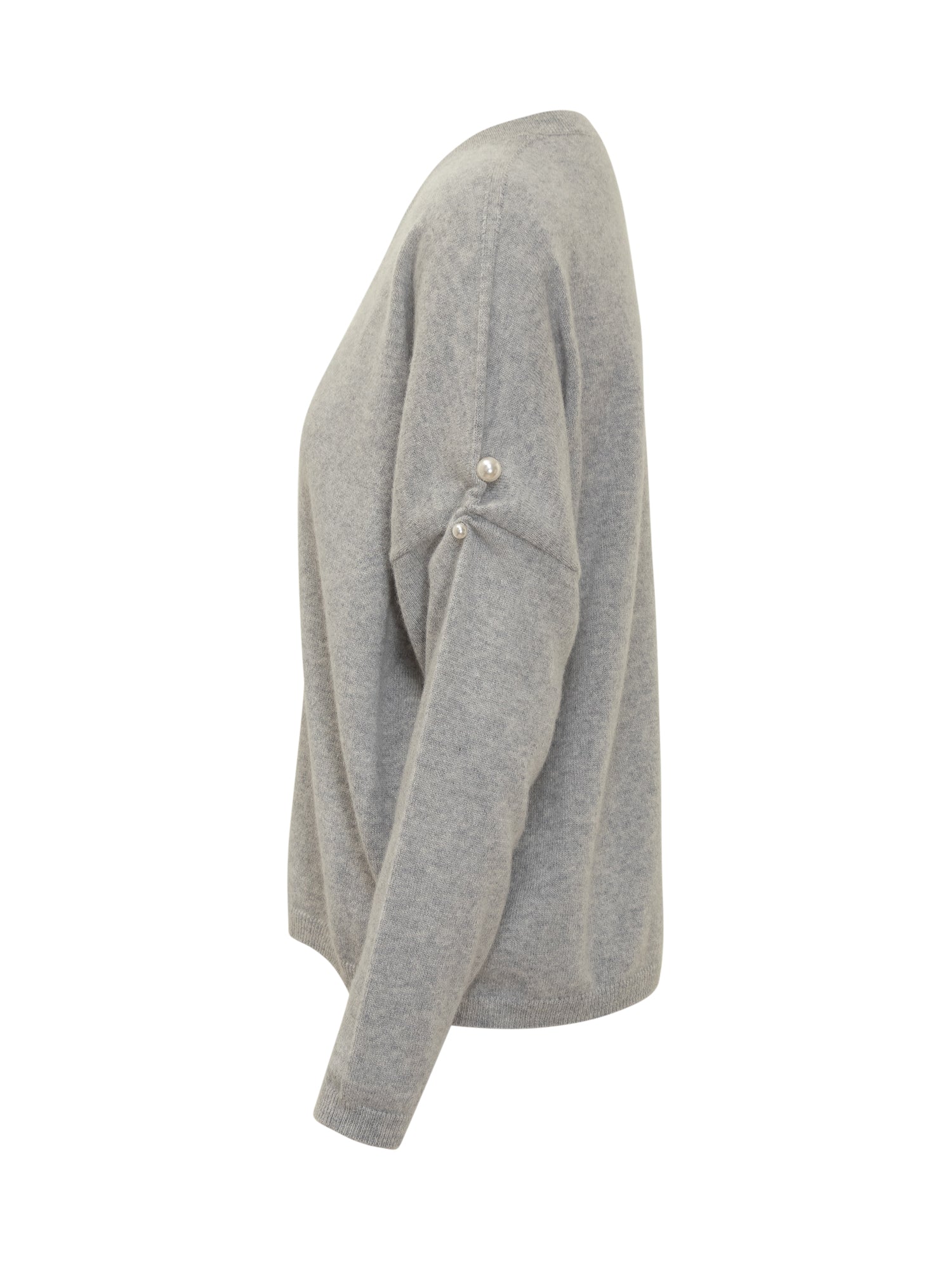 Maglione Vanisè in morbido tessuto grigio con scollo a V. Le maniche presentano eleganti dettagli con bottoni effetto perla.