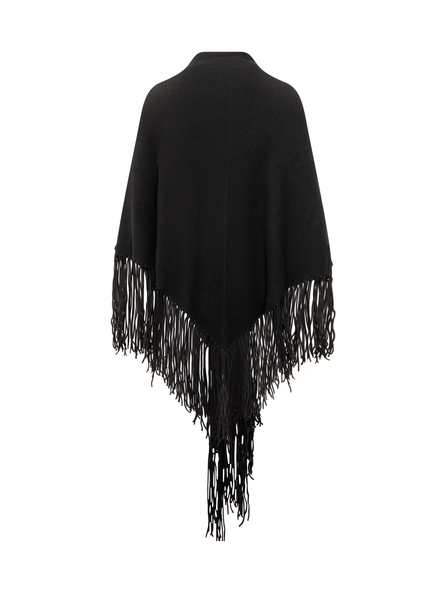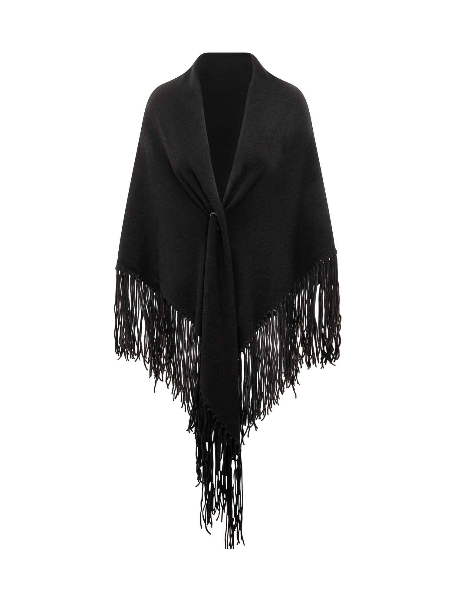 Poncho Vanise in morbido cashmere nero con frange lunghe e chiusura frontale discreta.