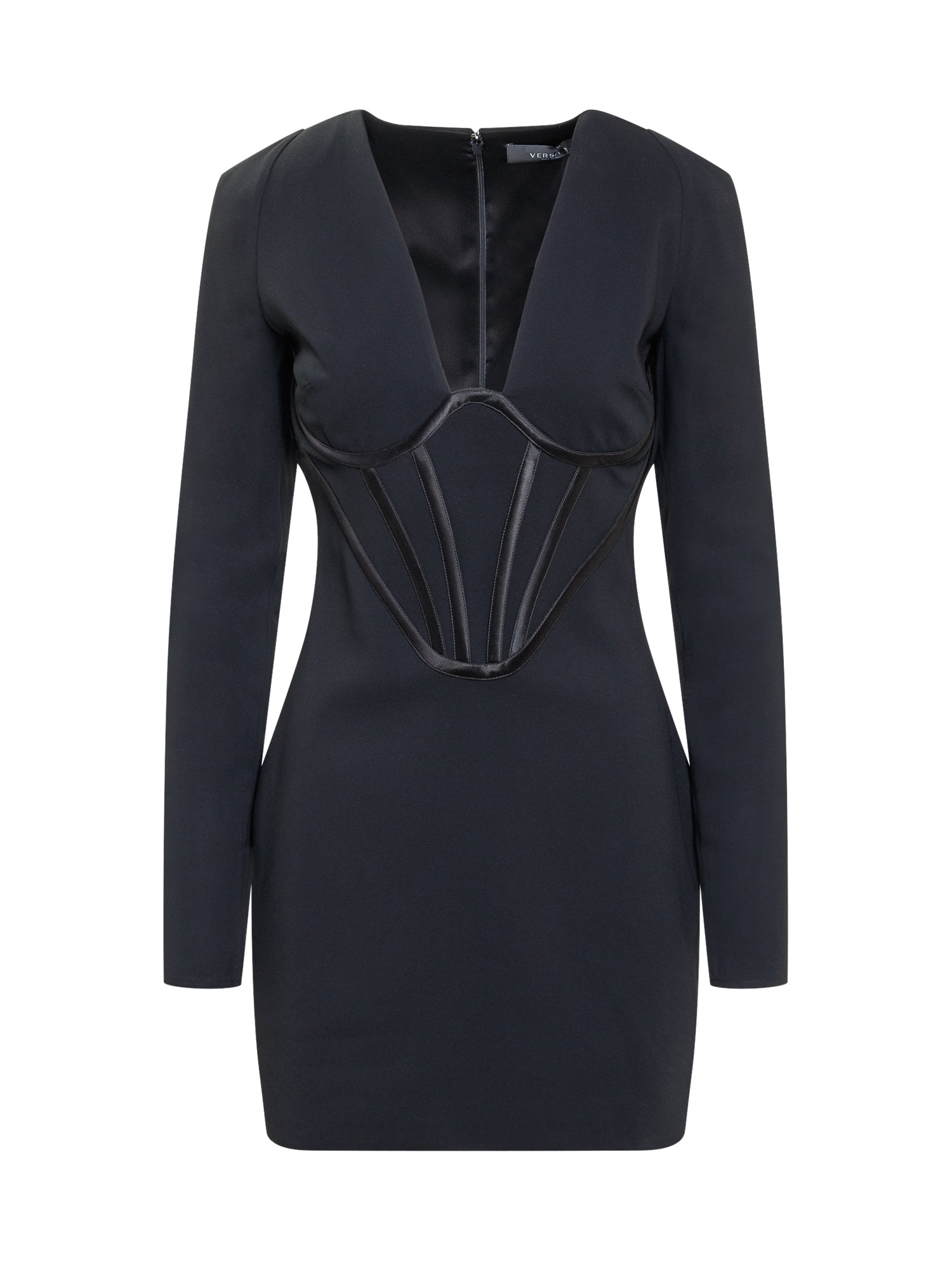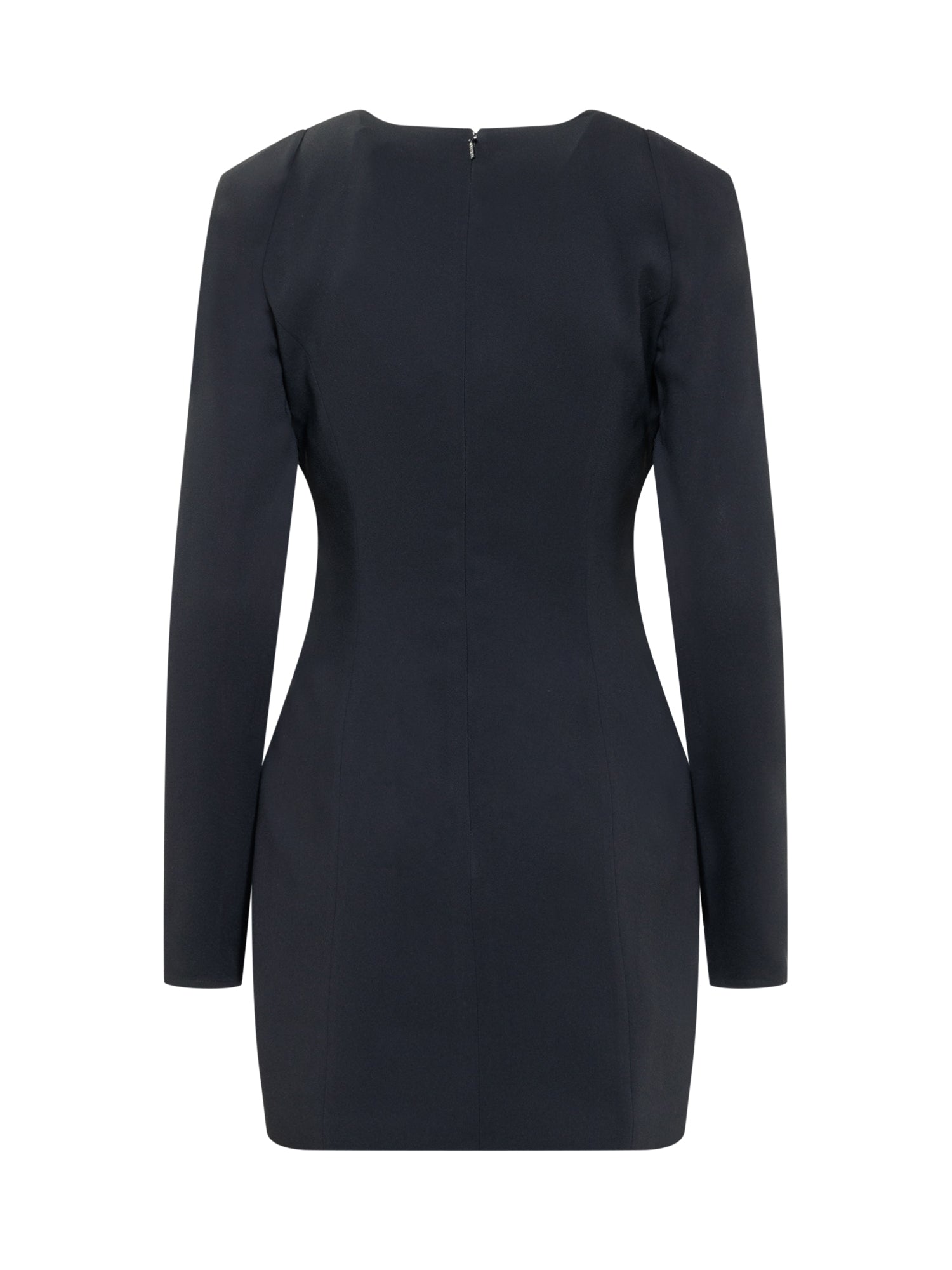 Abito nero a maniche lunghe. Chiusura posteriore con zip. Scollo sul davanti.