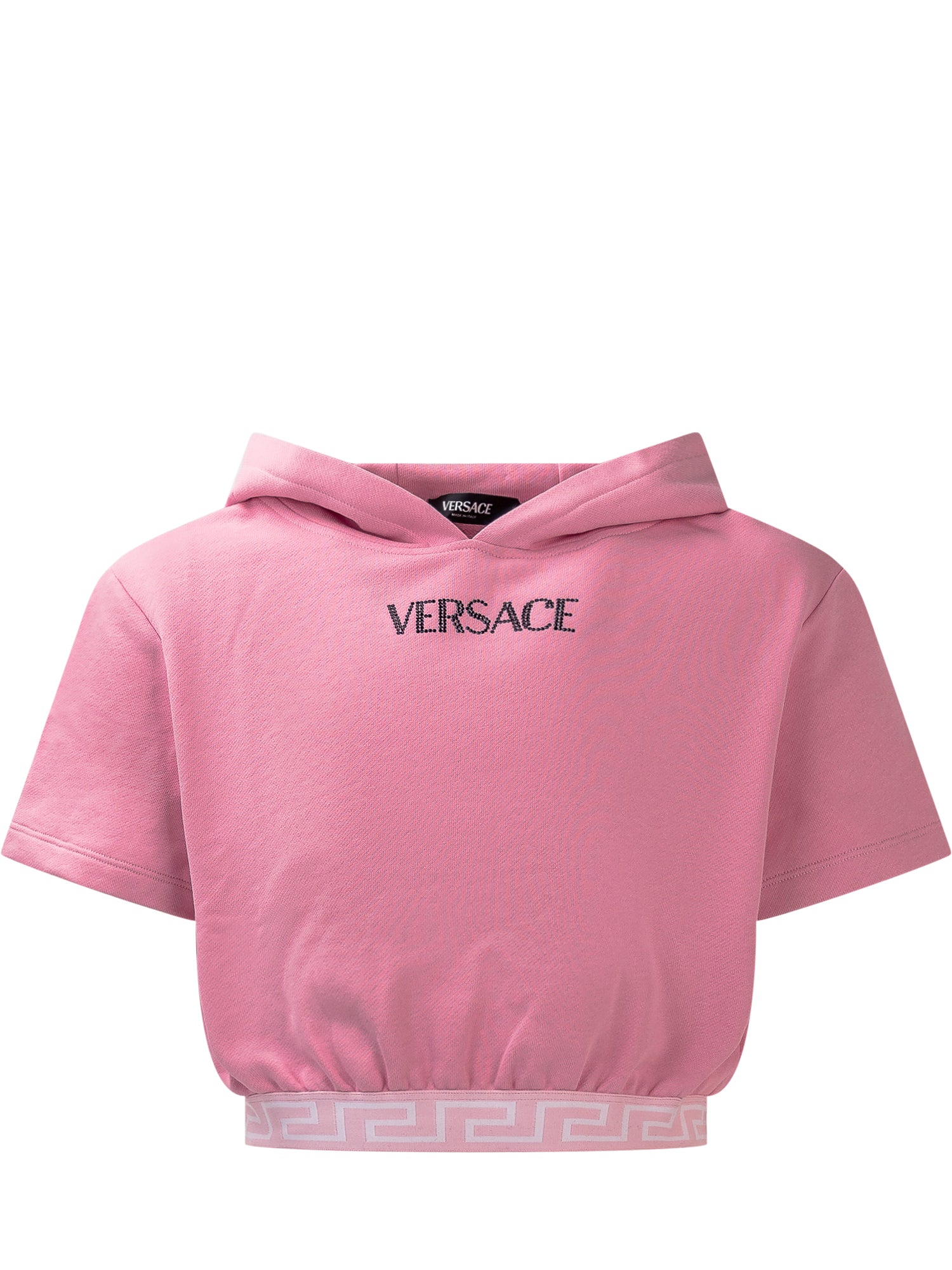 Felpa corta rosa a maniche corte con cappuccio. Elastico Greca sul bordo. Logo Versace con strass sul davanti.