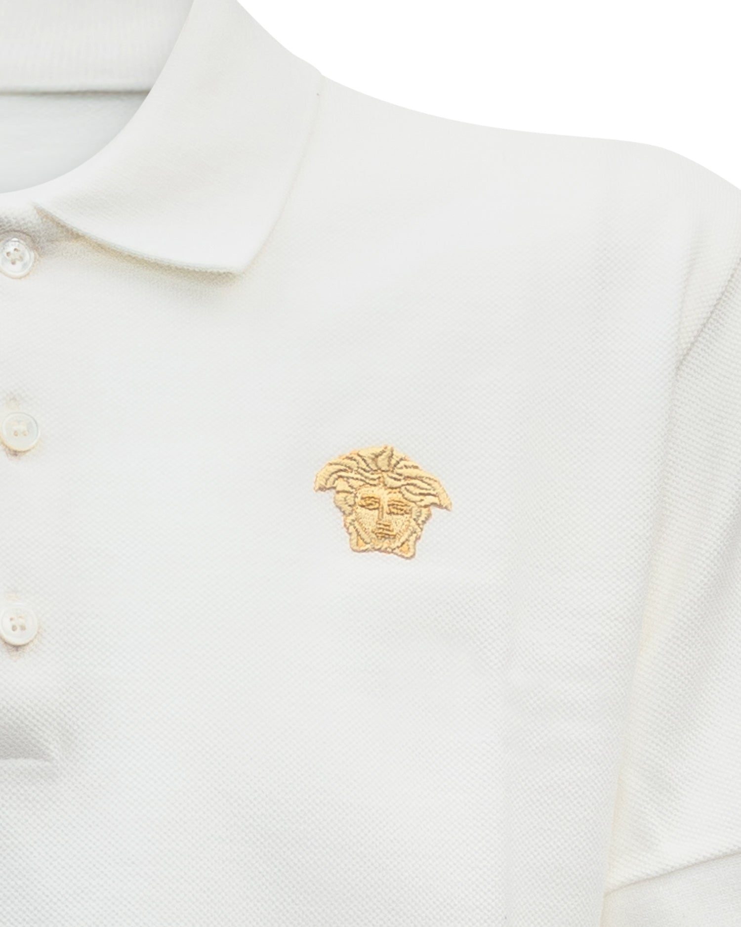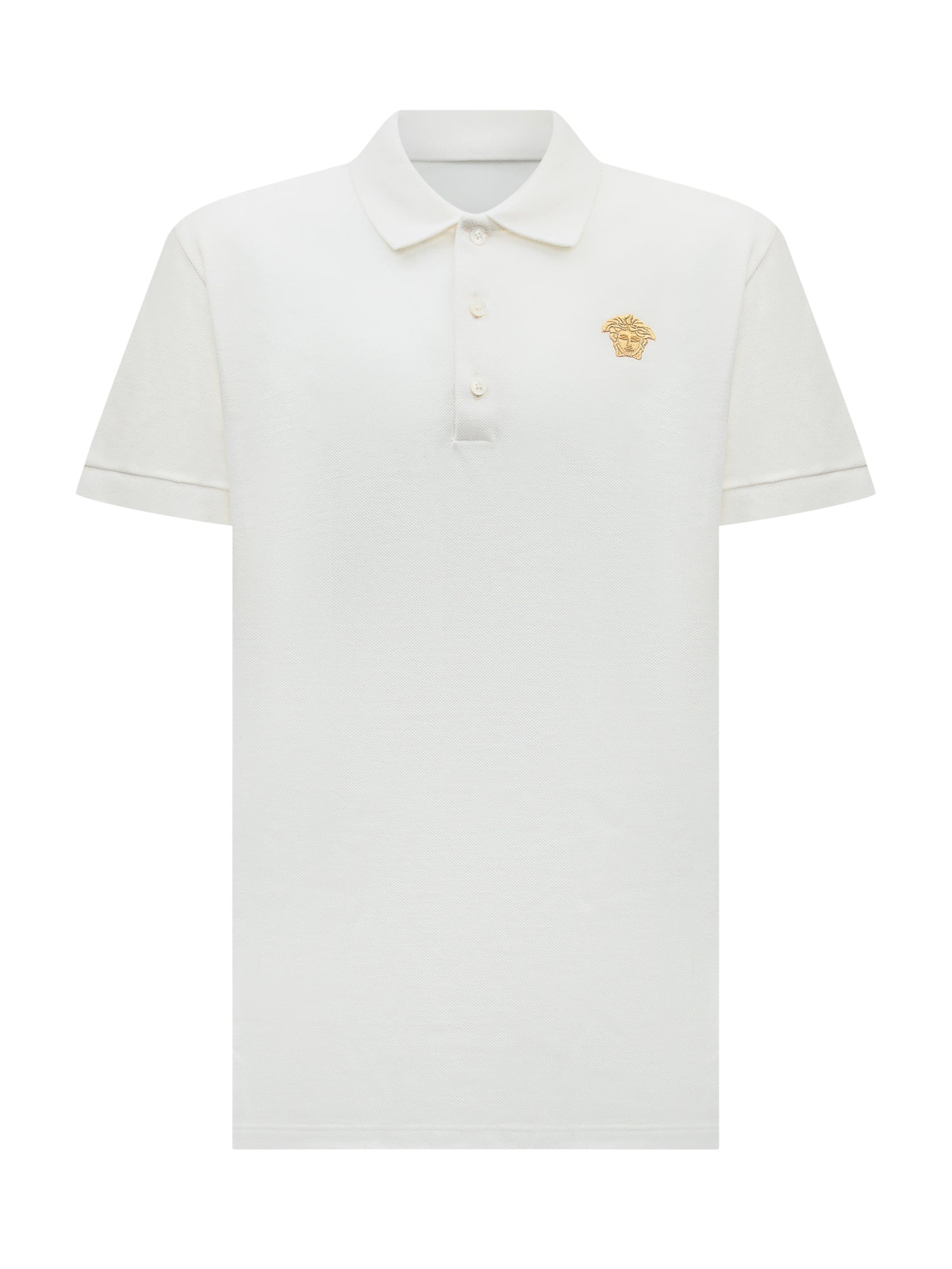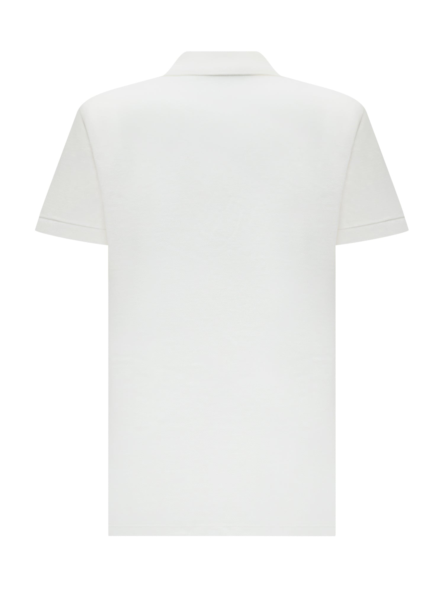 Polo girocollo bianca con colletto a punta. Logo in alto a sinistra.