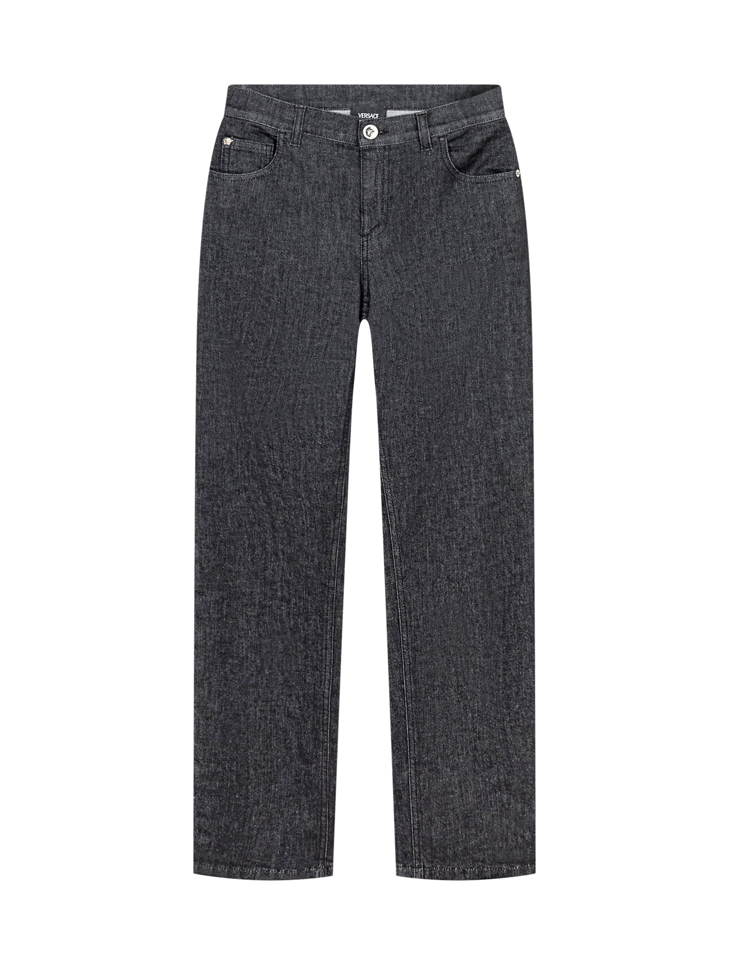 Jeans Versace Kids in denim nero dal taglio dritto, con dettagli iconici e stile versatile.