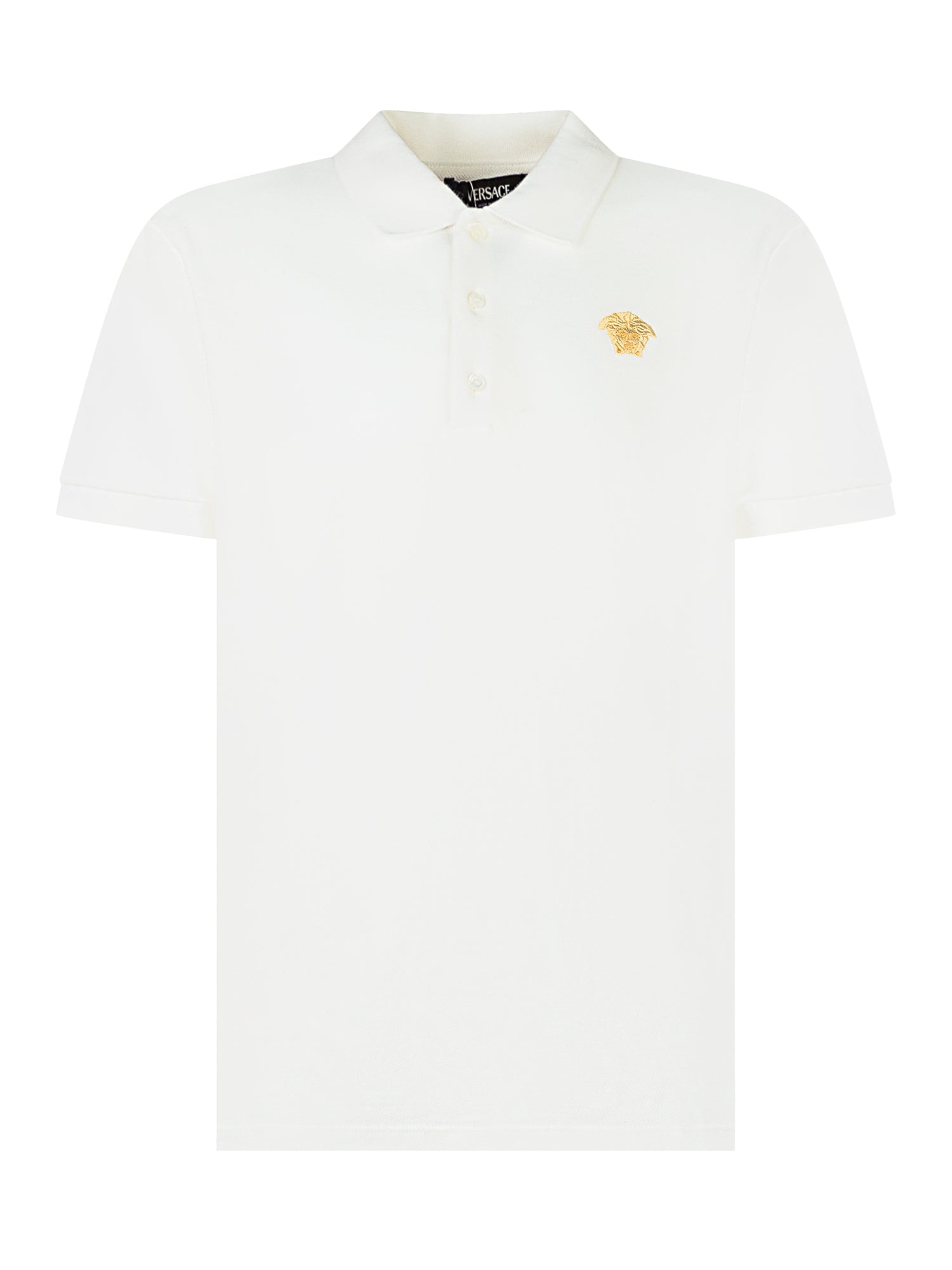 Polo Versace Kids in cotone bianco con logo Medusa ricamato in oro sul petto.