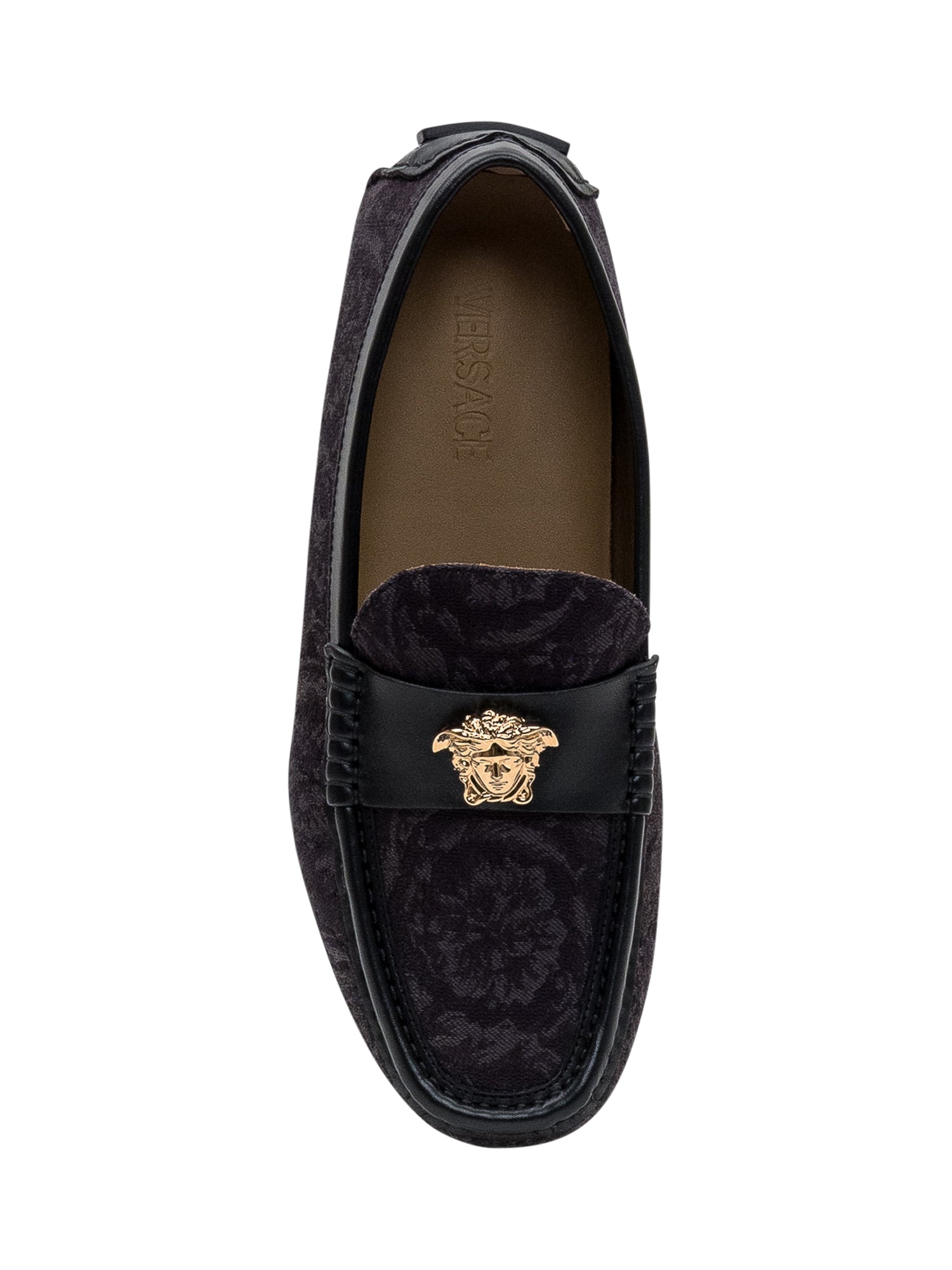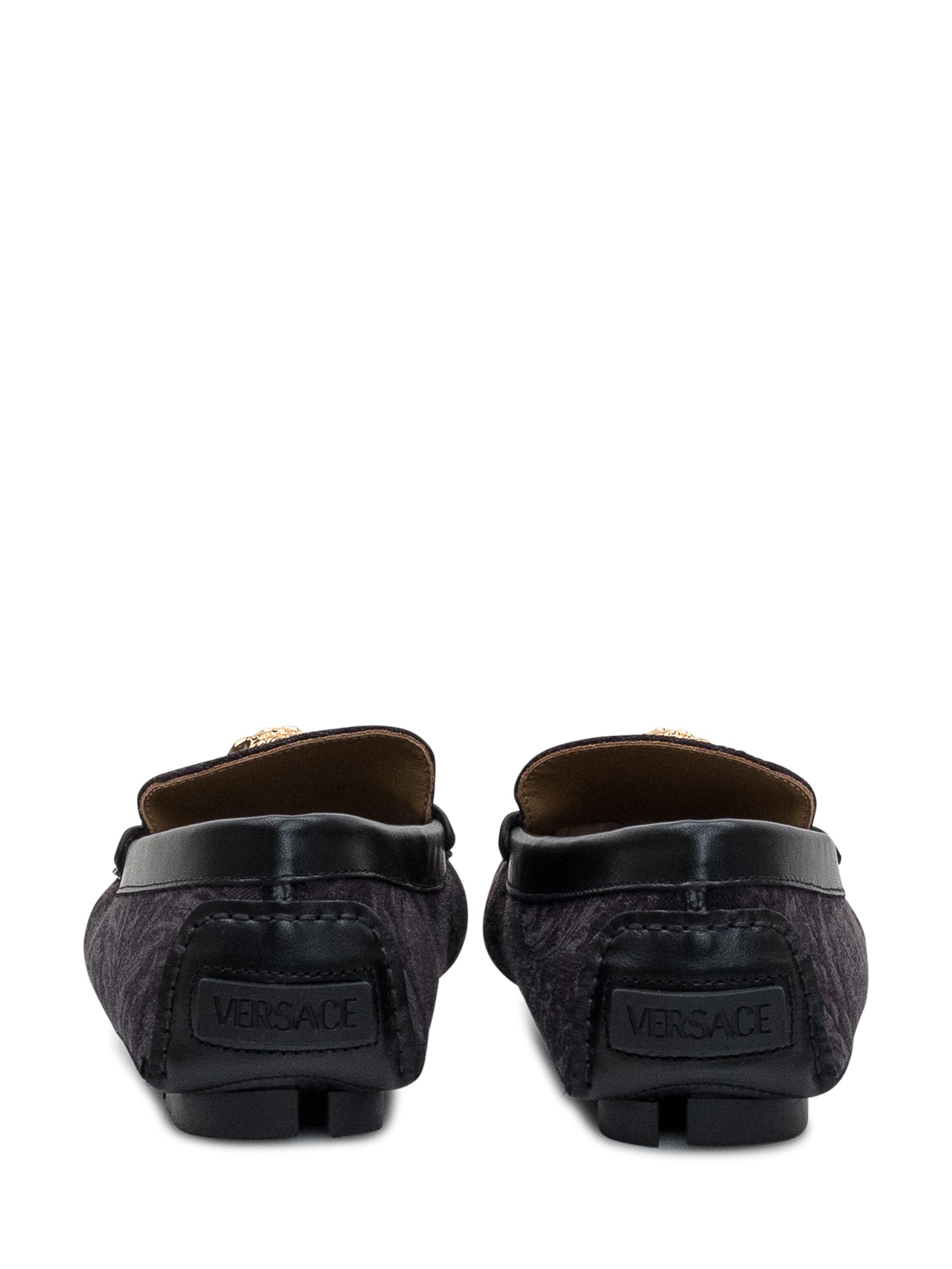 Mocassini driver da uomo Versace in tessuto con motivo barocco e pelle nera, arricchiti dall iconico dettaglio Medusa dorato.