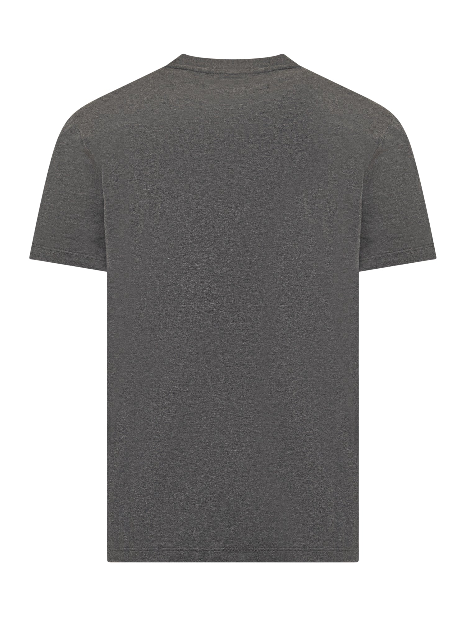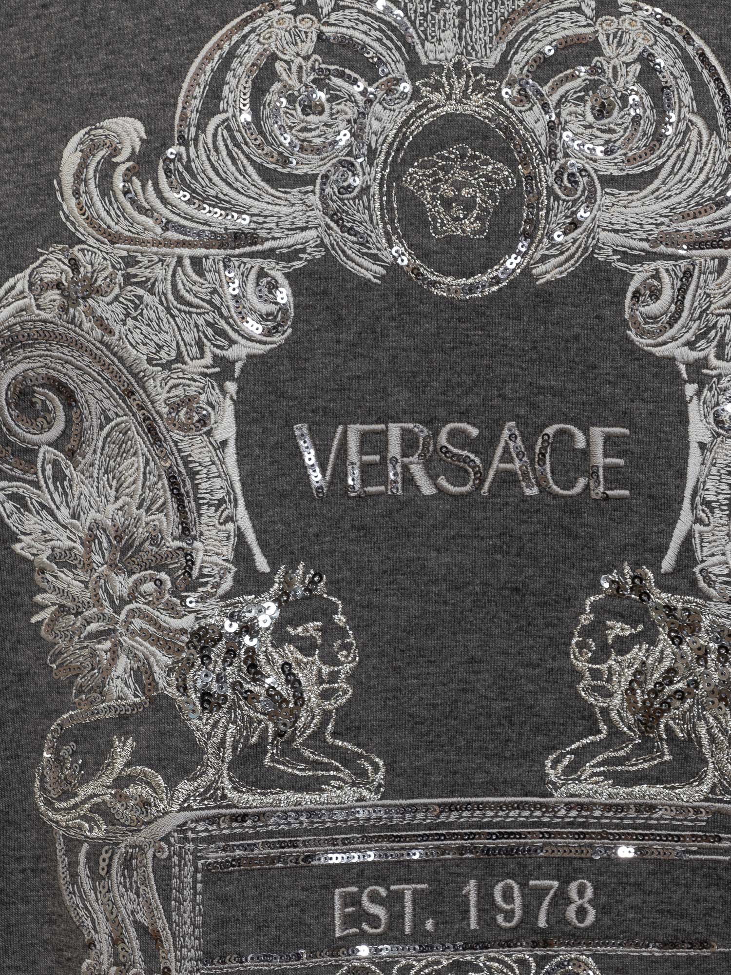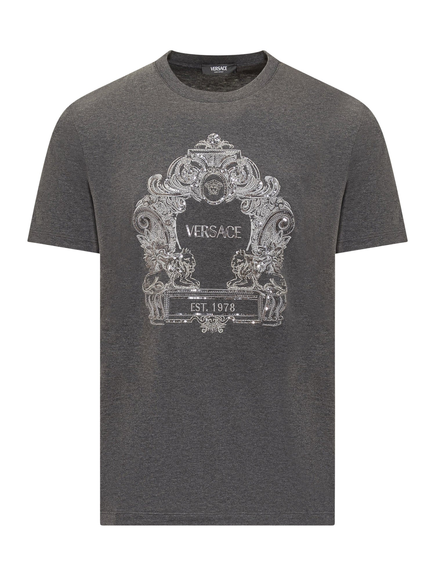 T-shirt a maniche corte in jersey di cotone. Girocollo. Orli a costine. Logo Versace Cartouche ricamato con paillettes.