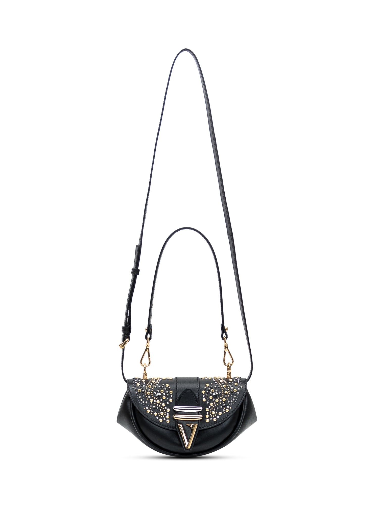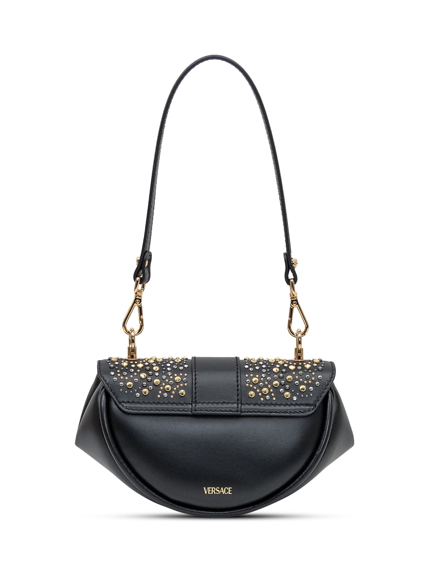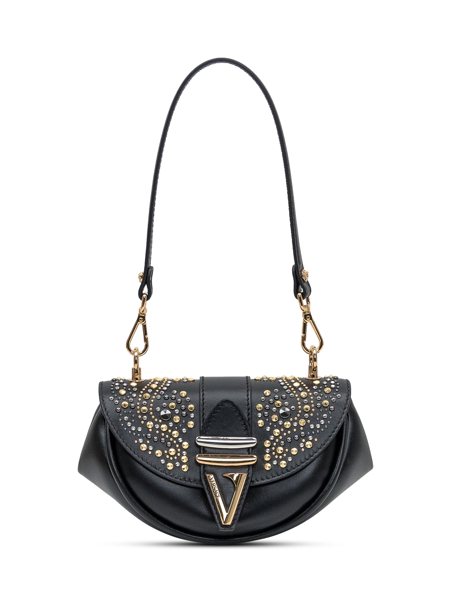 Borsa a spalla Versace in pelle nera con applicazioni di borchie dorate e argentate.
