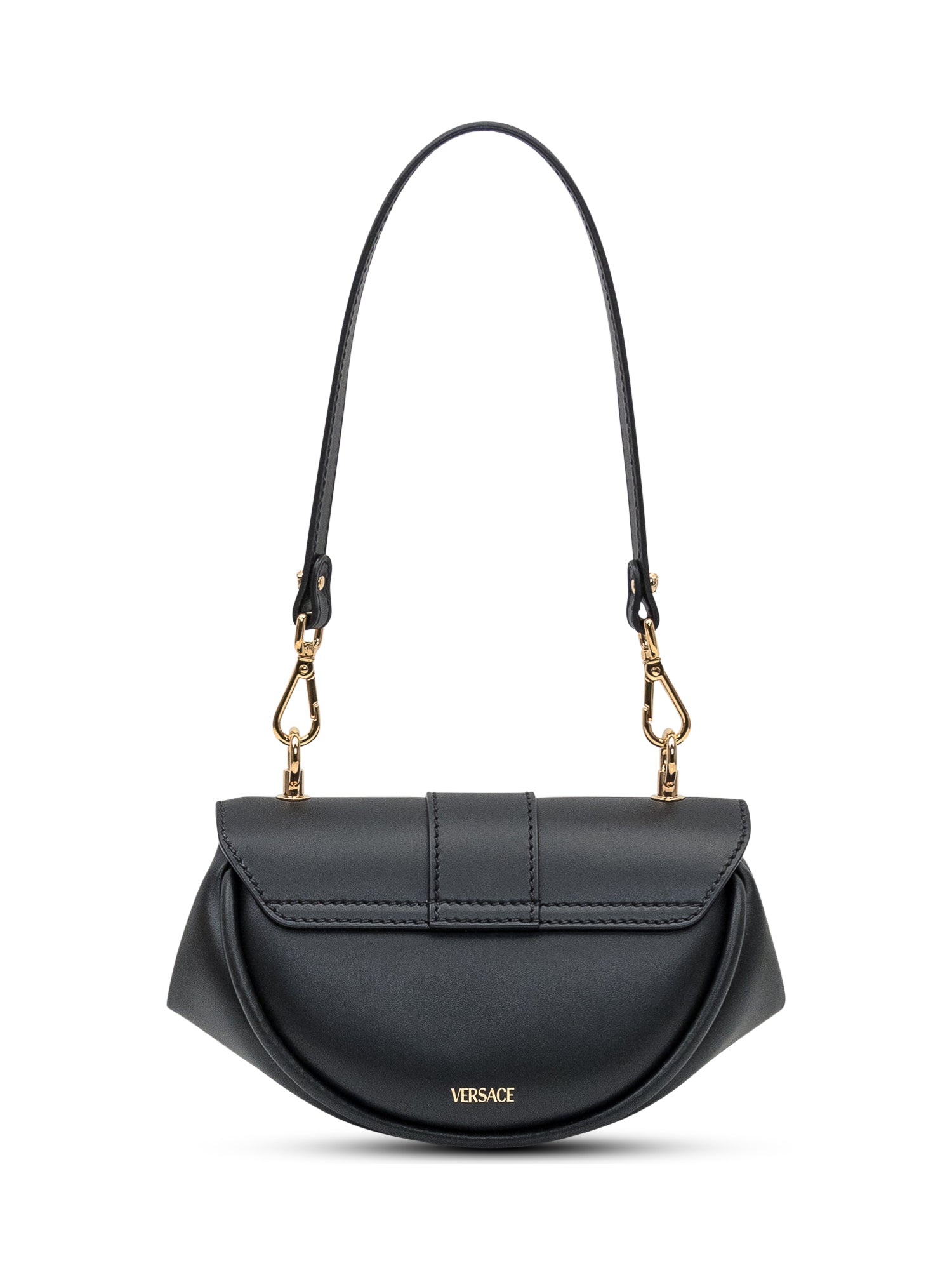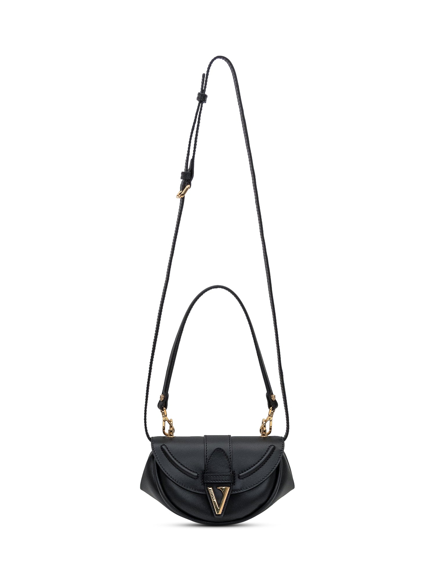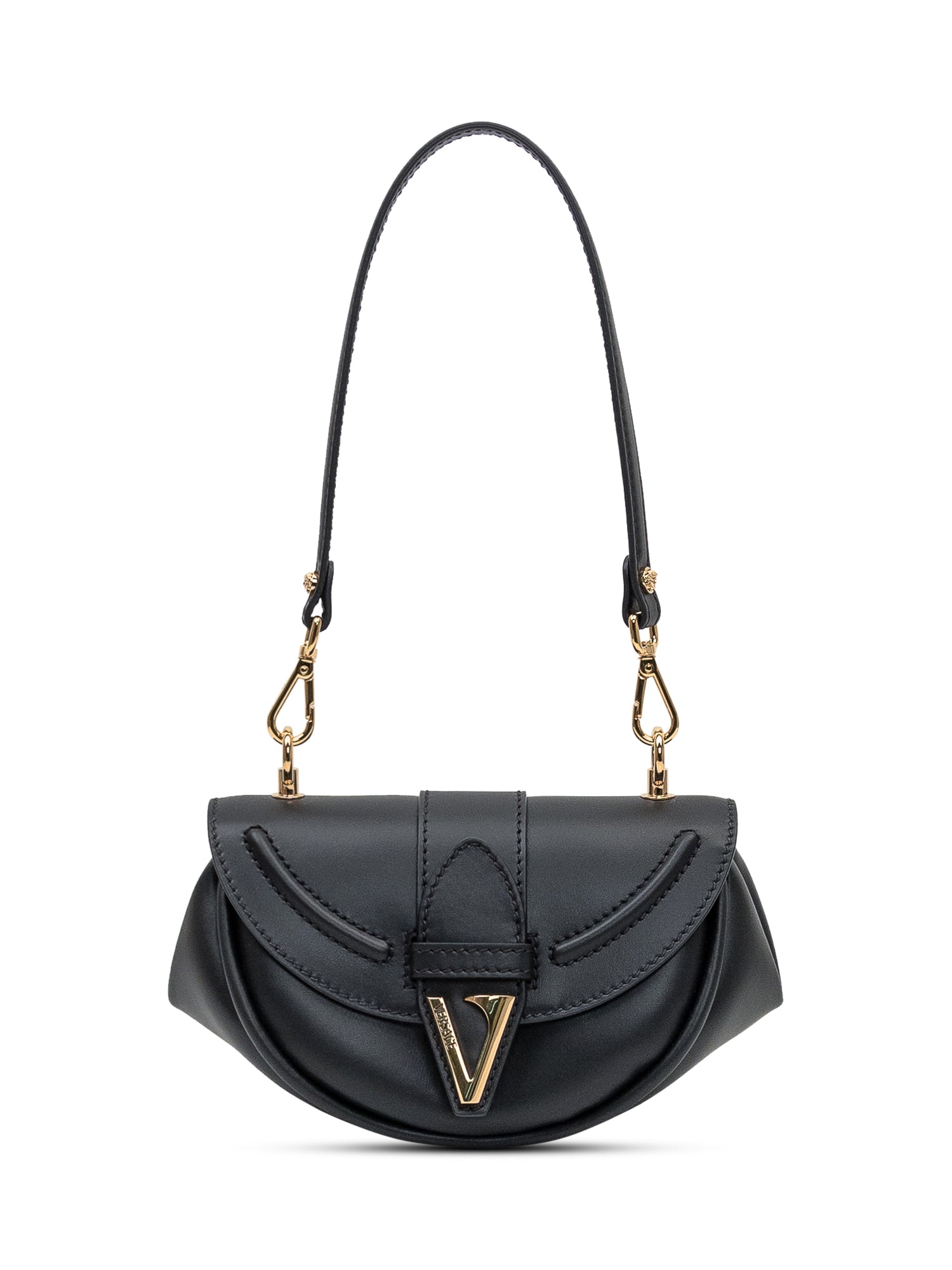 Borsa a spalla Versace in pelle nera con chiusura a patta e logo V dorato.