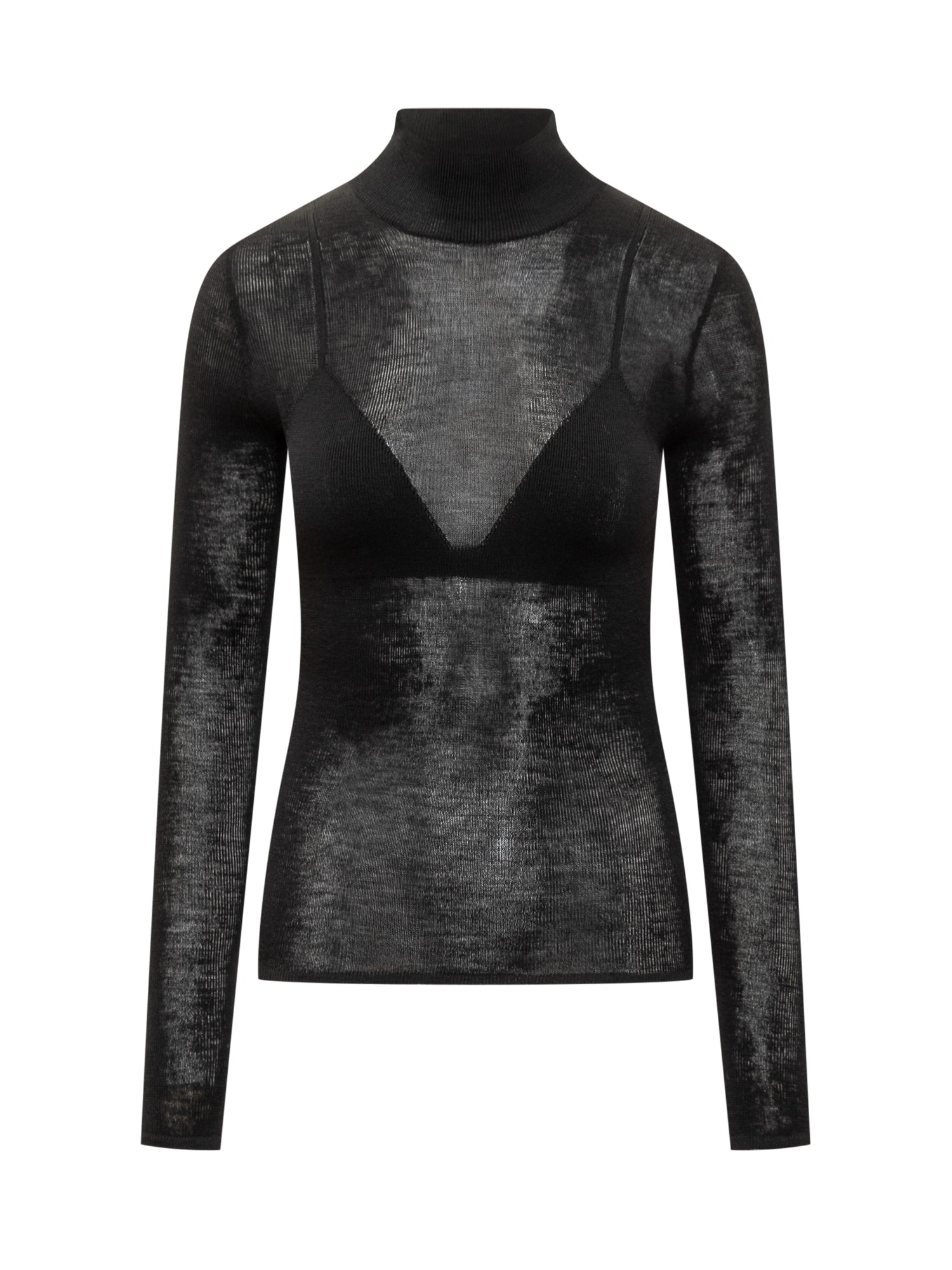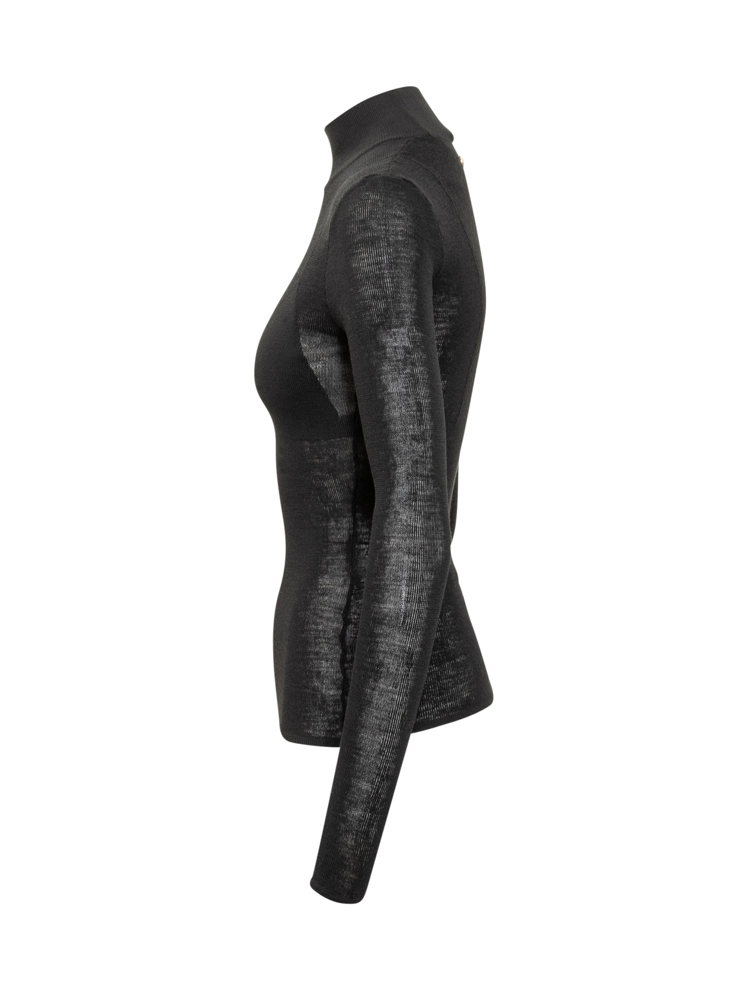 Dolcevita Versace in maglia leggera trasparente nera, dal design slim con collo alto e maniche lunghe.