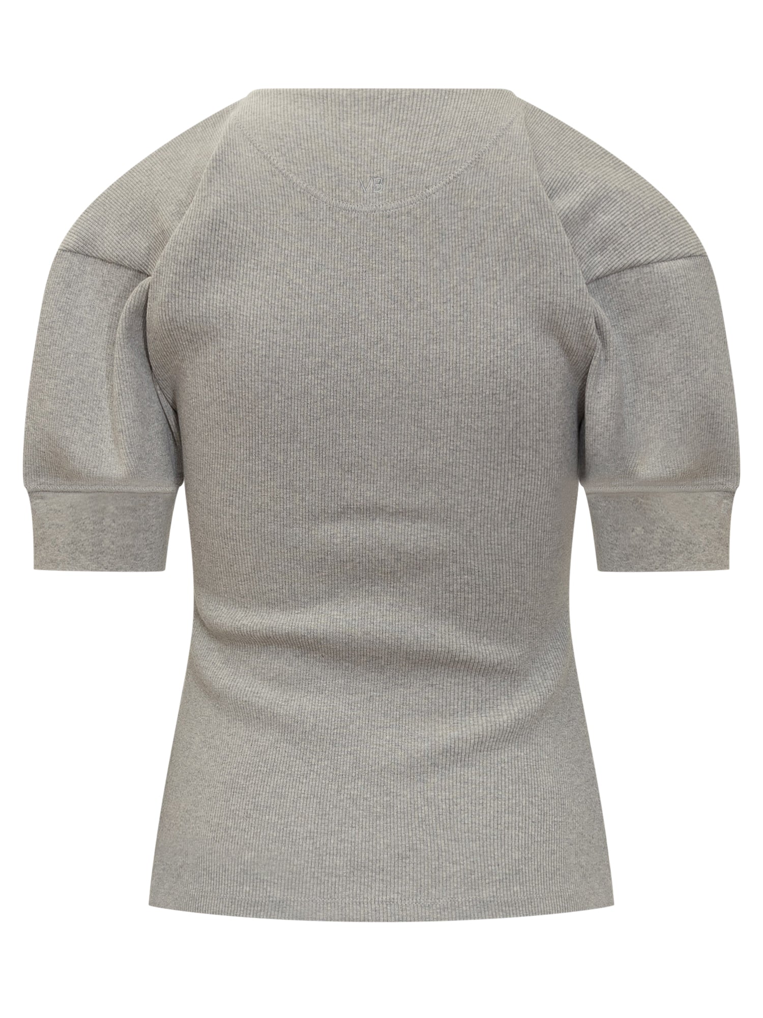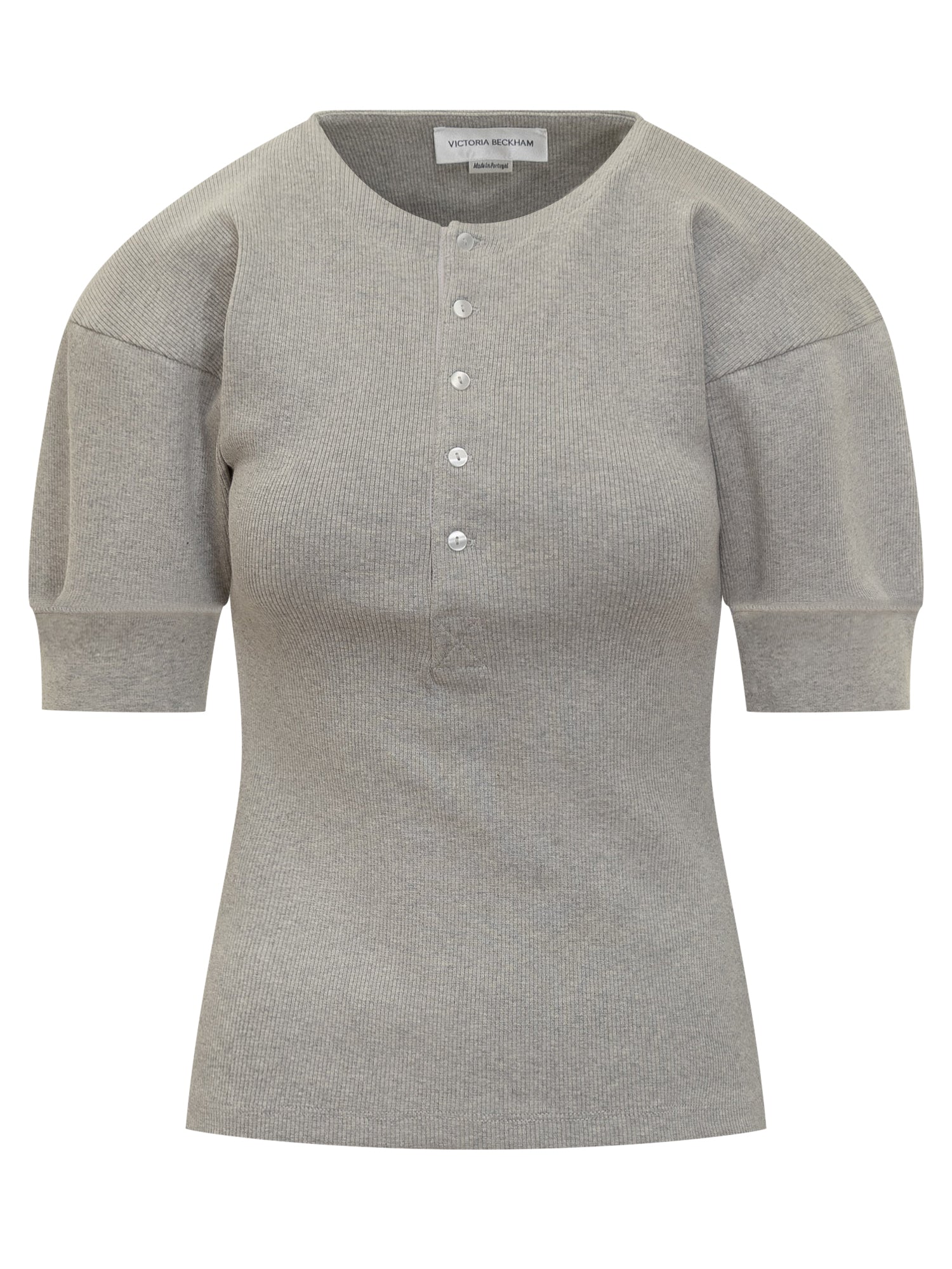 Maglia Victoria Beckham in cotone grigio a costine con maniche corte e abbottonatura frontale.
