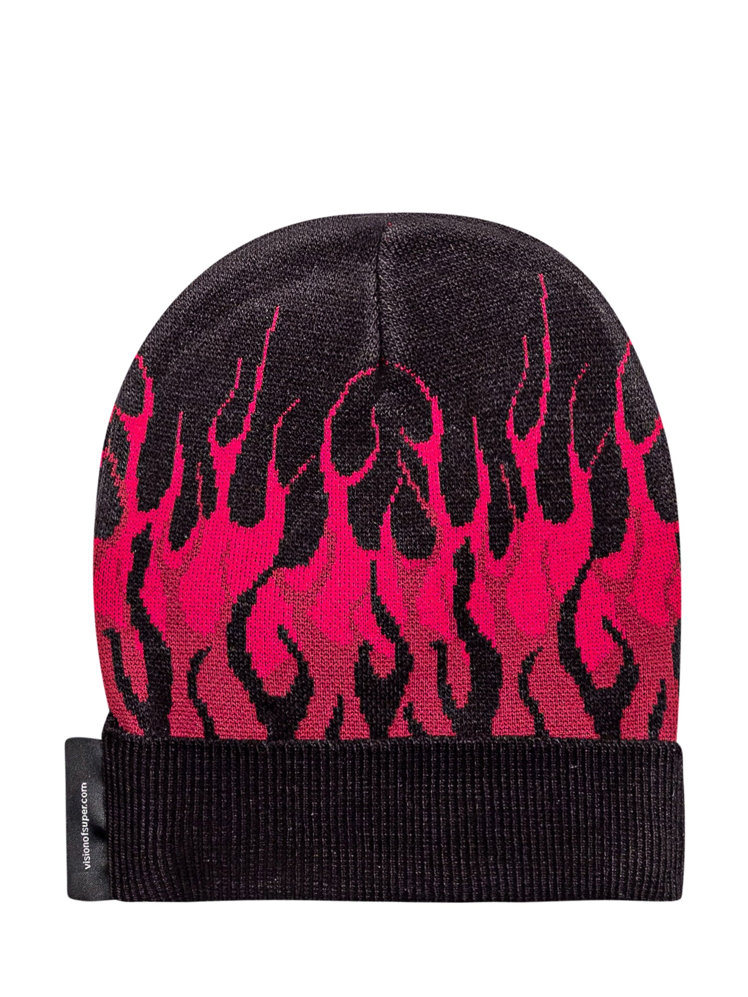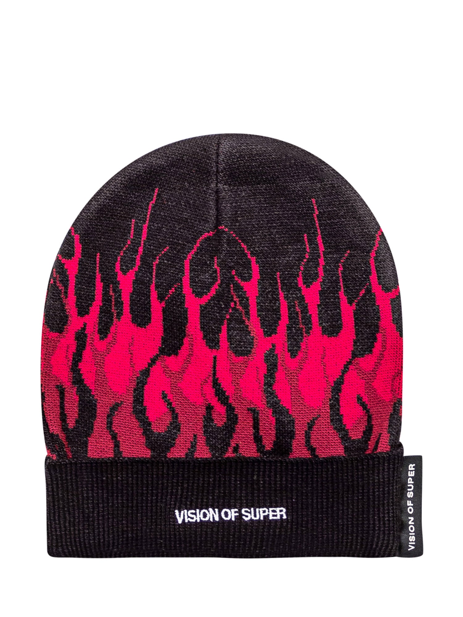 Cuffia nera con fiamme rosse in jacquard. Etichetta logo sul lato. Logo ricamato sul davanti.