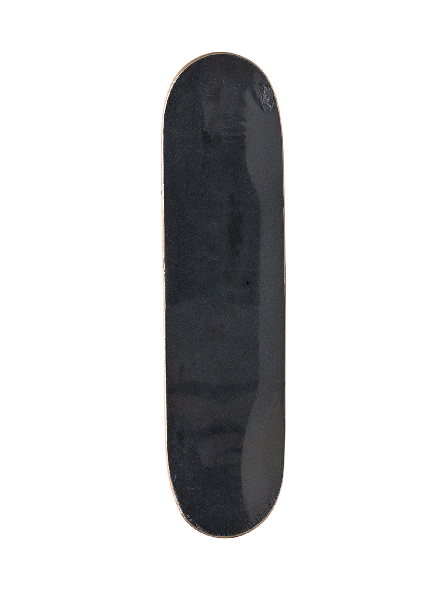 Skateboard in legno. Effetto fiamme spray rosse. Logo bianco .