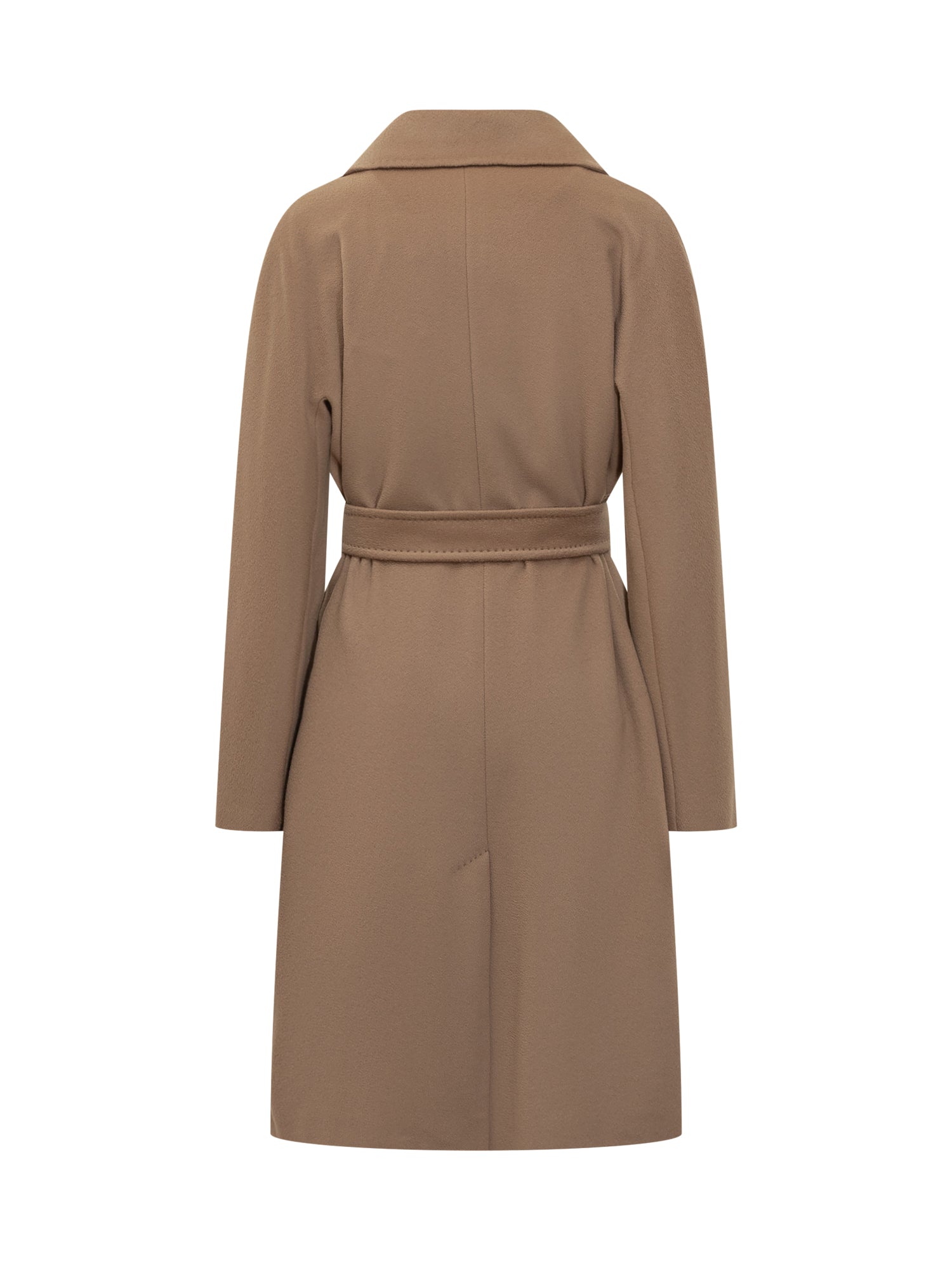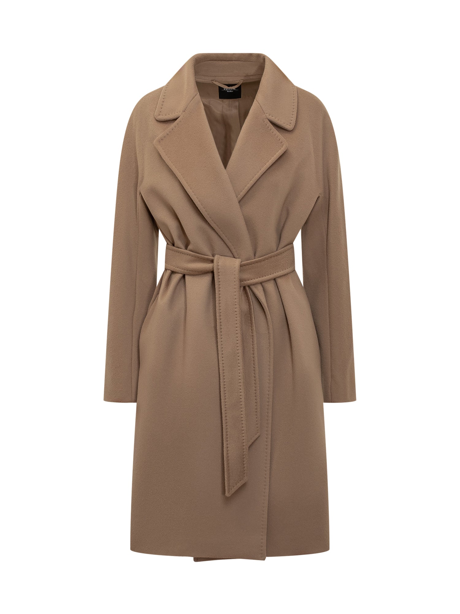 Elegante cappotto Weekend Max Mara in lana color cammello, corto con cintura in vita e rever classico.