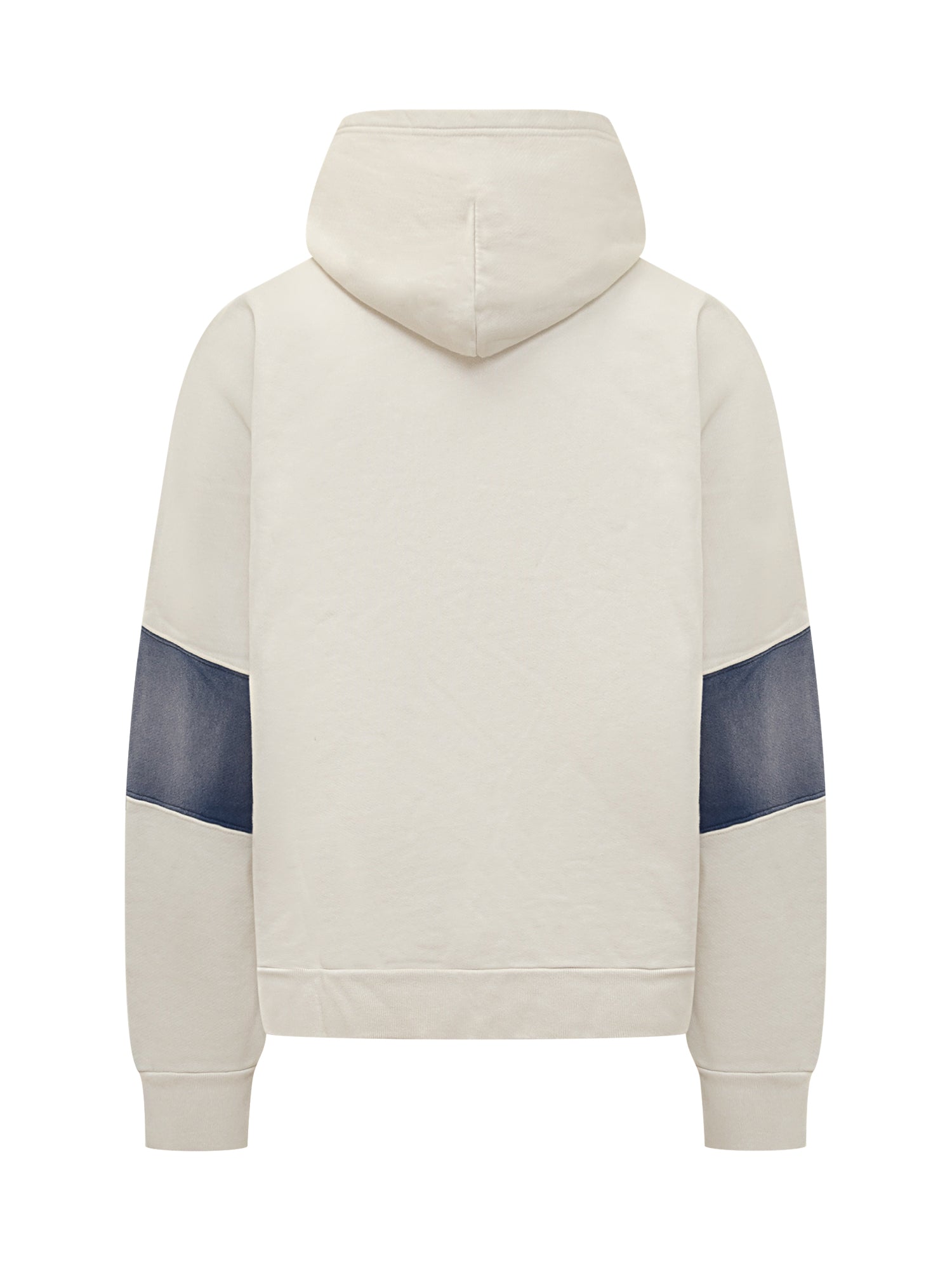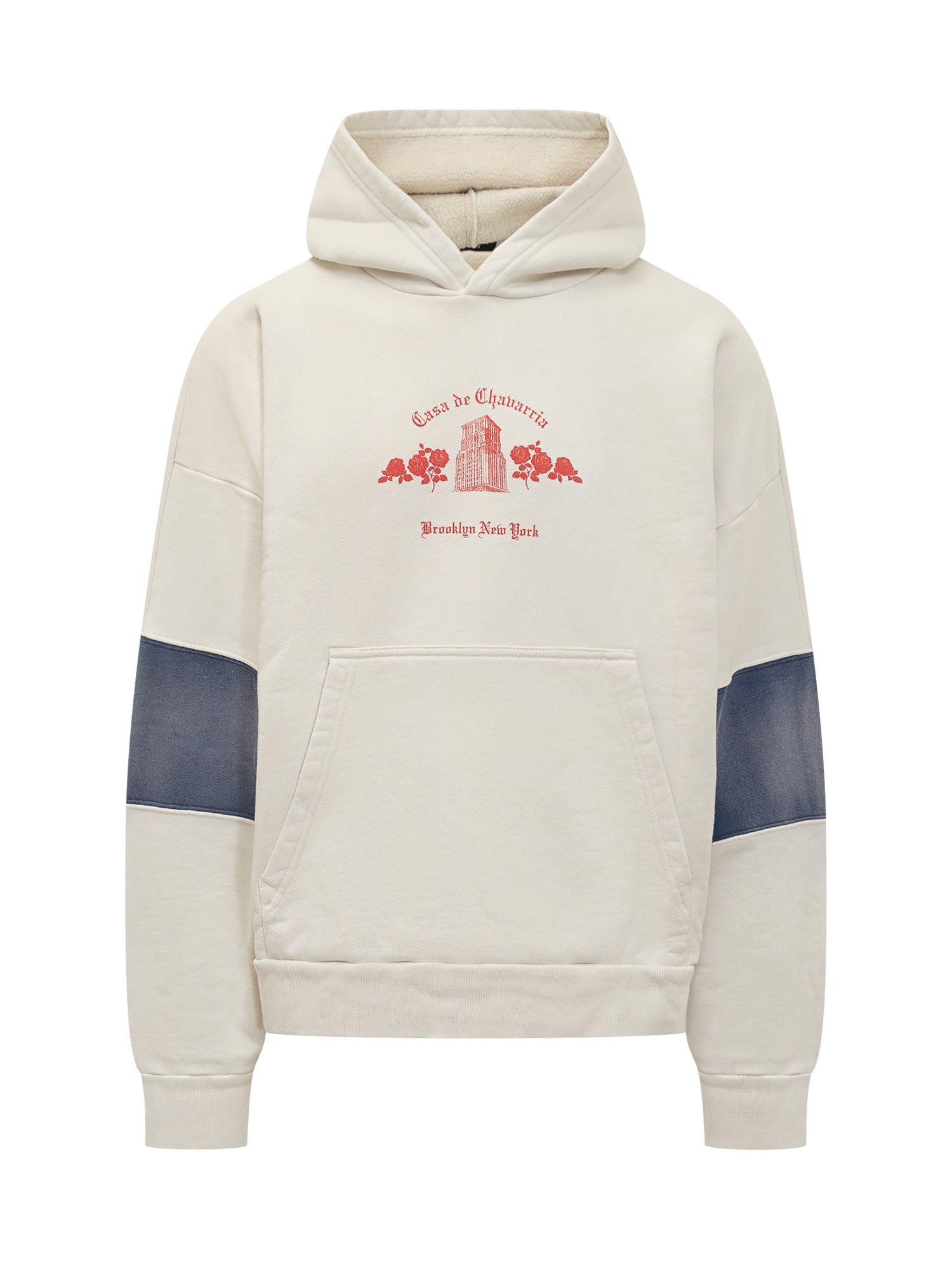 Felpa con cappuccio Willy Chavarria in cotone beige con stampa rossa Casa de Chavarría e dettagli blu sulle maniche. Linea oversize e stile urbano per un look casual e distintivo.