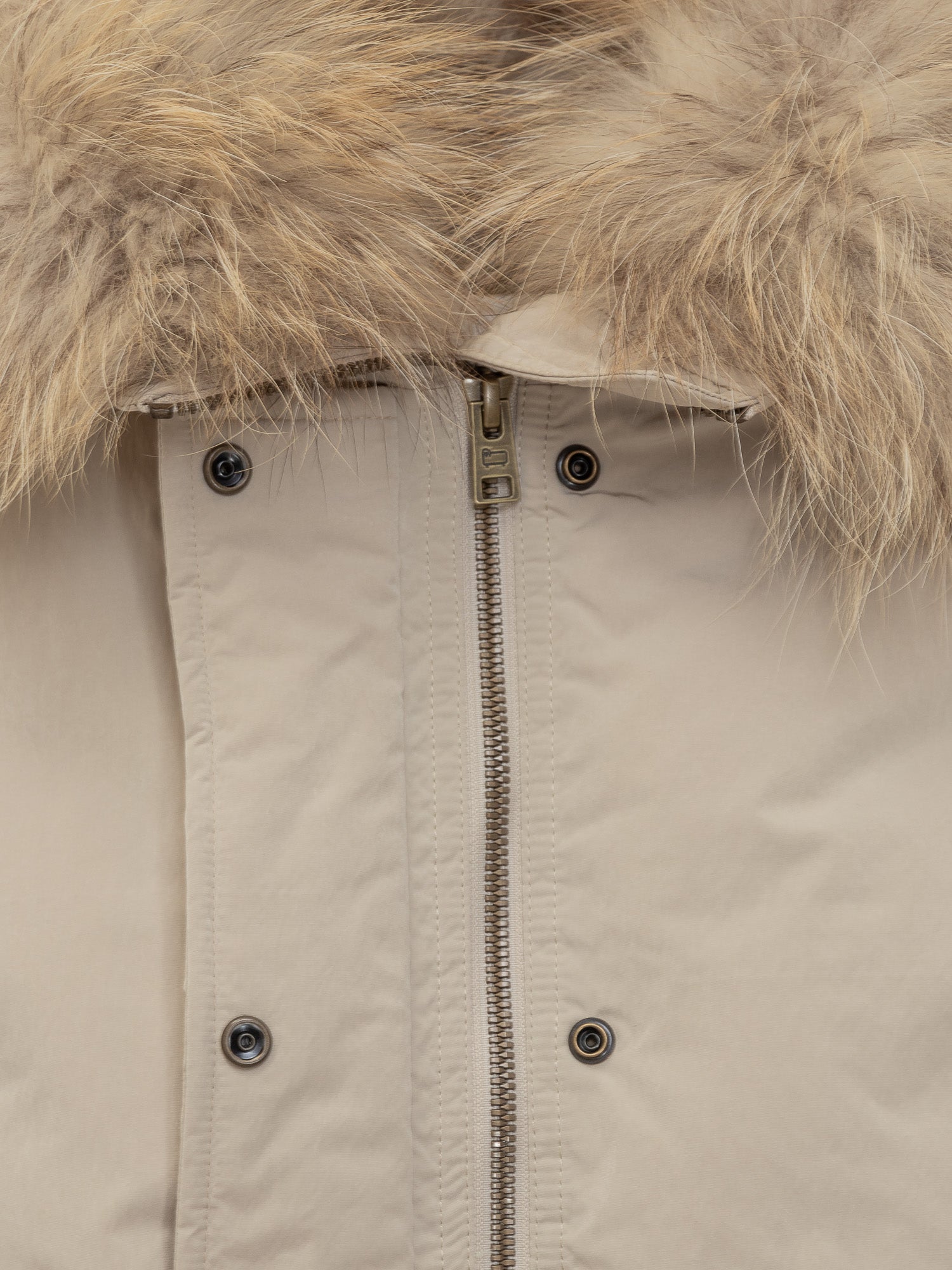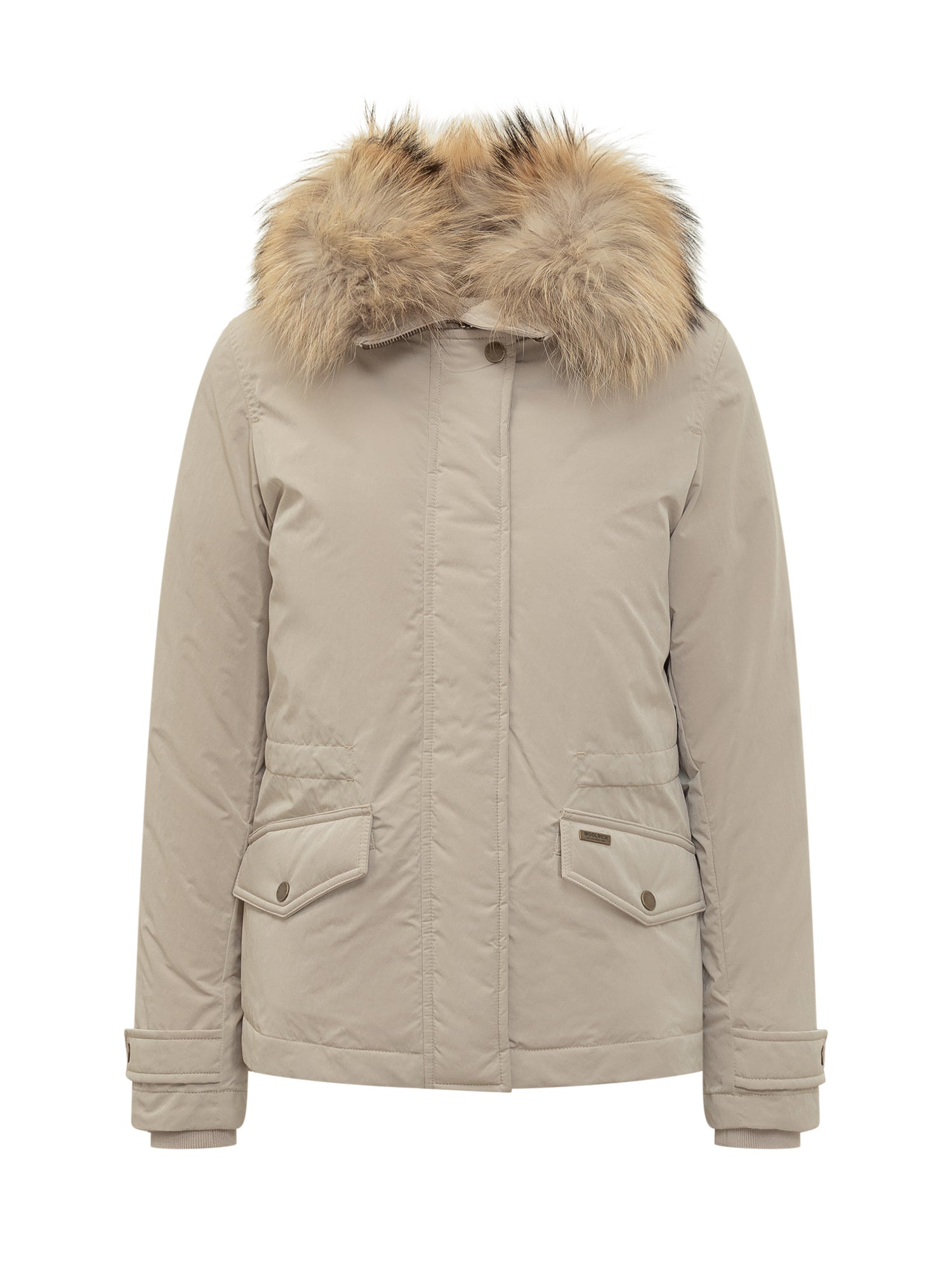 Parka corto Woolrich Grace Fur in beige, con cappuccio bordato in pelliccia e tasche con pattina.