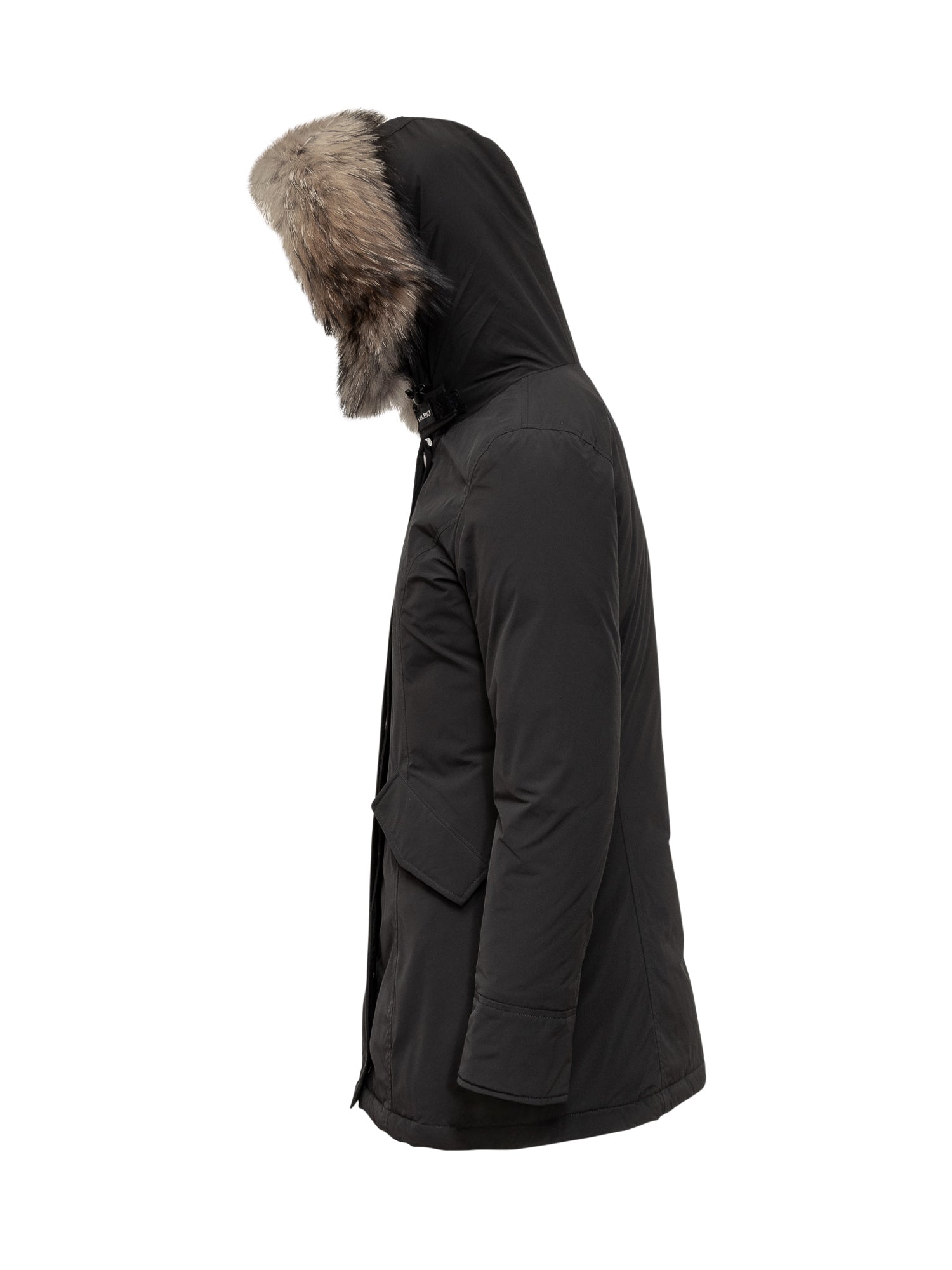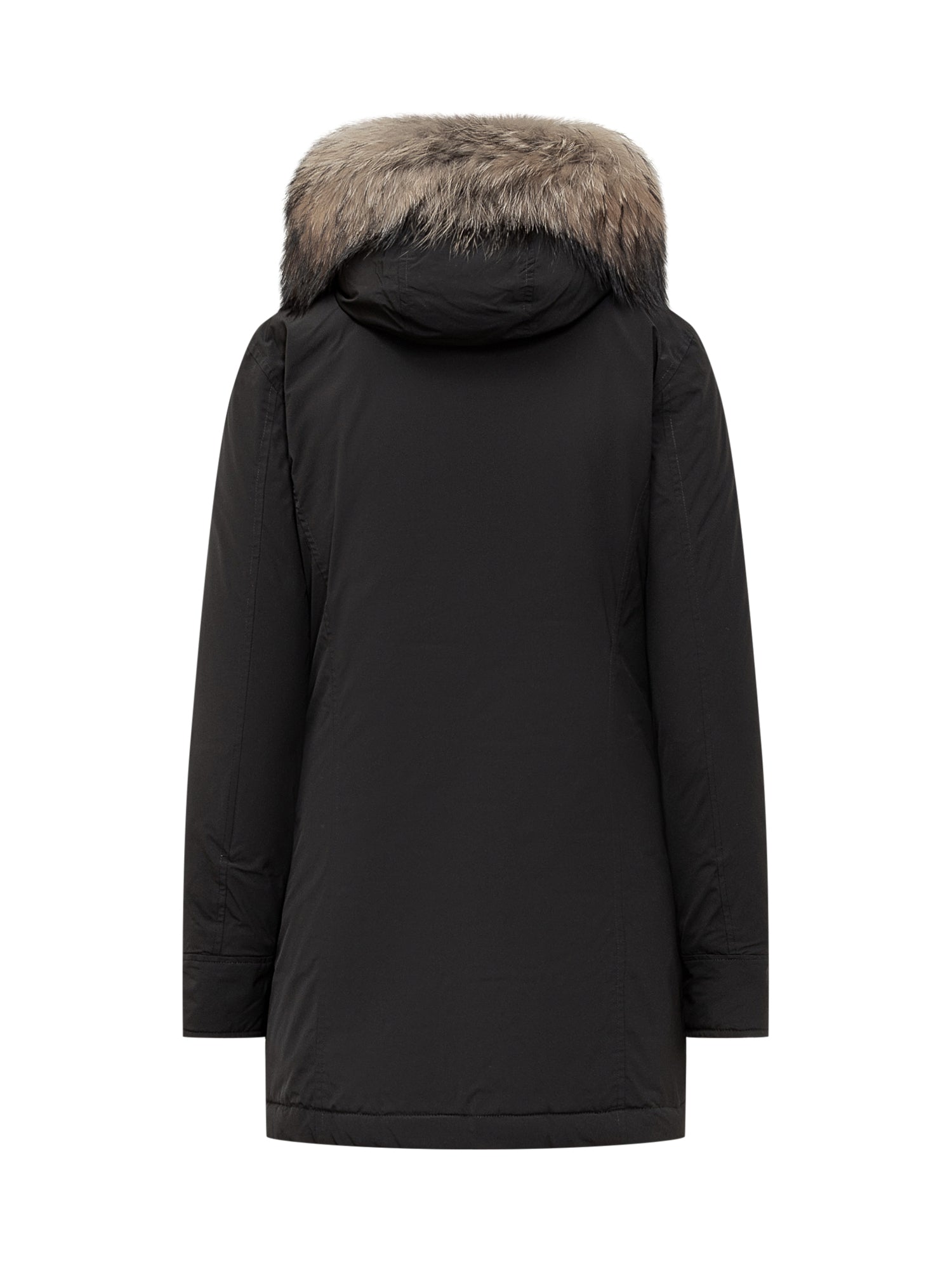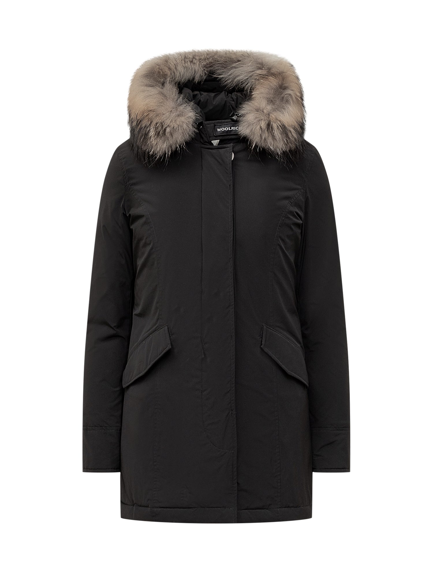Parka con cappuccio. Pelo di Murmasky. Chiusura con bottoni e zip. Due tasche.