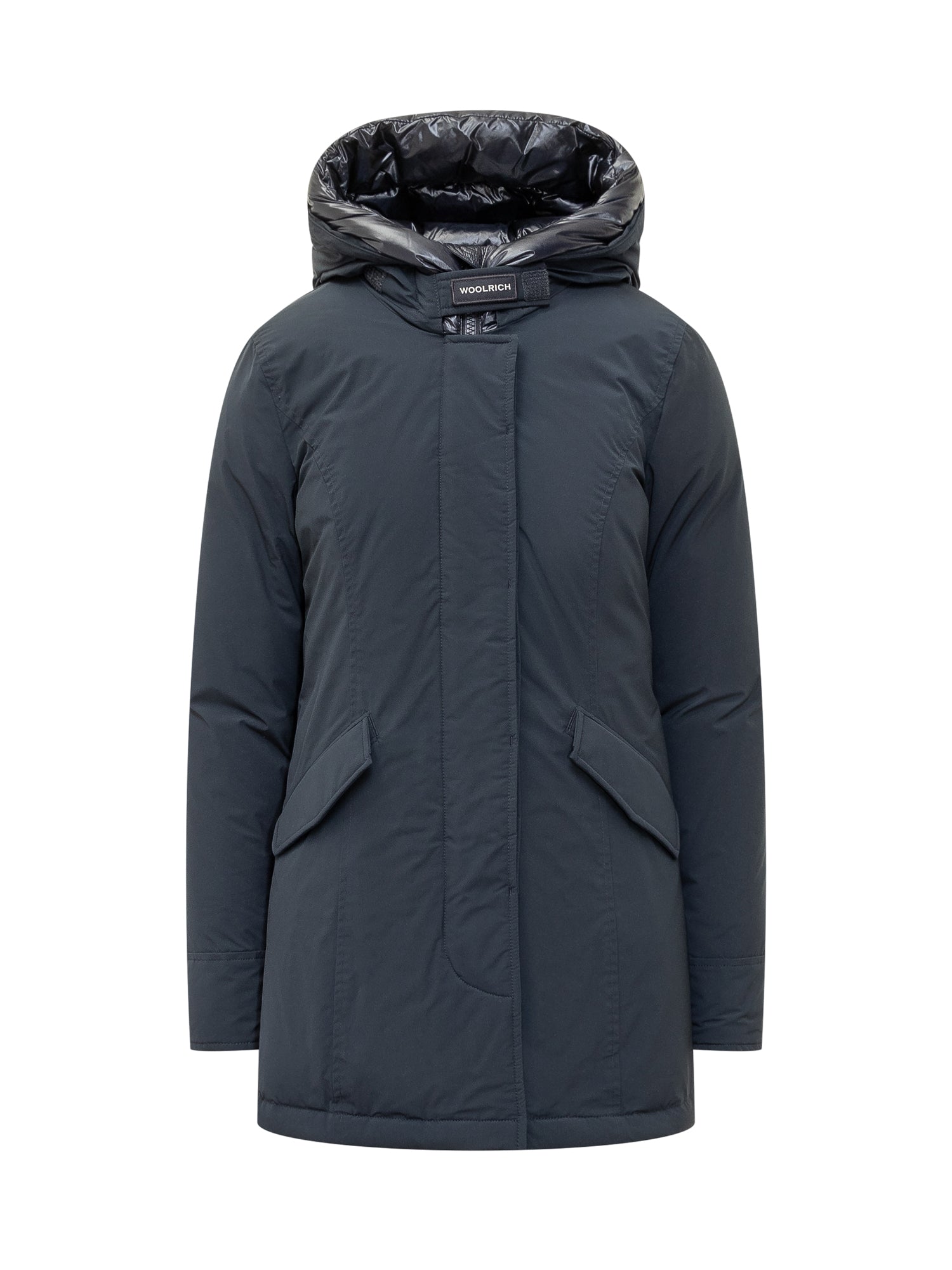 Parka blu con cappuccio. Tasche con patta. Chiusura con zip.