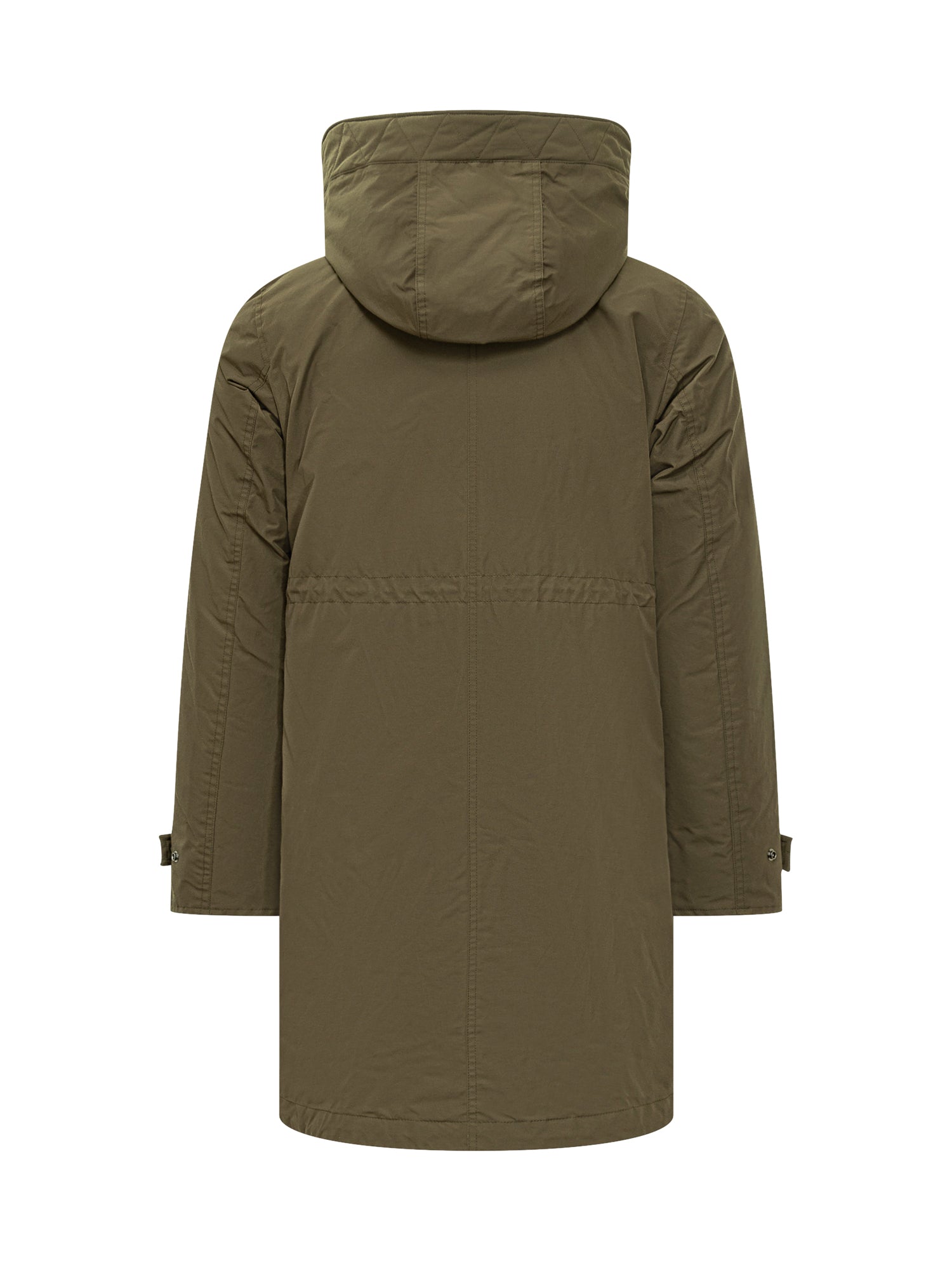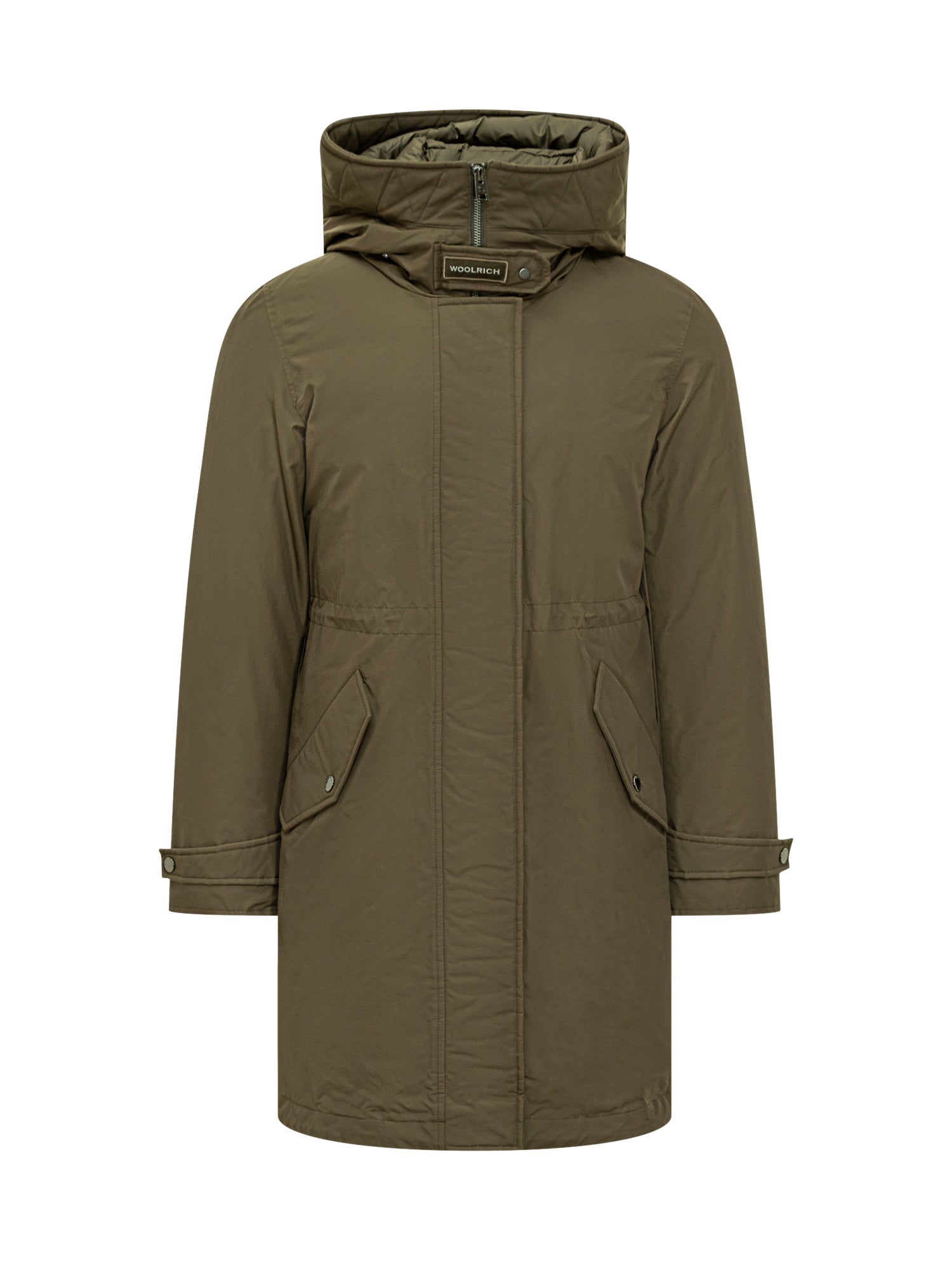 Parka lungo Woolrich con cappuccio imbottito, chiusura nascosta e tasche oblique con patta.