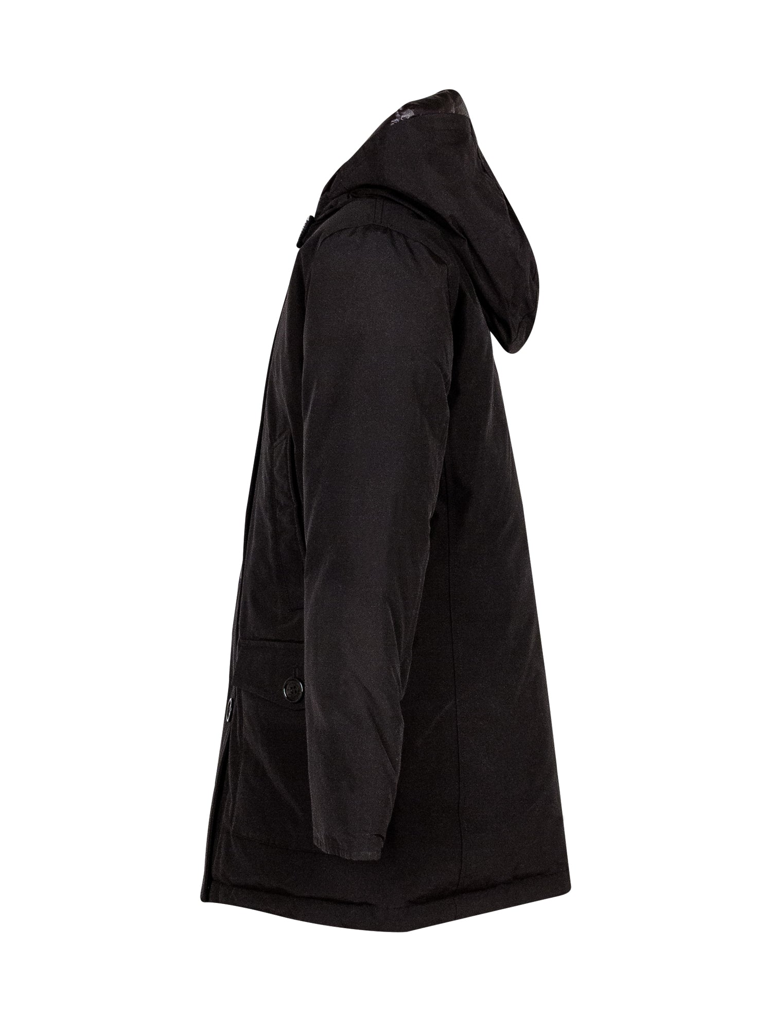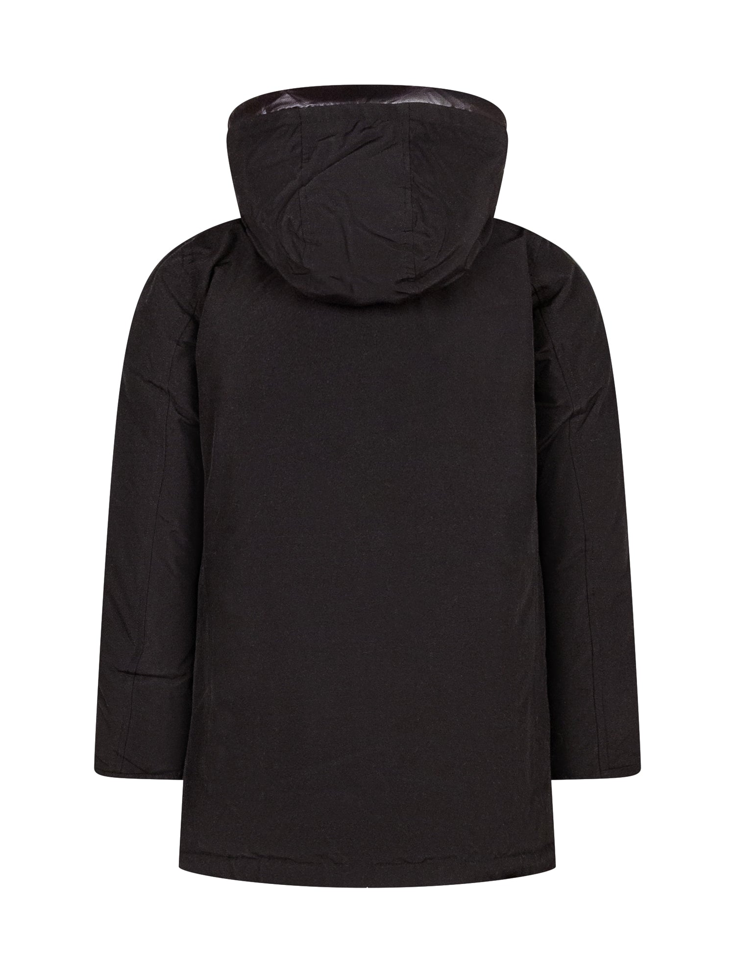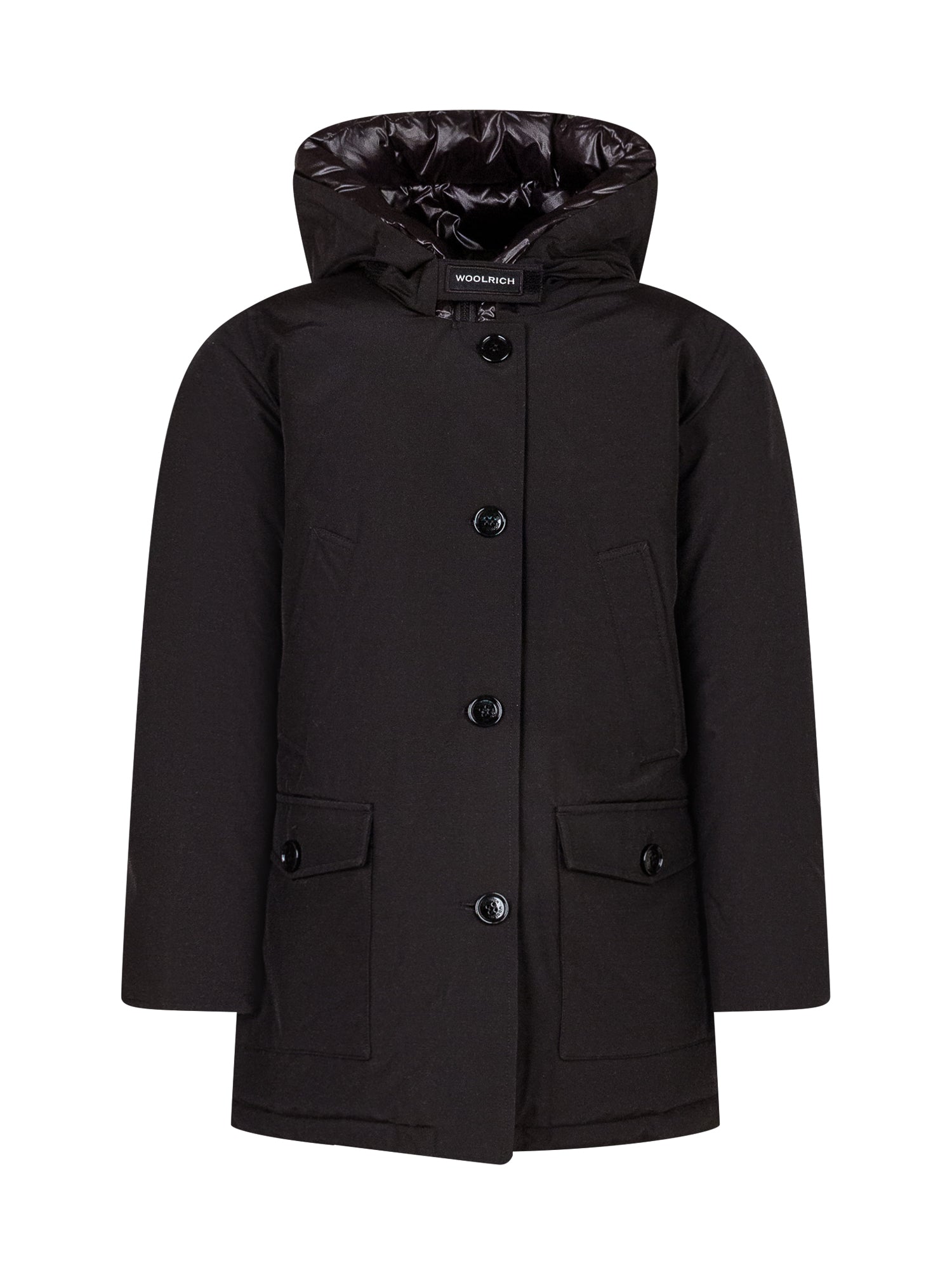 Parka Woolrich bambino in tessuto tecnico nero con cappuccio e chiusura a bottoni.