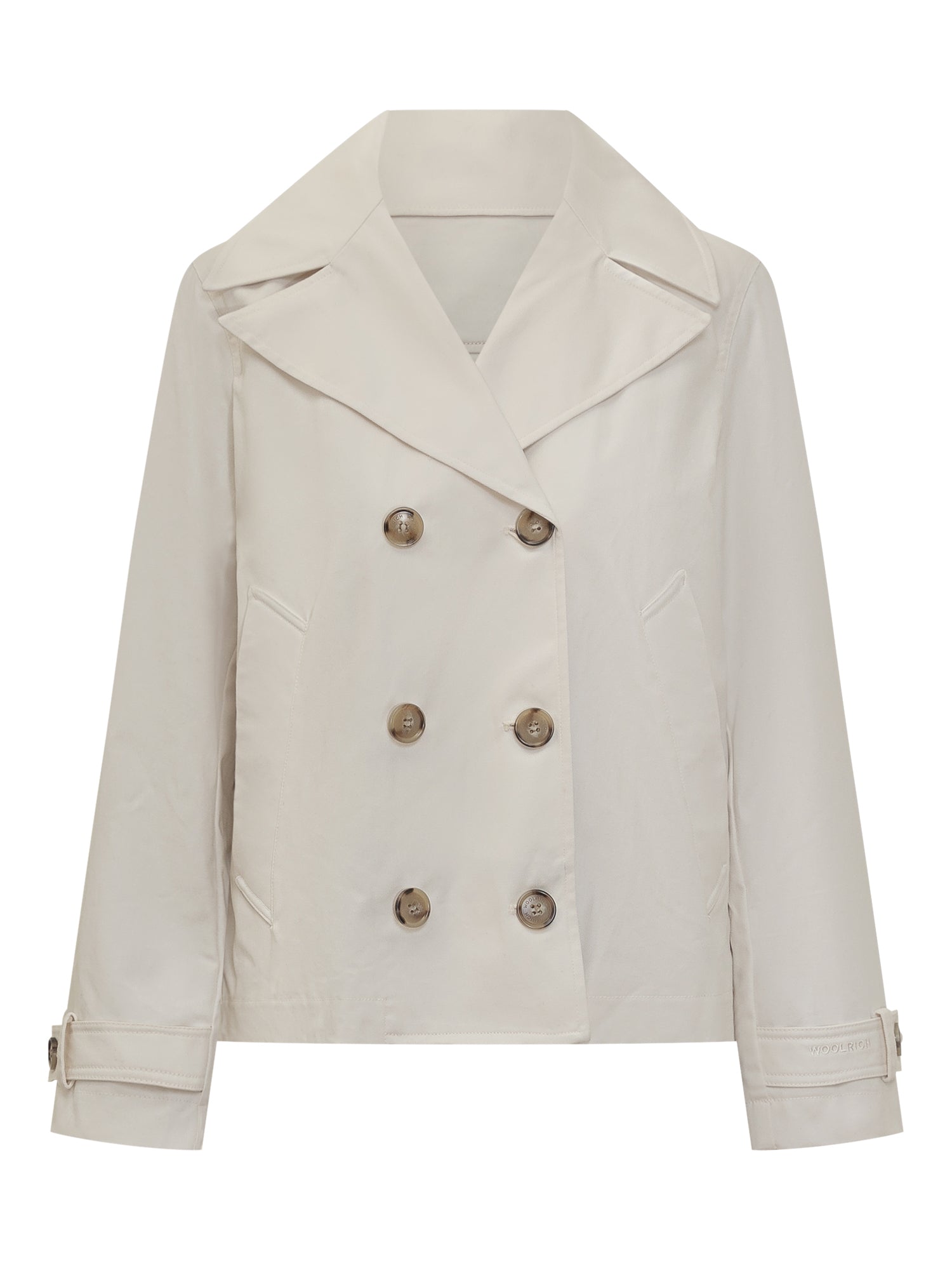 Realizzato in puro cotone. Tessuto idrorepellente. Fodera in misto cotone per il corpo e nylon per le maniche. Colletto con revers. Chiusura doppiopetto con bottoni. Tasche laterali a filetto. Polsini regolabili con linguetta e bottoni. Piega sul retro. Linguetta con logo ricamato.