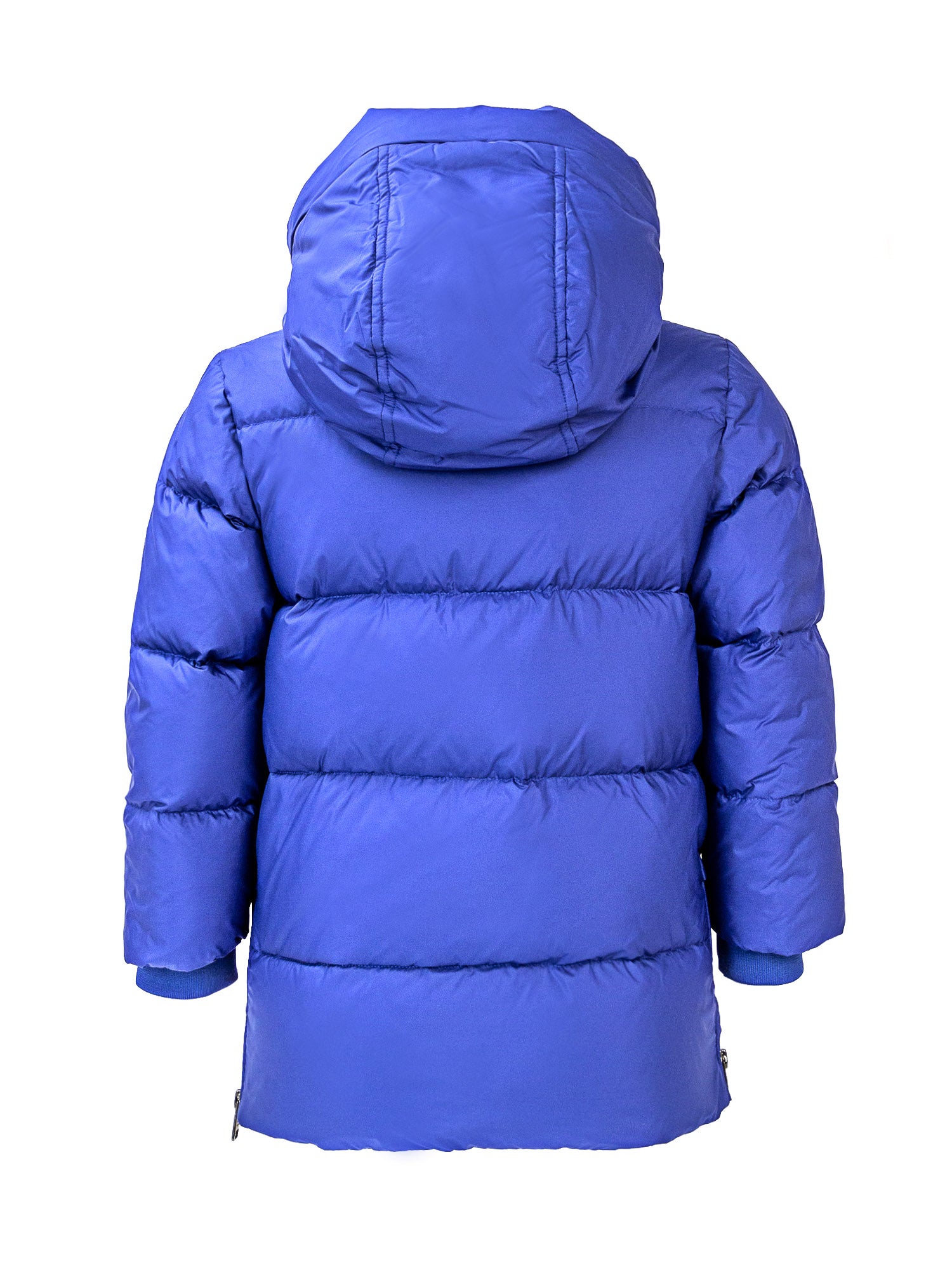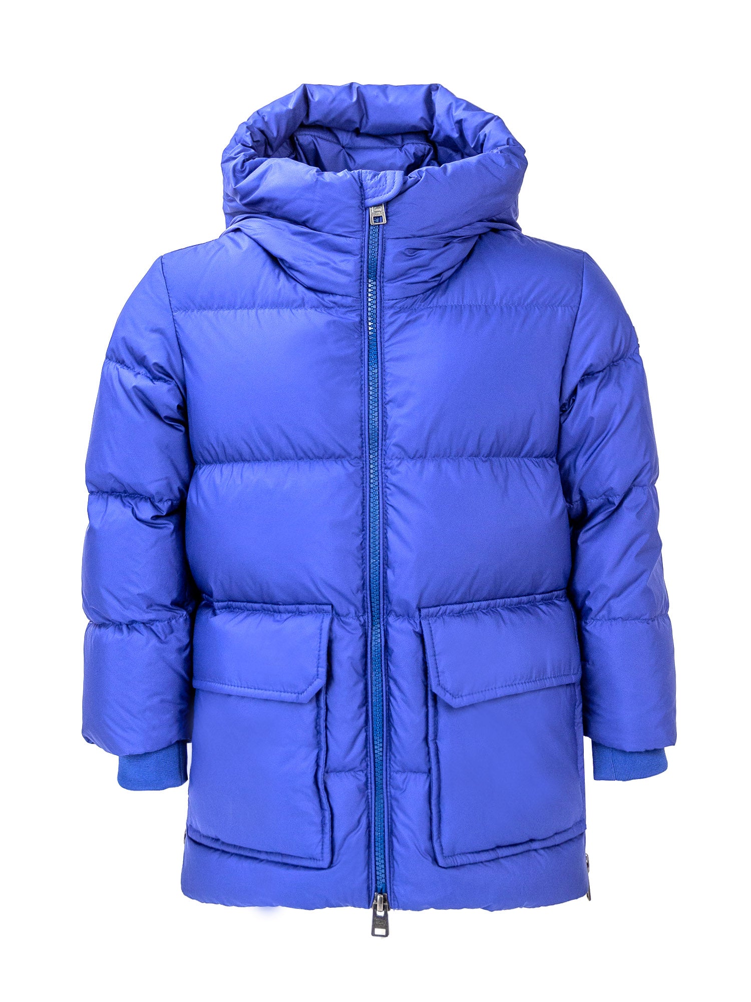 Piumino blu a maniche lunghe. Cappuccio. Polsi a costine. Tasche laterali con chiusura con patta. Due tasche interne con chiusura a strappo. Spacchi laterali con zip. Chiusura con zip sul davanti. Patch Logo sulla manica.