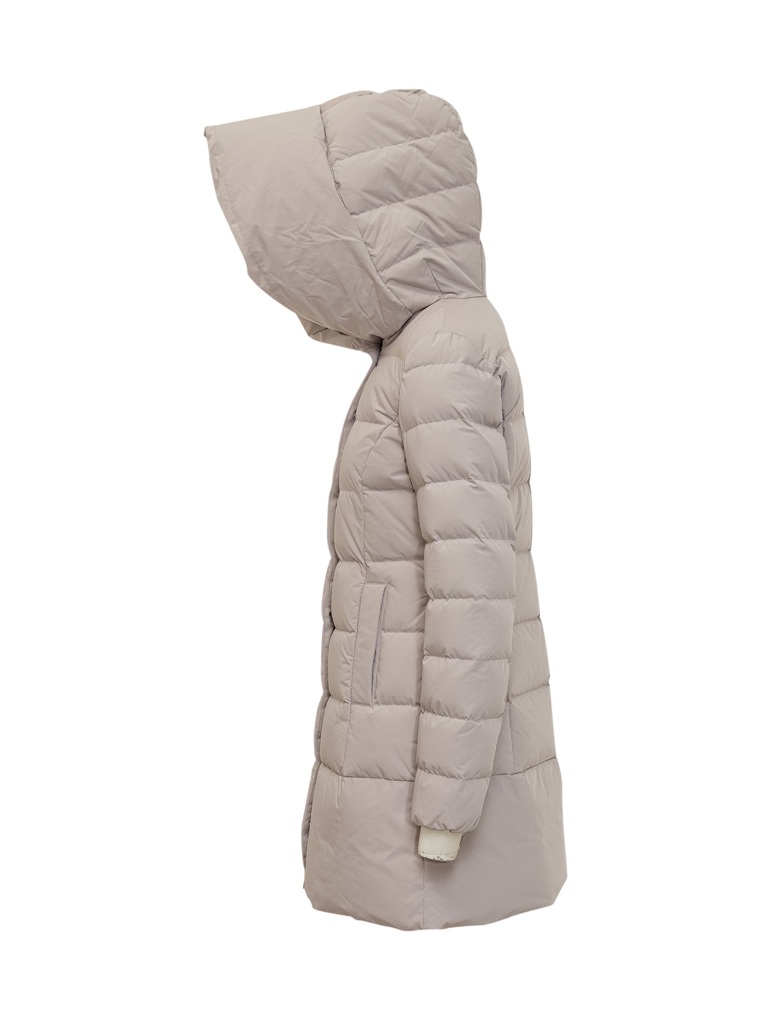Piumino grigio con cappuccio. Tasche con zip. Chiusura con zip e bottone.