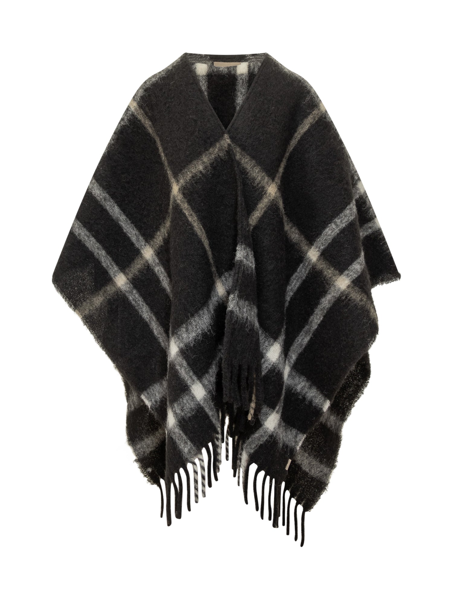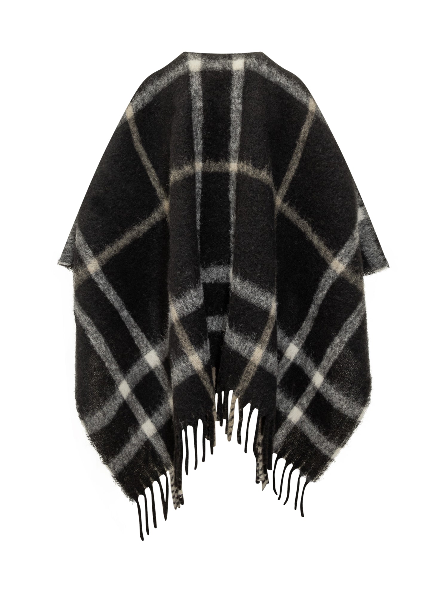 Cappa in alpaca Woolrich a quadri nei toni scuri con frange sul fondo. Un accessorio caldo e raffinato.