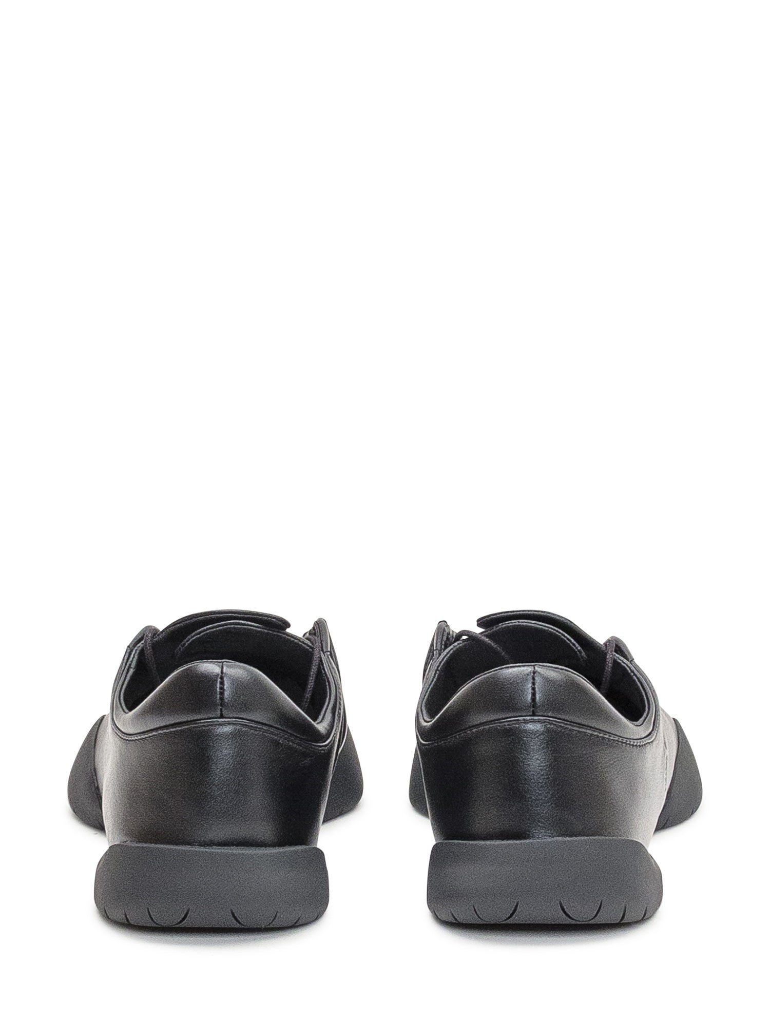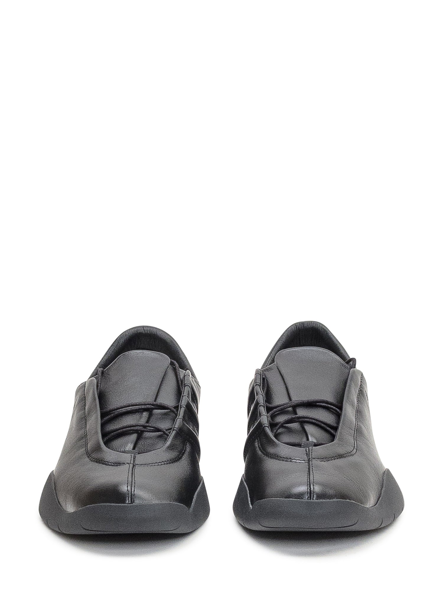 Sneakers Y-3 Toketa in pelle nera con suola ergonomica e logo Yohji Yamamoto laterale. Design minimal con lacci incrociati e silhouette affusolata.
